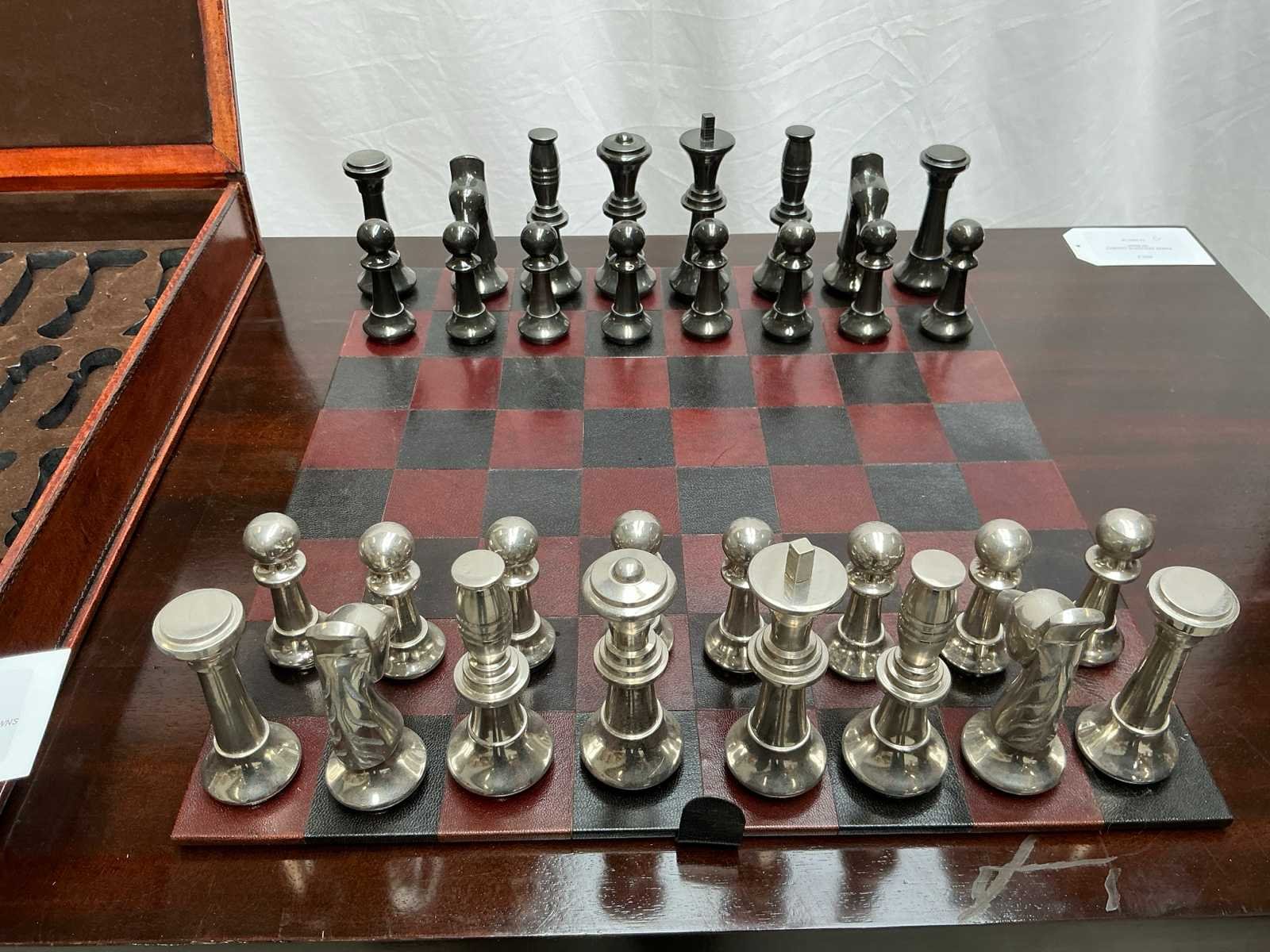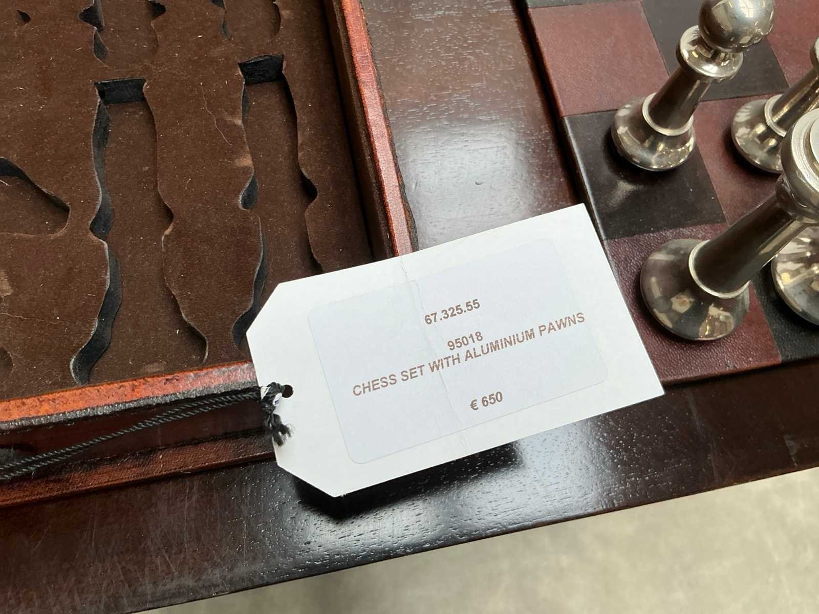 Materiaal: Hout, leer en aluminium schaakstukken Lengte: 40cm Breedte: 43cm Hoogte: 8cm