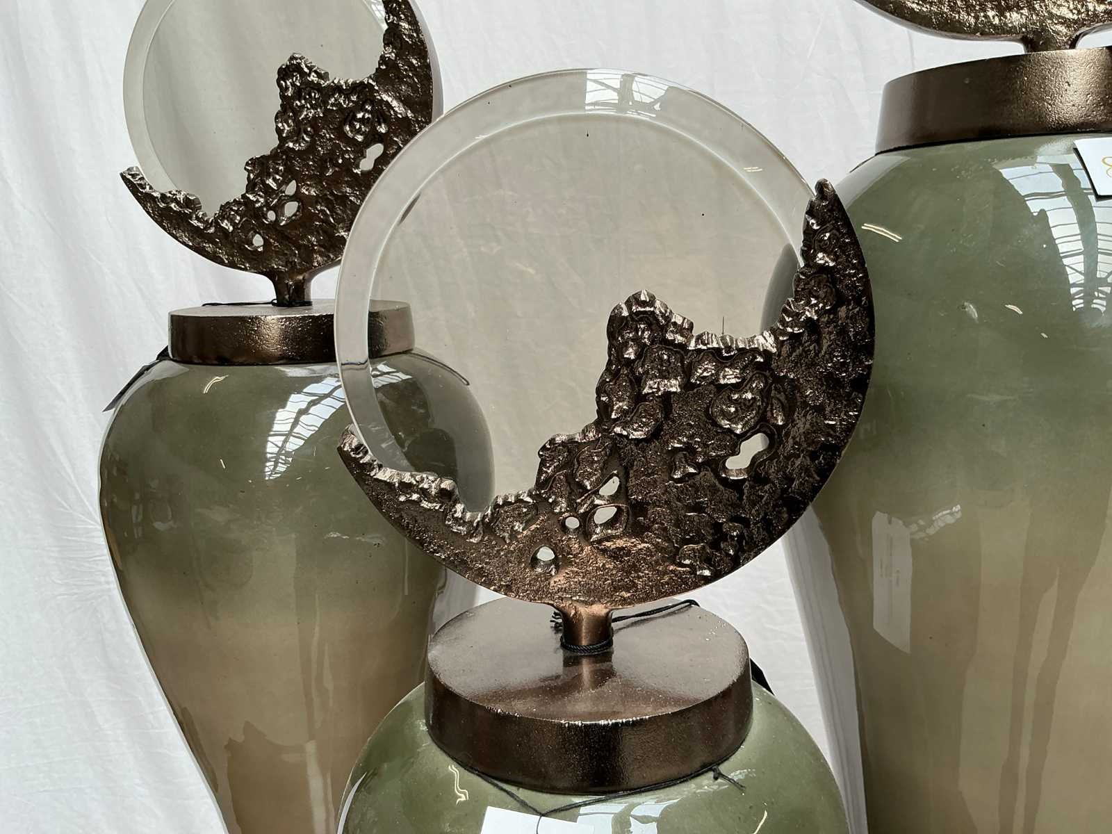 Afmetingen: D30xH110, D25xH75 en D20x90cm, glazen voet met aluminium ornament Materiaal: Aluminium / glas Model: SFD