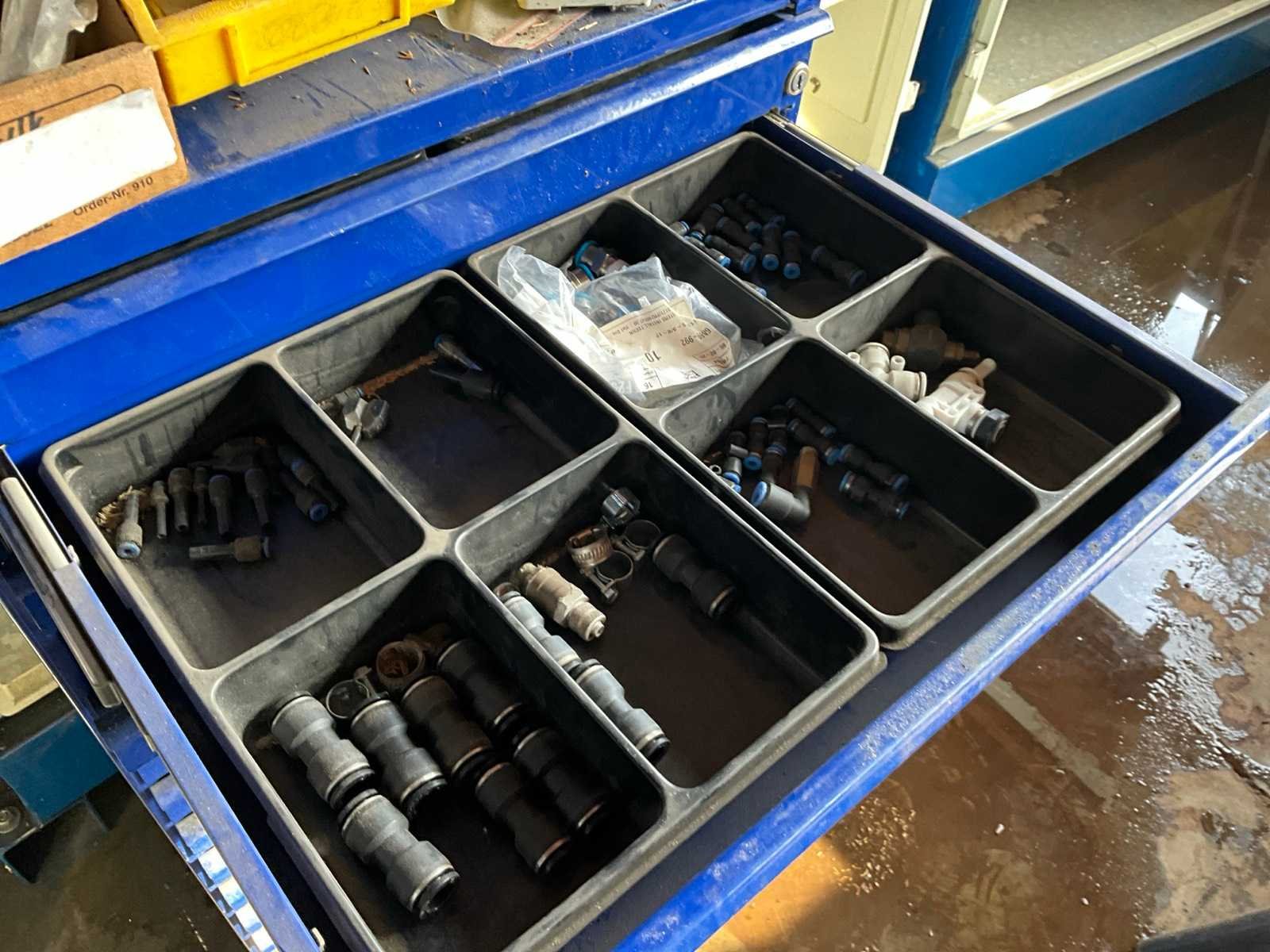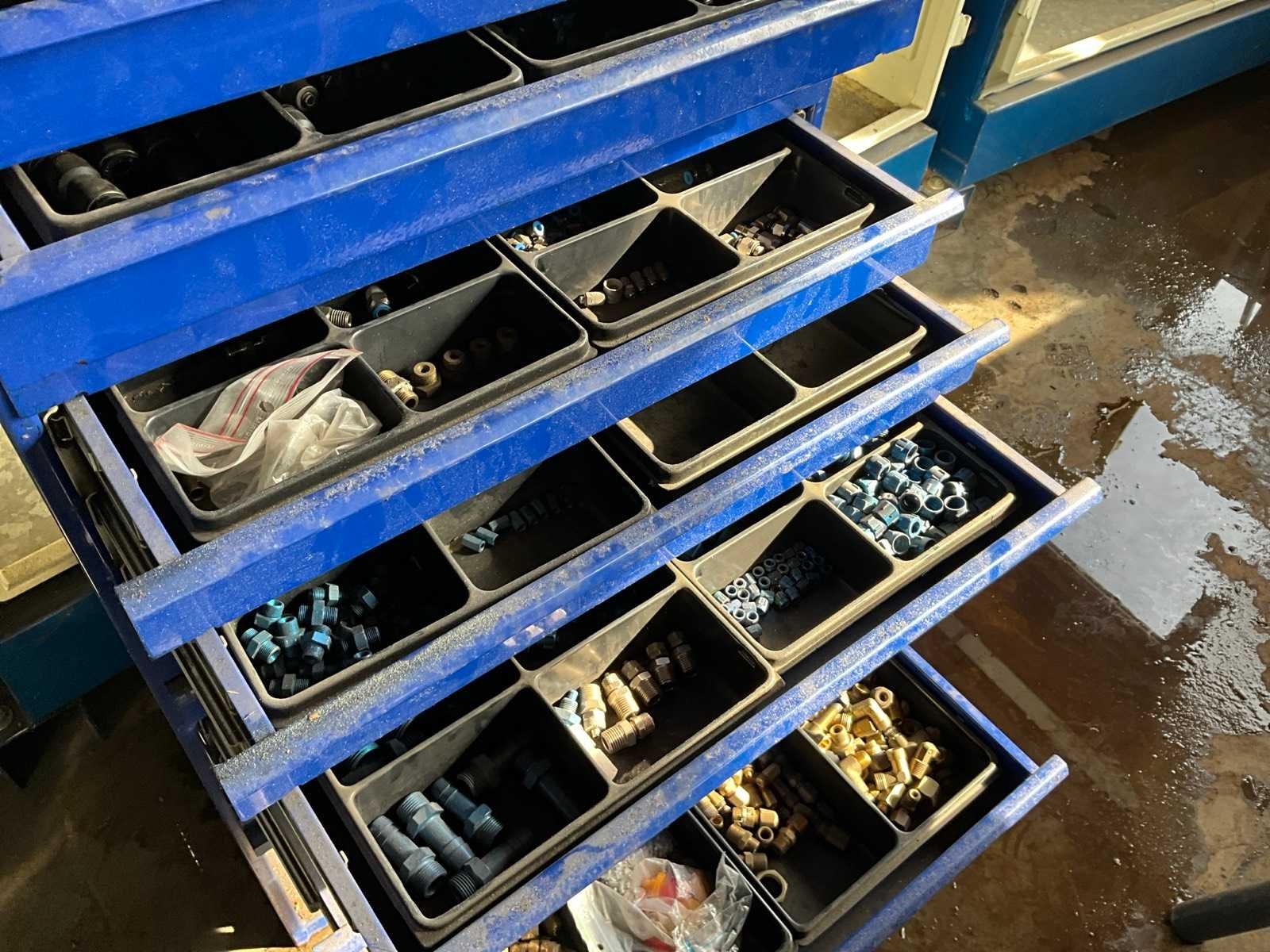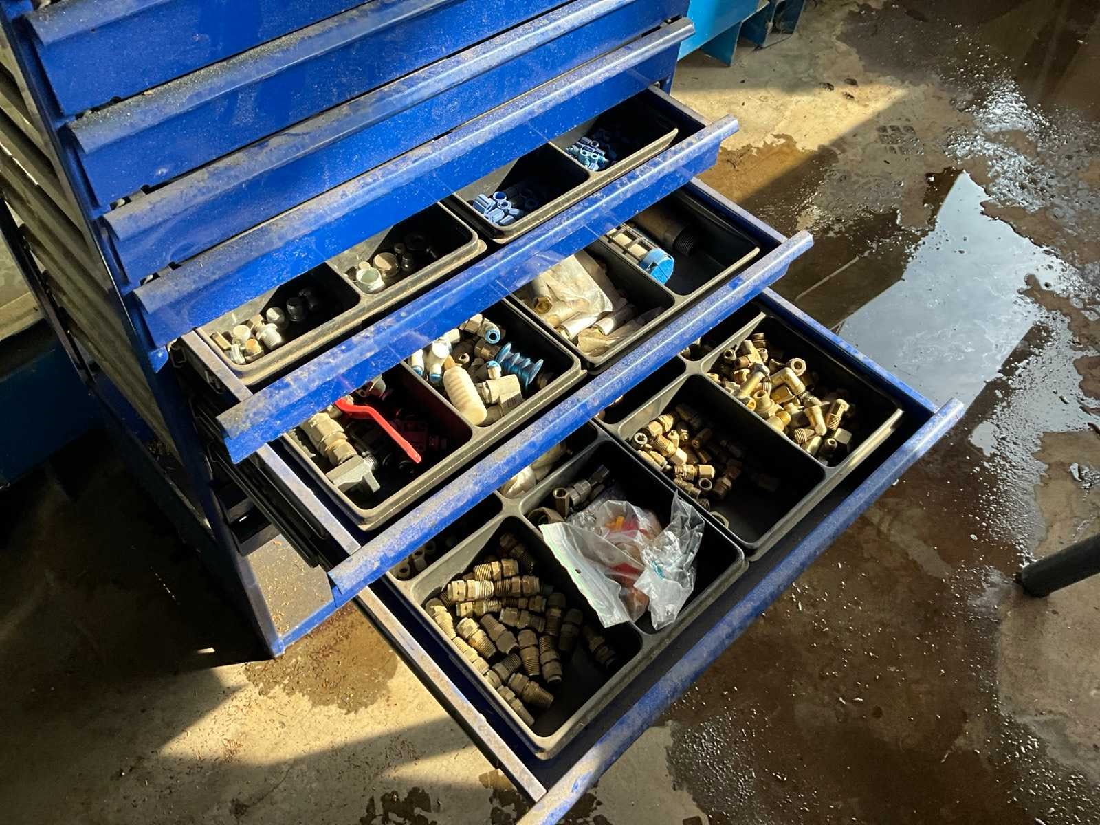 Blauwe stelling met lades 540x350x1750 mm, 2x archiefkast 1500x400x1660 mm