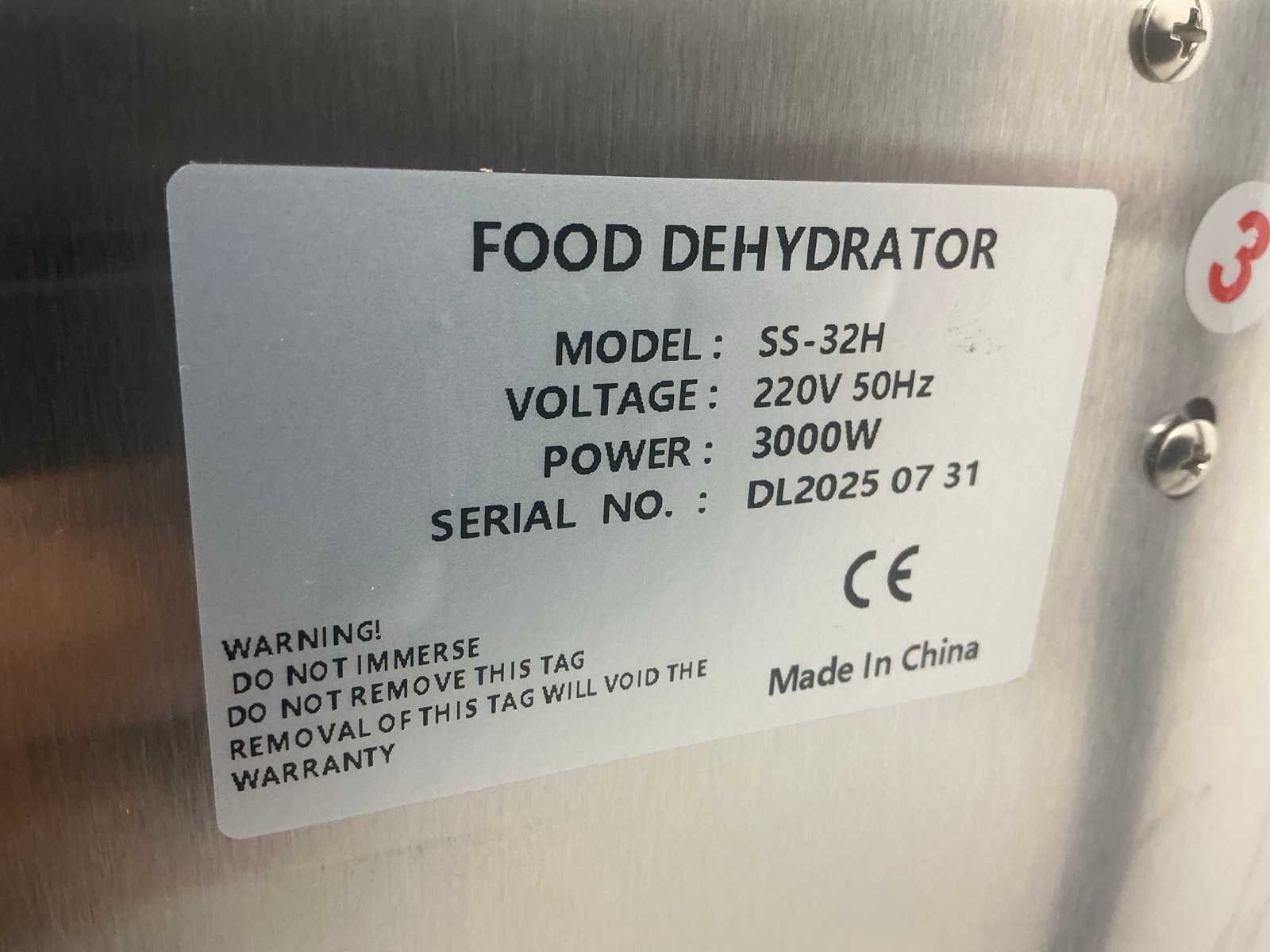 Voorzien van 32 layers 40x38cm; 3000W Merk: Food DEHYDRATOR Type: SS-32H Bouwjaar: 2025 Mobiel: true Serienummer: DL2025 07 31 Aansluiting: 230V Rvs: true Totale afmeting L: 46.8cm Totale afmeting Breedte: 57cm Totale afmeting Hoogte: 132cm