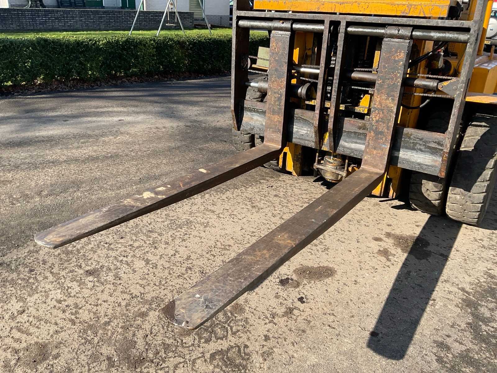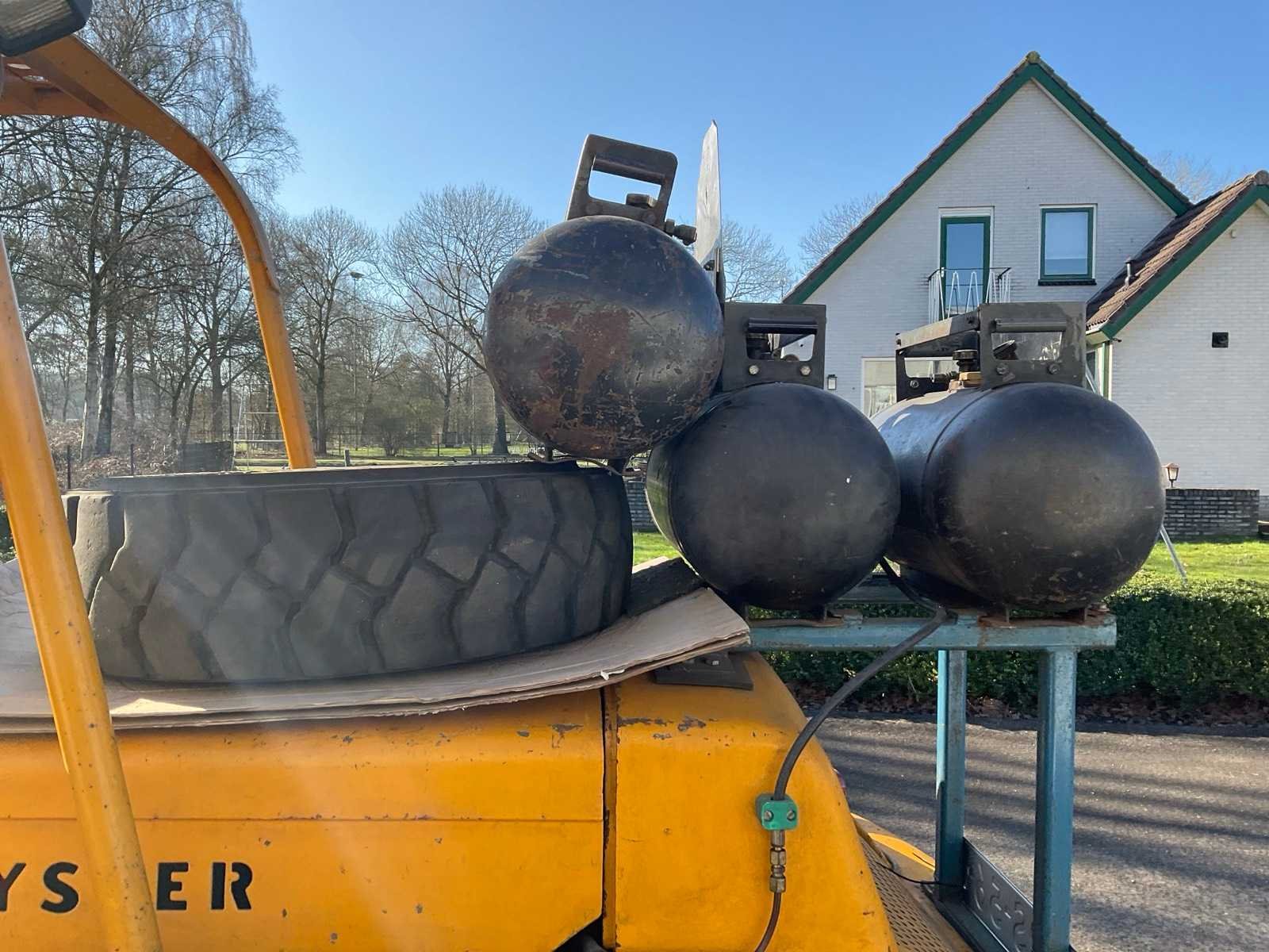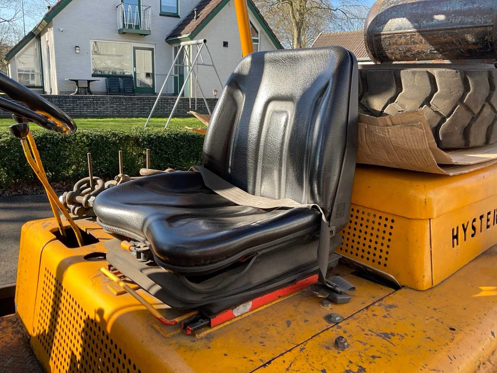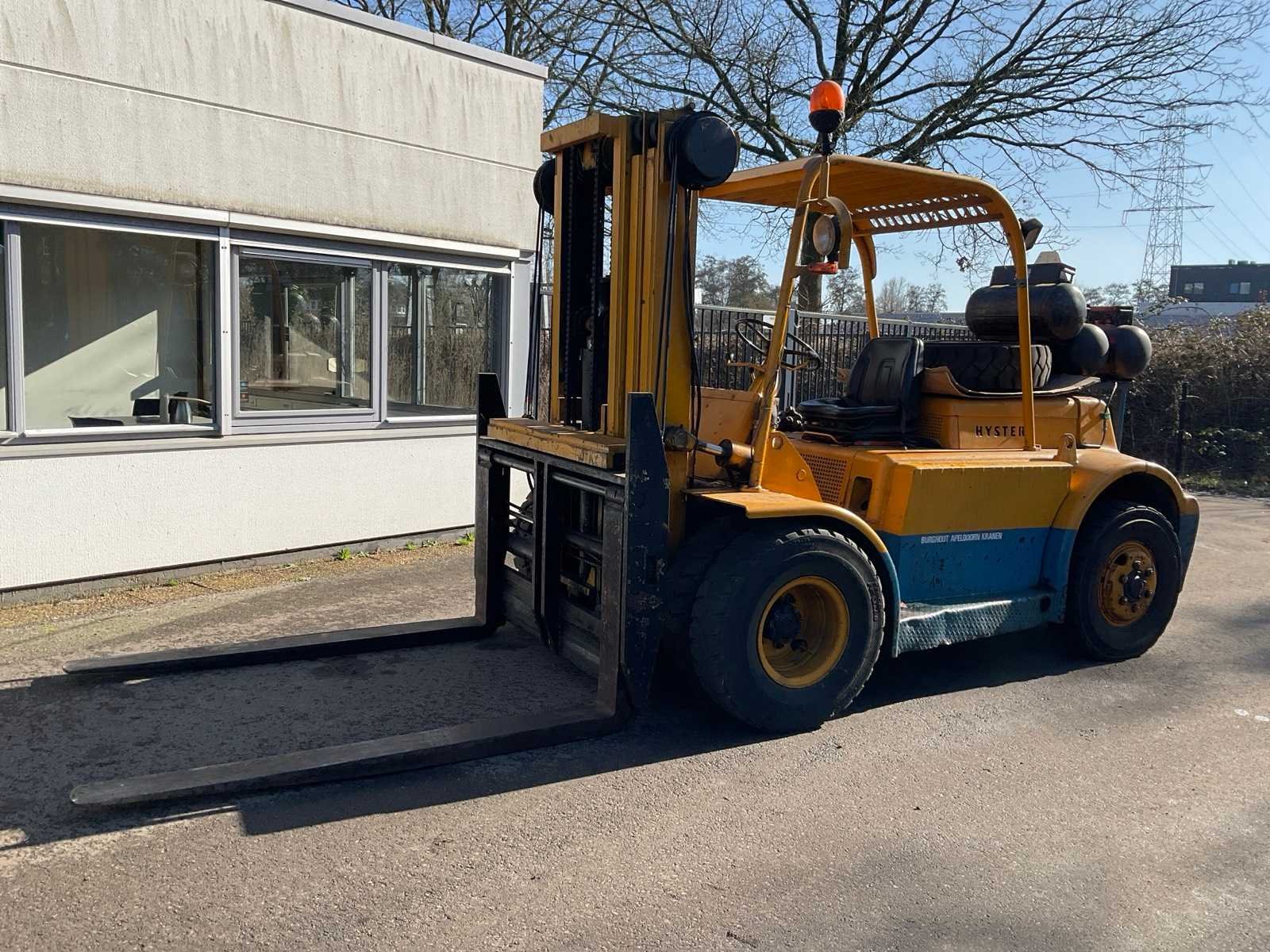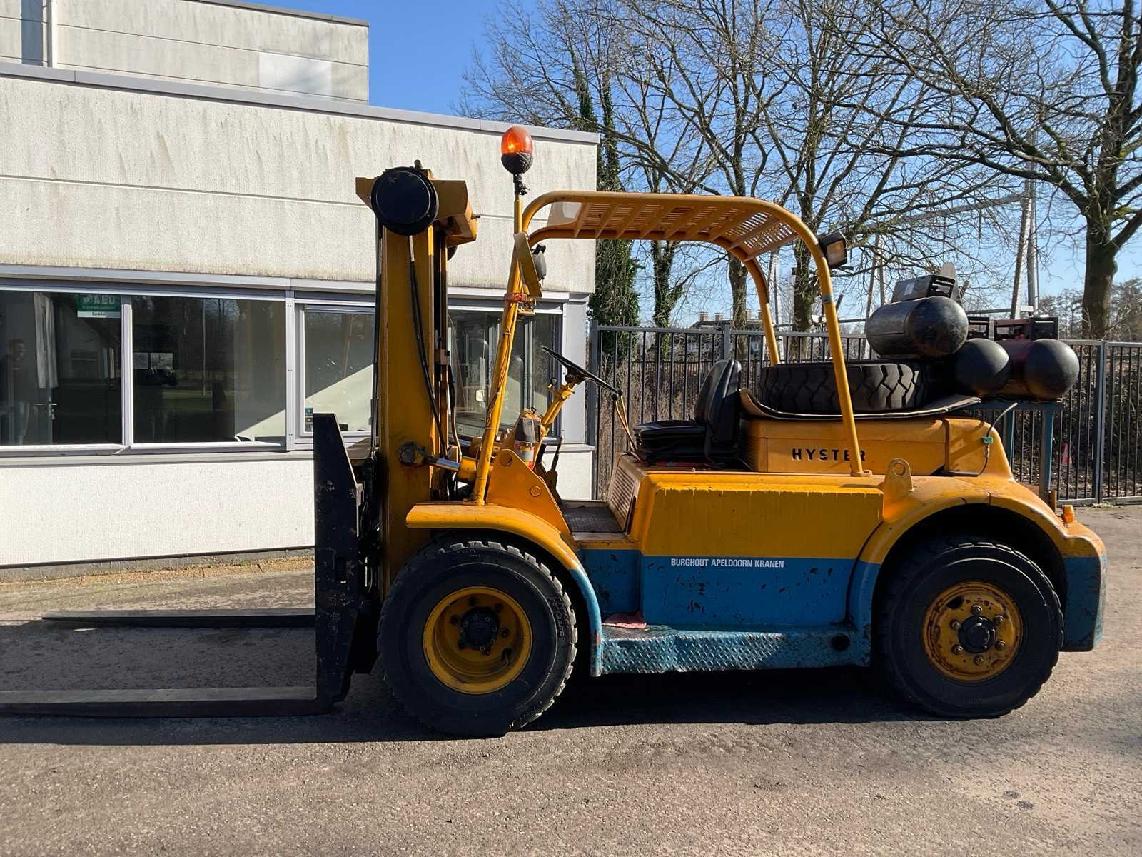 Lepelversteller. Inclusief 3x gastank en reservewiel Merk: Hyster Type: H100-CAF48 Bouwjaar: 1955 Brandstof: lpg Kenteken: TRS-56-L Mast: Triple Soort band: Volrubber banden Aantal wielen: 4 Afgelezen urenstand: 5099 Free-lift: true Side-shift: true Triple mast: true Hefvermogen: 10000kg Lepellengte: 1840mm Max. hefhoogte: 3750mm Minimale doorrijhoogte: 2500mm Totale afmeting L: 5650mm Totale afmeting Breedte: 2100mm Totale afmeting Hoogte: 2500mm LPG: true