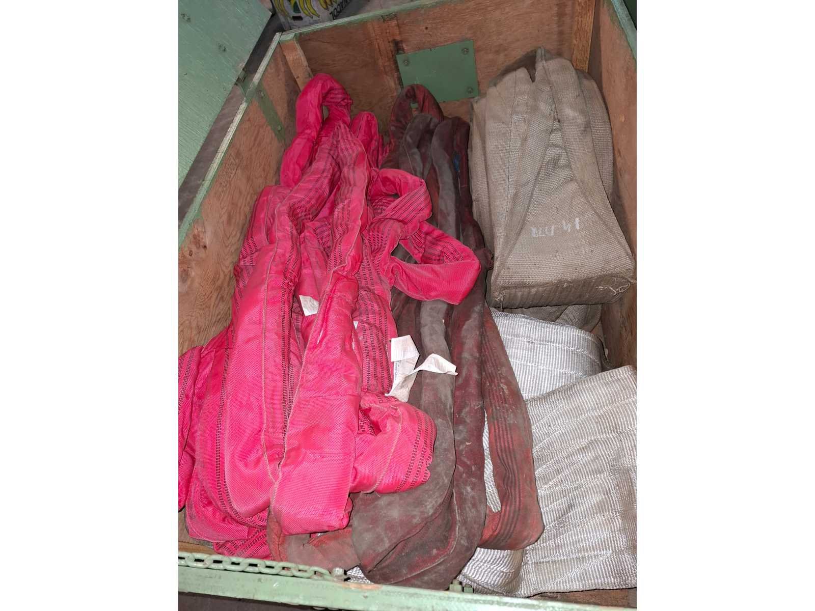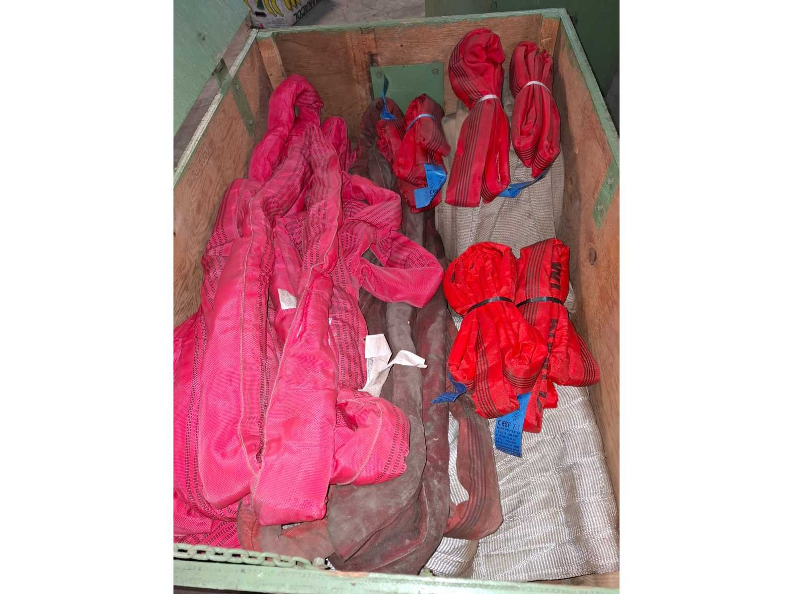 2x botenband L 8m 7.5t, 2x botenband L 14m 7.5t, 6x rond L 2.5m 5t, 2x rond L 1.5m 5t, 4x rond L 1m 5t. Inclusief houten kist. Totale afmeting L: 1200mm Totale afmeting Breedte: 800mm Totale afmeting Hoogte: 700mm