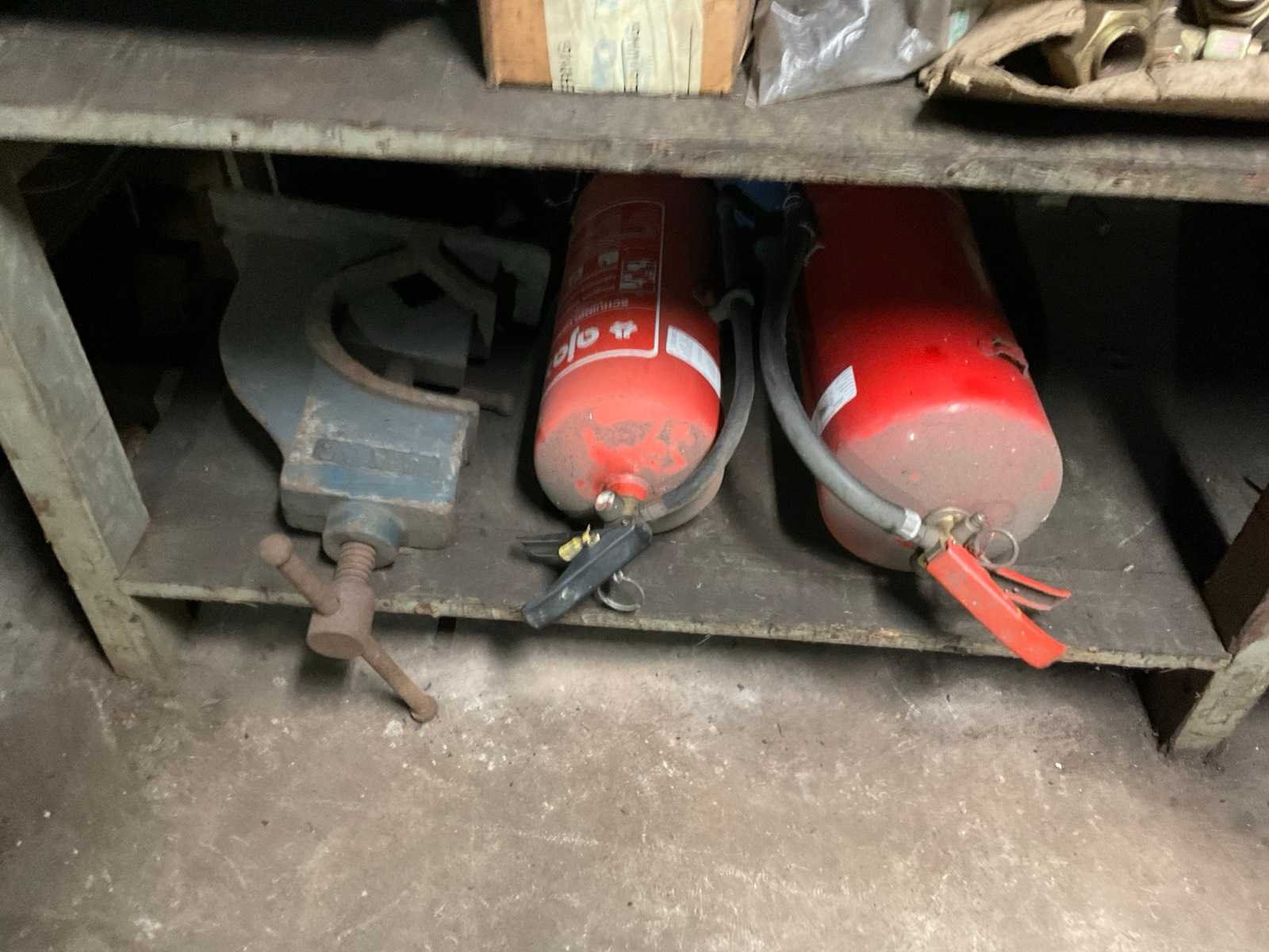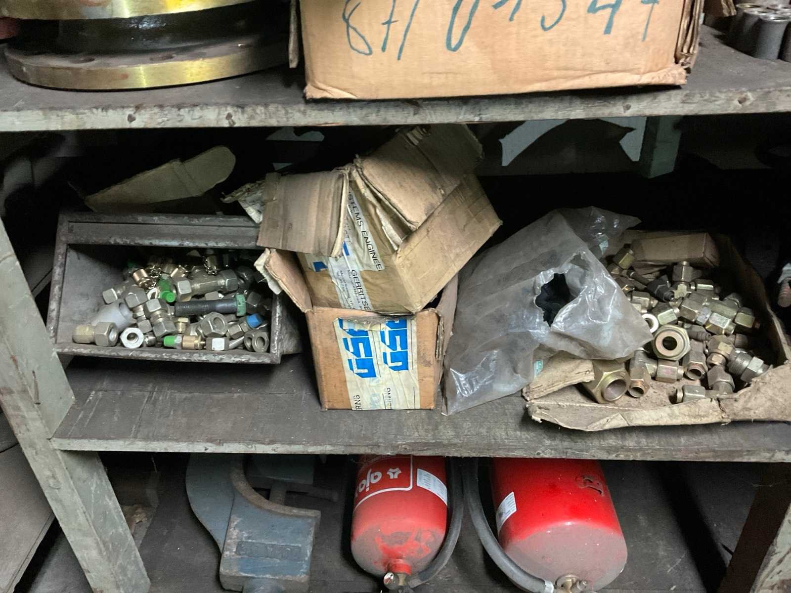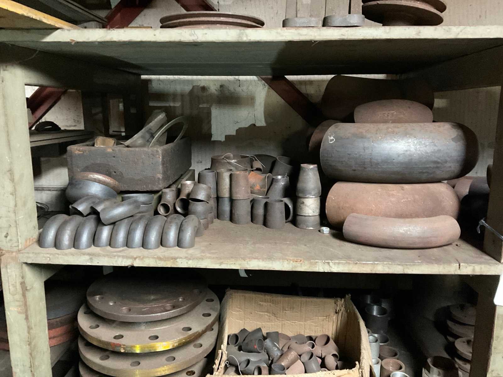 Waaronder diverse lasbochten, poelies, buisklem, Straub pijpkoppelingen, etc. In en inclusief houten legbord stelling afmeting lxbxh 196x80x180cm.
