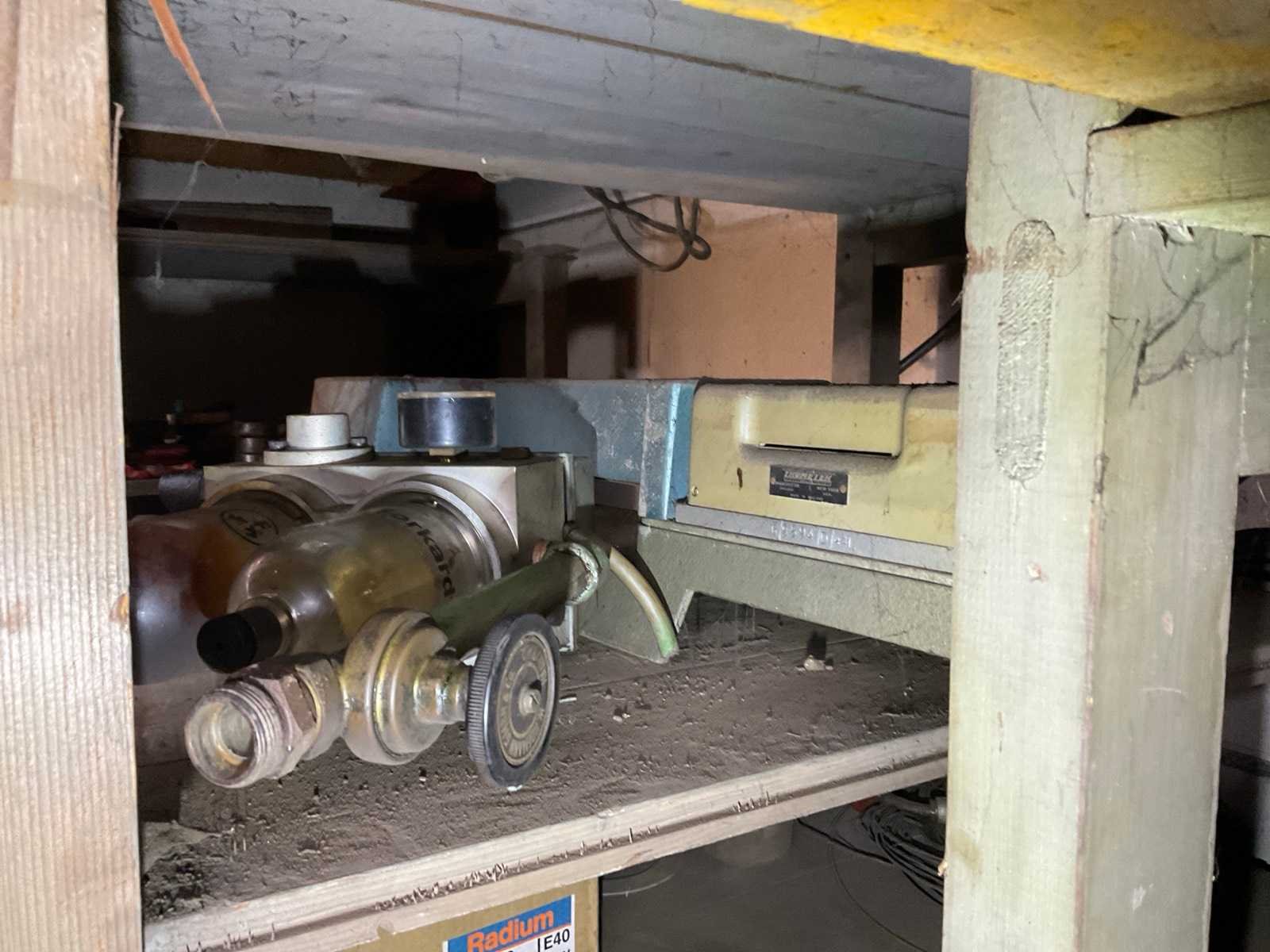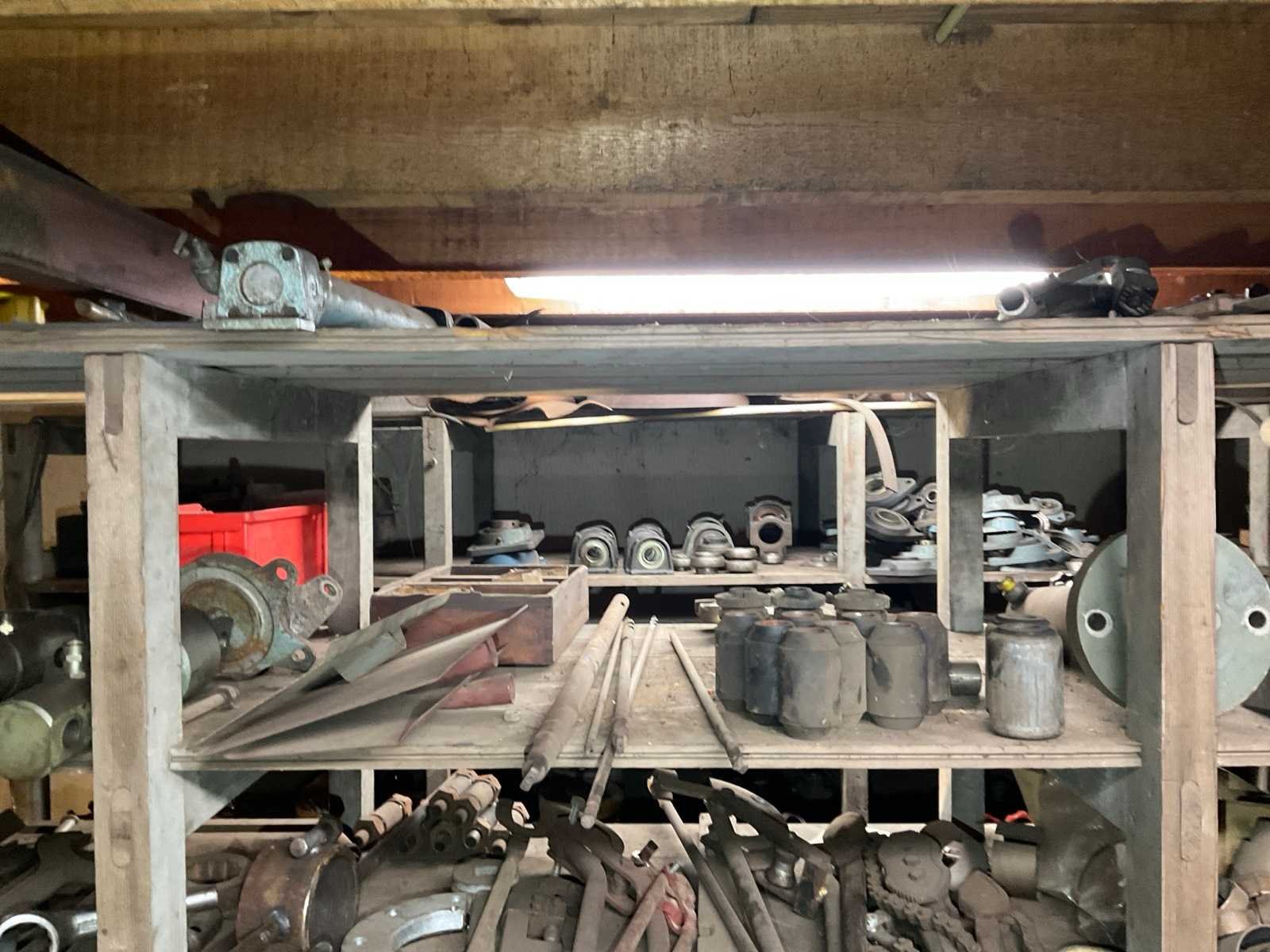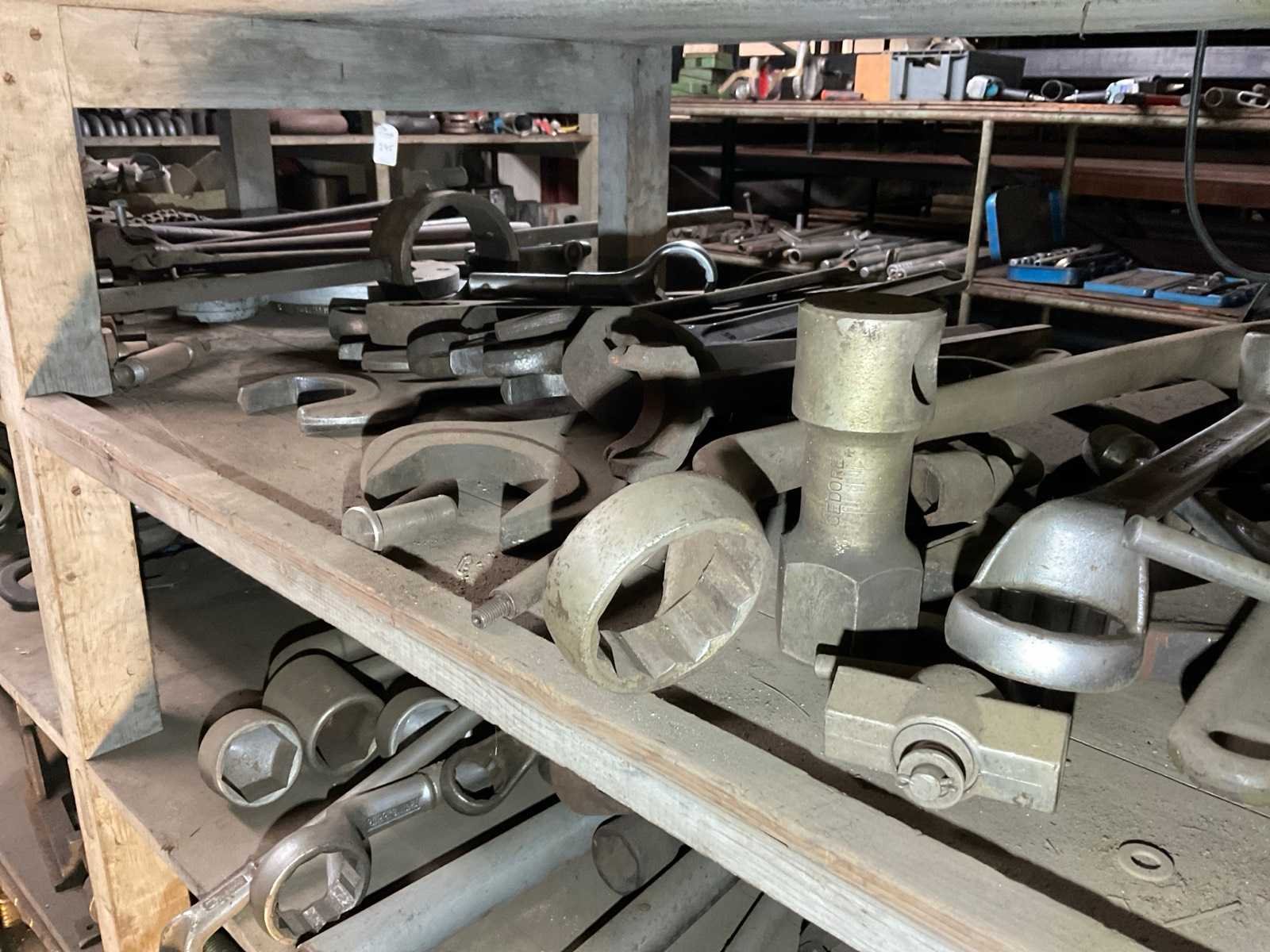 Waaronder spanijzers, speciaal gereedschap, ruimers, hydraulische cilinders, gereedschapskisten, bankschroef, hydrauliek pompen, etc. In en inclusief houten legbordstelling afmeting lxbxh circa 400x75x199cm