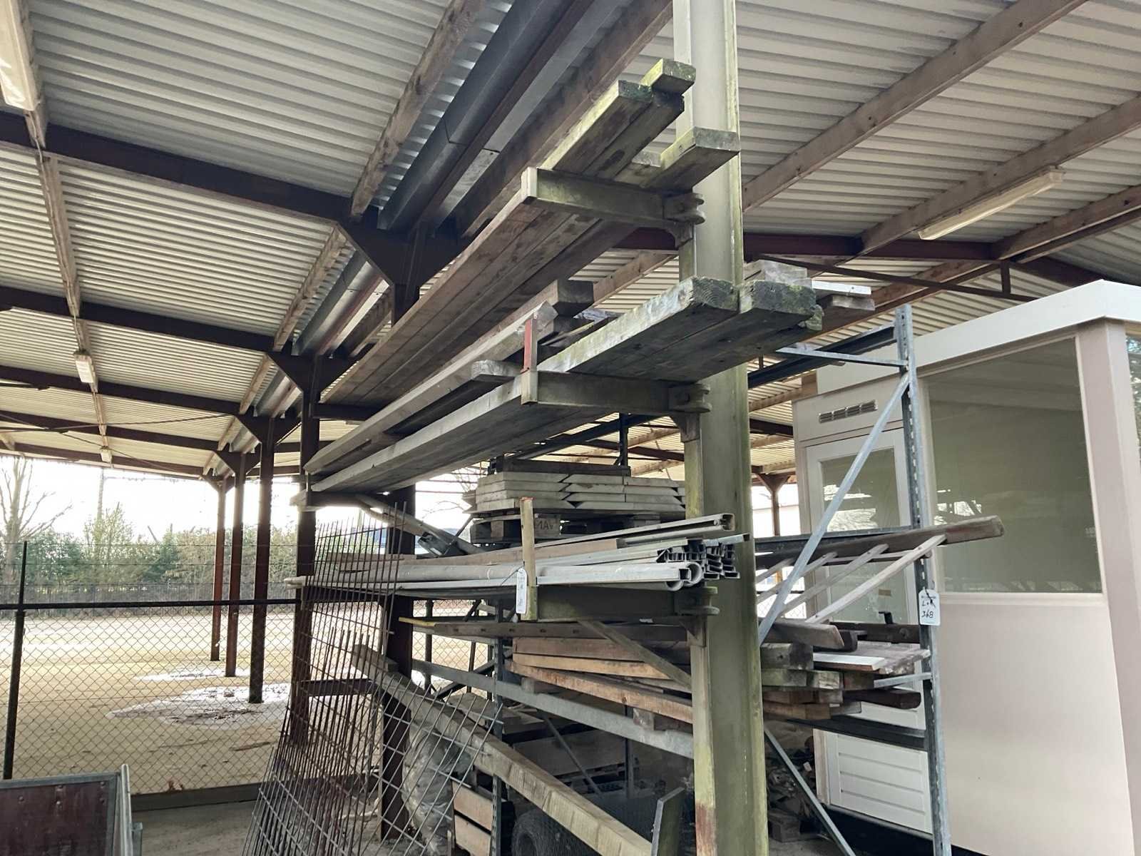 Waaronder houten balken, stalen buizen. In en inclusief magazijnstelling 450x80x260cm en draagarmen links. De draagarmen dienen gedemonteerd te worden, staanders niet inbegrepen.