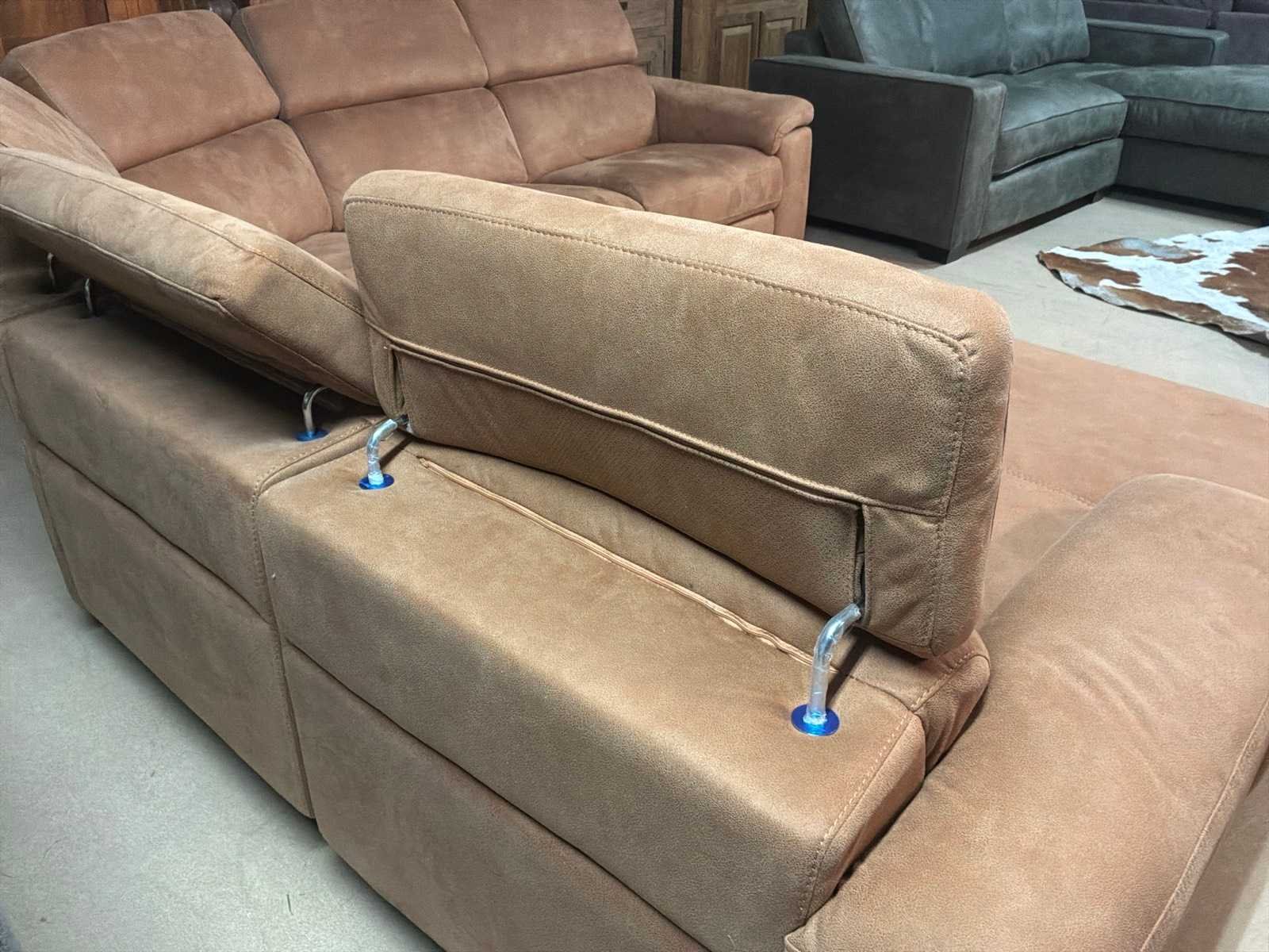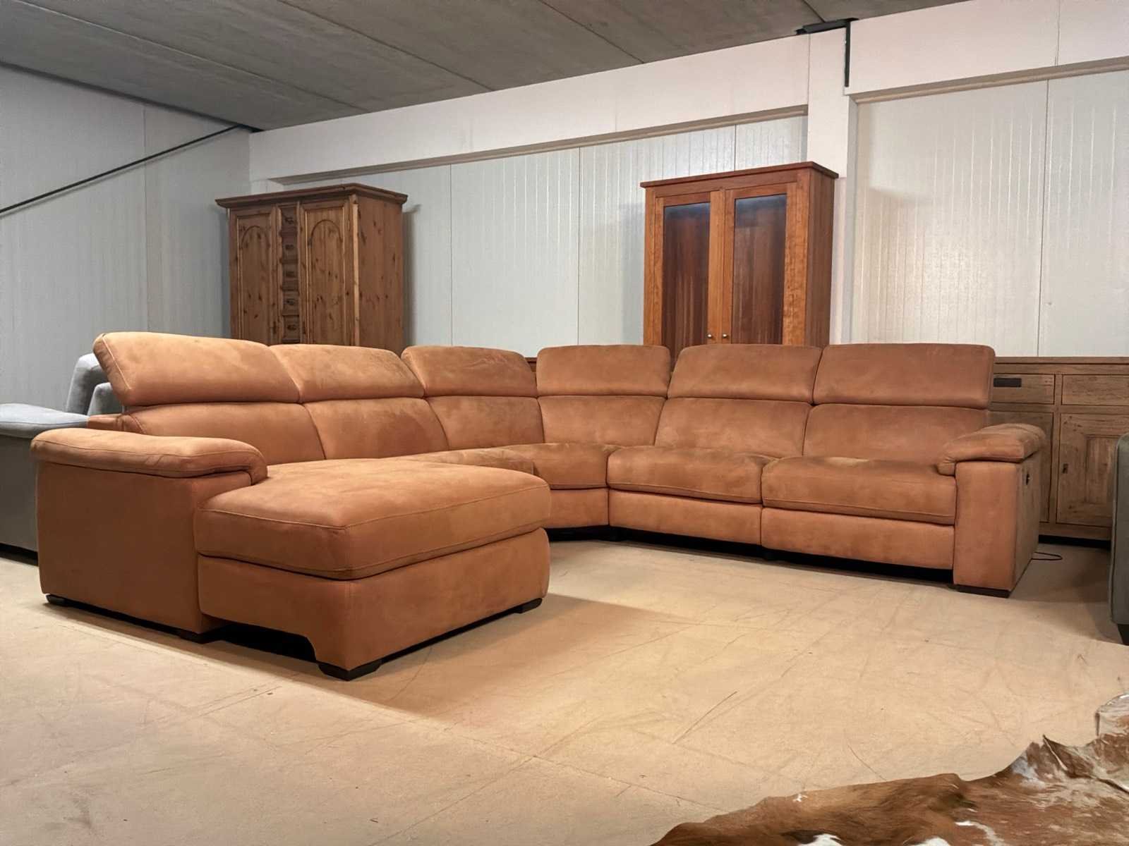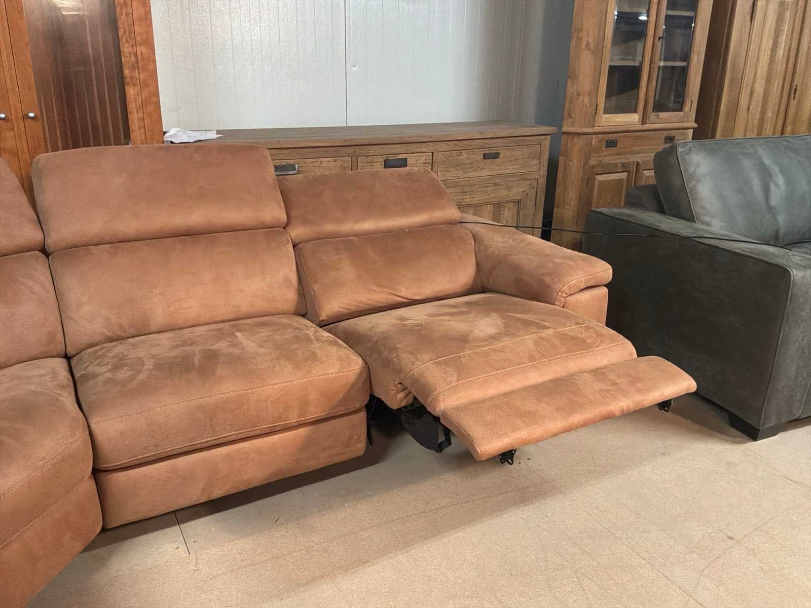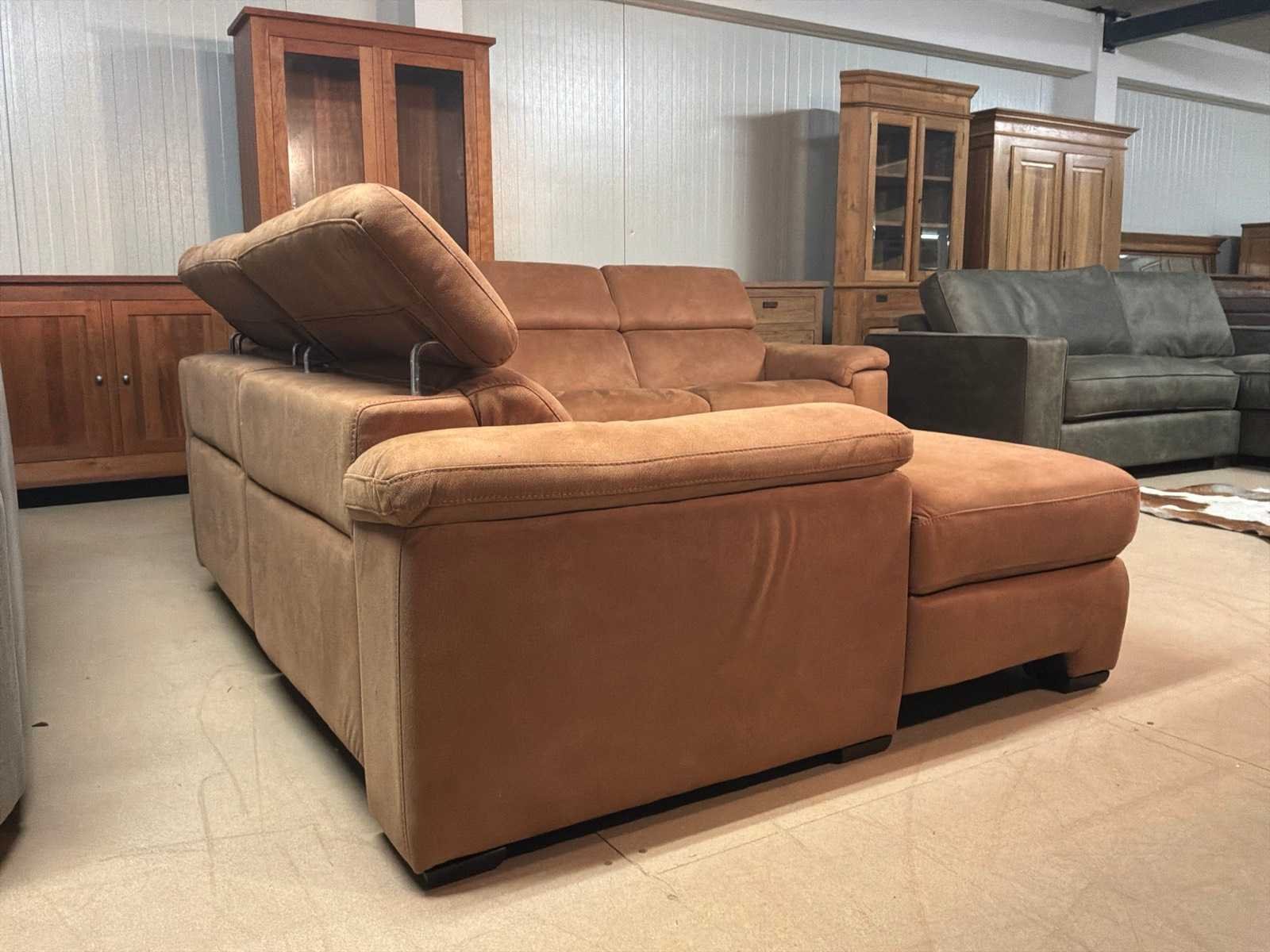 Bankstel bestaat uit 4-delen. Bankstel beschikt over verstelbare hoofdsteun over de gehele bank. Model: Libre Kleur: Cognac Lengte: 285cm Breedte: 285cm Hoogte: 77cm Zithoogte: 42cm Diepte: 52cm Materiaal: Geborsteld leer