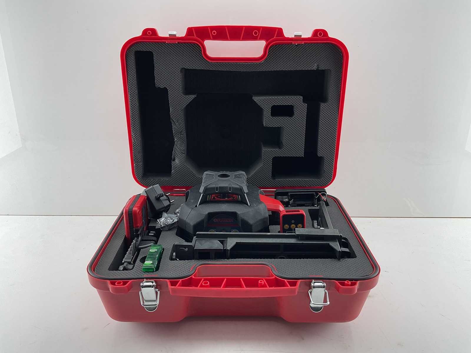 Uiterst precieze motor nivellering. Nauwkeurigheid 1mm/10m. Reikwijdte ontvanger ±400m radius. Afstandsbediening 360° rond. Regenbestendig en uiterst zichtbaar. Merk: Futech Type: Gyro Red rotatielaser Met koffer: true