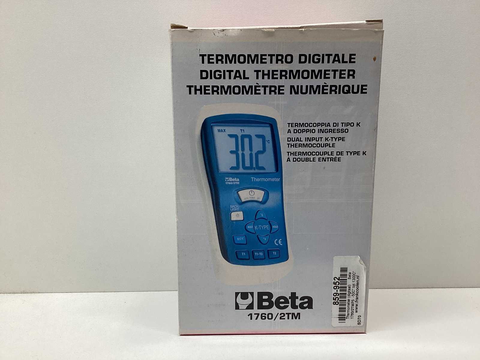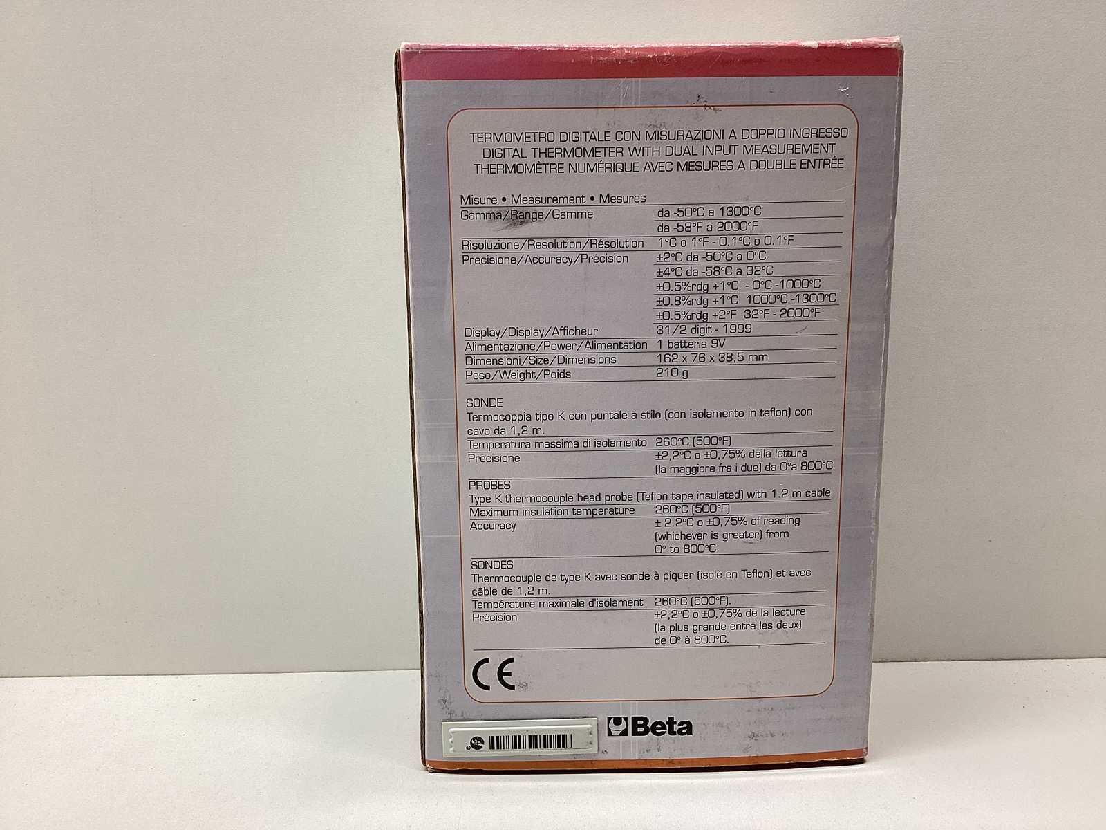 Dit is een twee-weg, type-K thermokoppel thermometer met verlicht LCD-display (42 mm) en functie-indicator. Het meet temperaturen in °C of °F met een bereik van -50°C tot 1300°C (-58°F tot -2372°F). De resolutie is 1°C/1°F of 0,1°C/0,1°F en de nauwkeurigheid bedraagt 0,5% van de maximale waarde. De thermometer wordt geleverd met twee K-type thermokoppelsensoren, een opbergdoos, een 9V-batterij en een gebruiksaanwijzing. Merk: Beta Type: 1760\2TM
