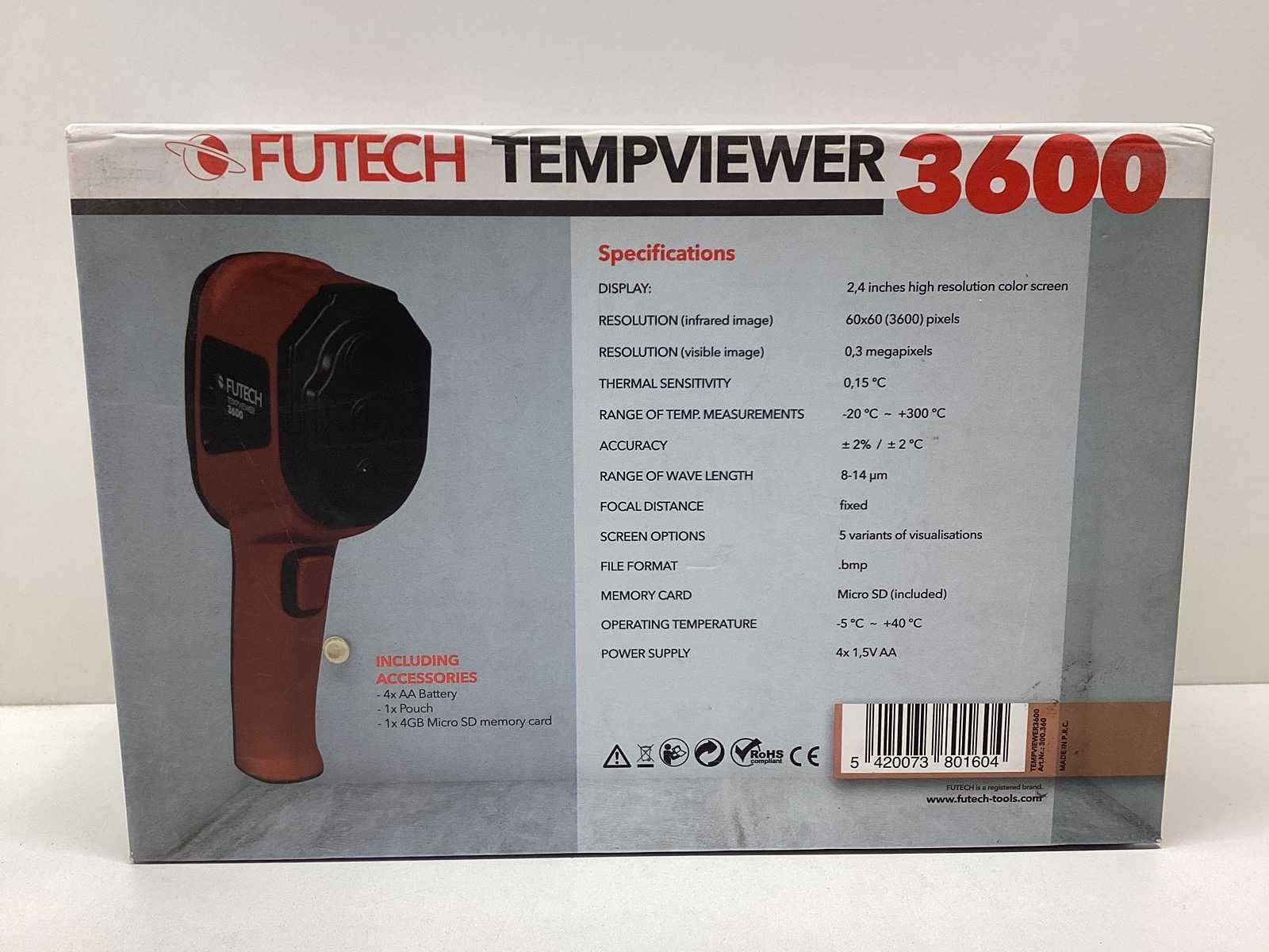 Infrarood thermometer om contactloos de temperatuur van (gevaarlijke, bewegende) oppervlaktes te meten tussen -30°C en +180°C. Deze thermometer heeft een precisie van 2°. Eén laserstraal wijst het centrum van het meetgebied aan.###Meer info en de handleiding van elk toestel zijn beschikbaar op www.futech-tools.com. Merk: Futech Type: Tempviewer 3600