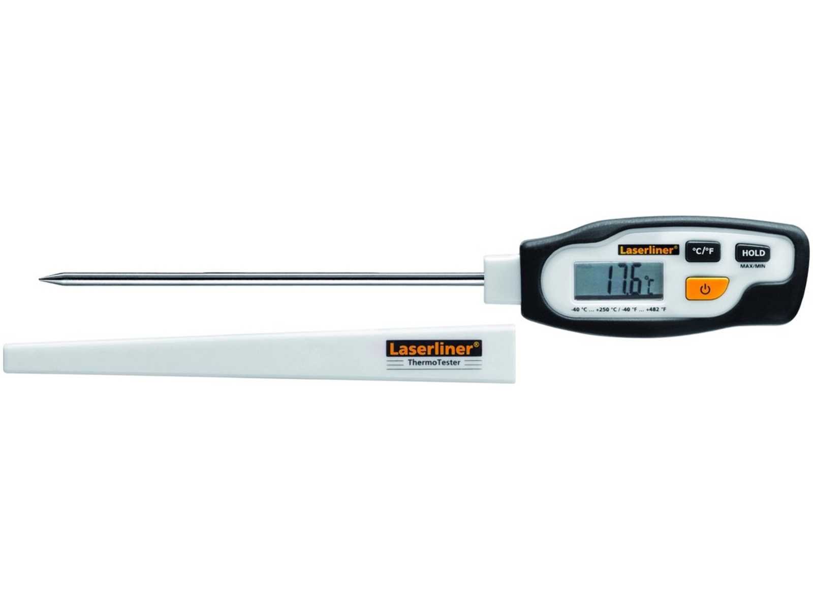 Digitale thermometer geschikt voor huishouden, horeca, handel, handwerk en industrie. Ontworpen voor insteken of onderdompelen, met een groot meetbereik van -40 °C tot 250 °C en een snelle reactietijd. De eenheid is omschakelbaar tussen °C en °F en beschikt over een hold-functie en min./max.-weergave. Nauwkeurigheid: 1,5% ± 2 °C Resolutie: 0,1 °C Sensorlengte: 117 mm Afmetingen: 33 x 210 x 20 mm Voeding: LR44 (1,5 V) Gewicht: 40 g Merk: Laserliner