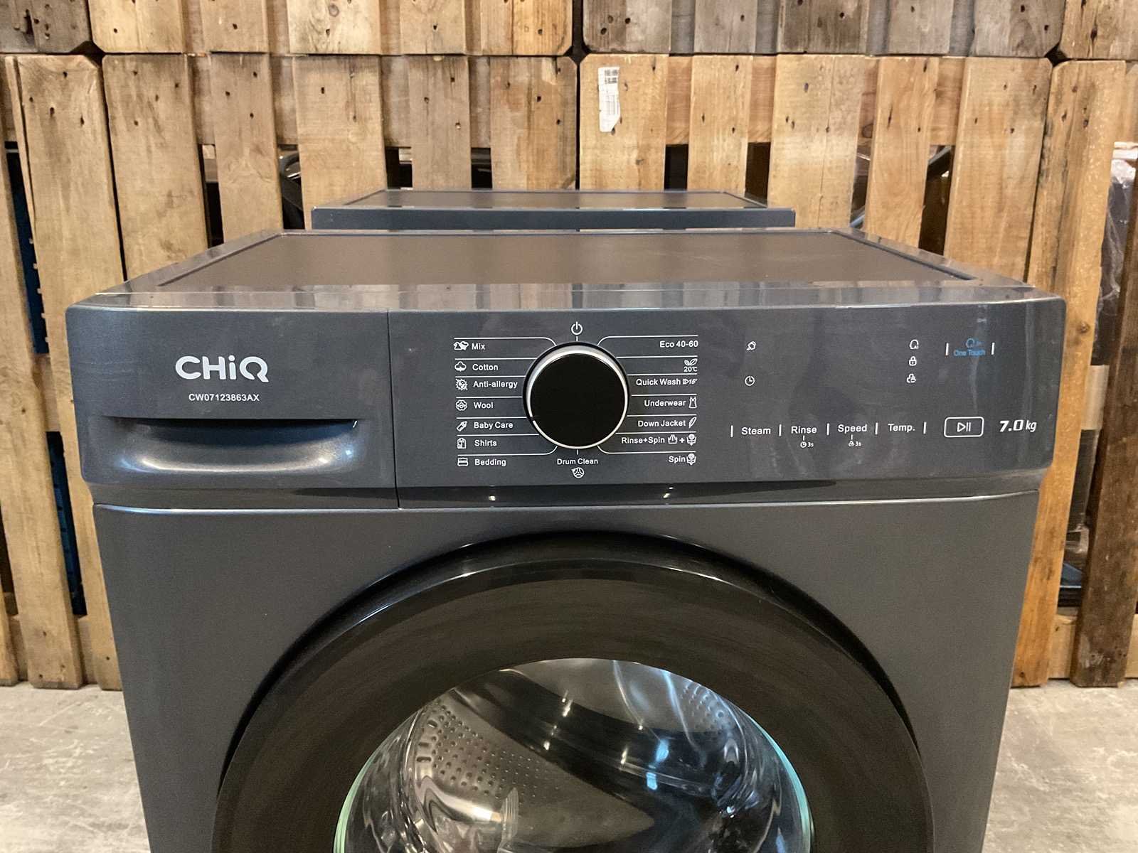 Demo model. Merk: CHiQ Model: CW07123863AX Volume: 76dB Aantal toeren per minuut: 1200rpm Lengte: 60cm Breedte: 46.5cm Hoogte: 85cm Laadvermogen: 7kg