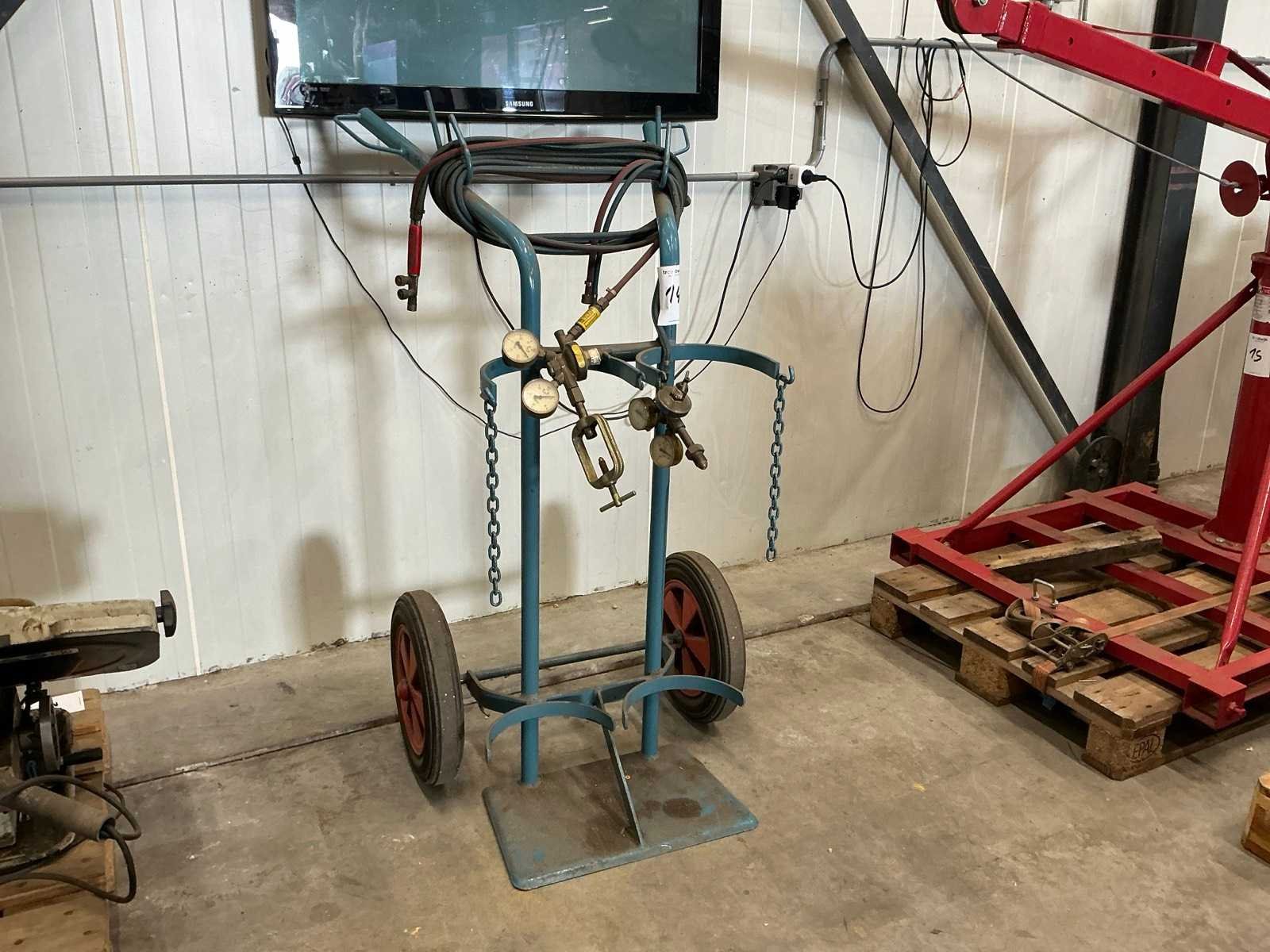 Voor 2x gasfles; met gasdrukregelaar en slangen voor snijbrander; volle banden Lengte: 60cm Breedte: 67cm Hoogte: 135cm