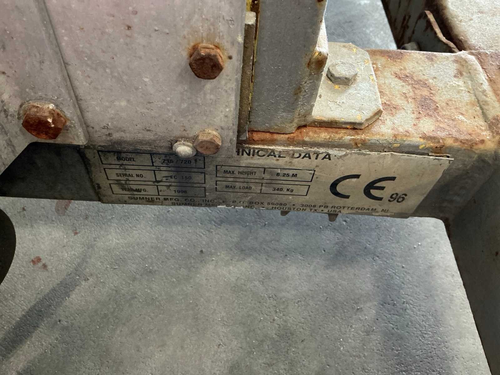 Elektrisch aangedreven Merk: Sumner Type: 715 / 720 Bouwjaar: 1996 Serienummer: EC150 Hijsvermogen: 300kg Max. hefhoogte: 6.25m Afmeting l: 1800mm Afmeting b: 800mm Afmeting h: 2050mm Aansluiting: 230V