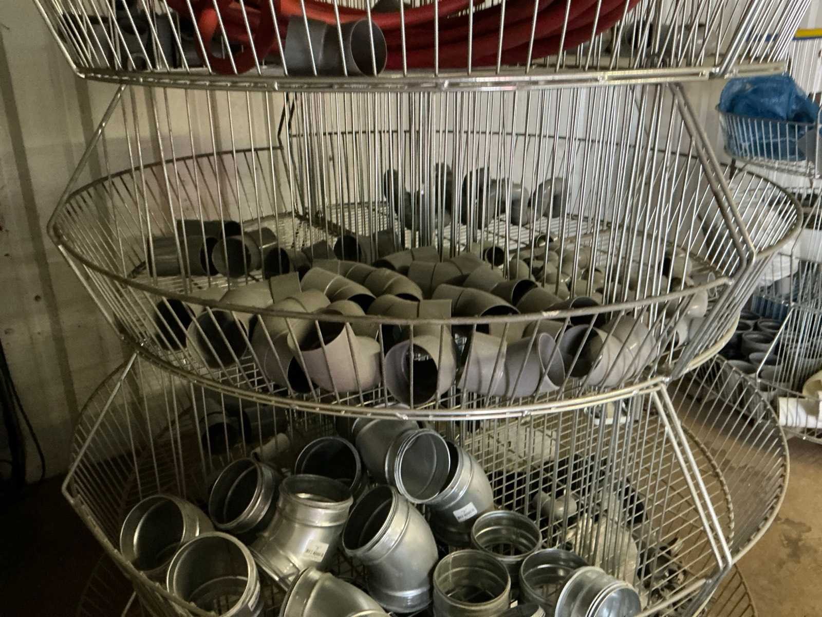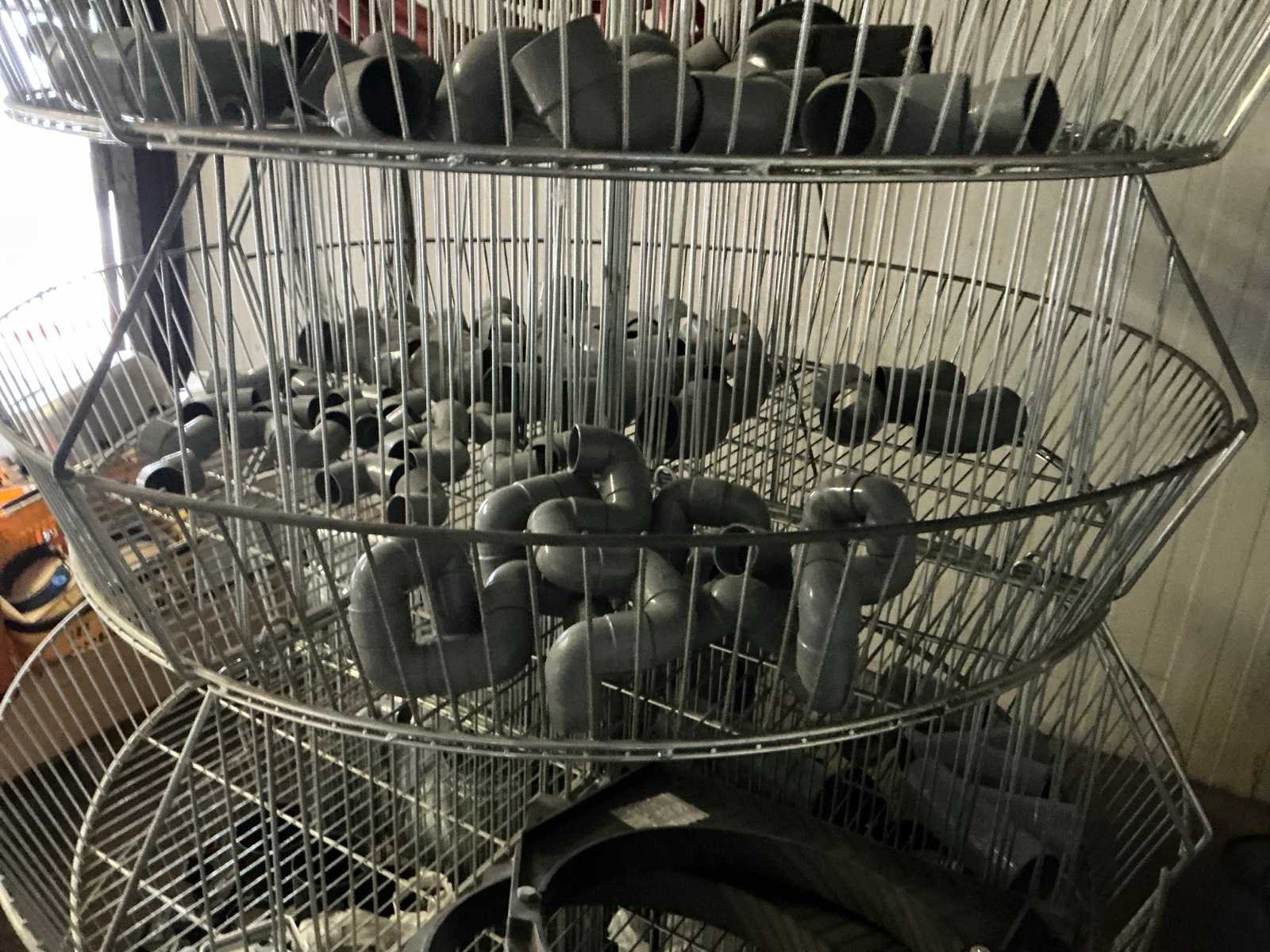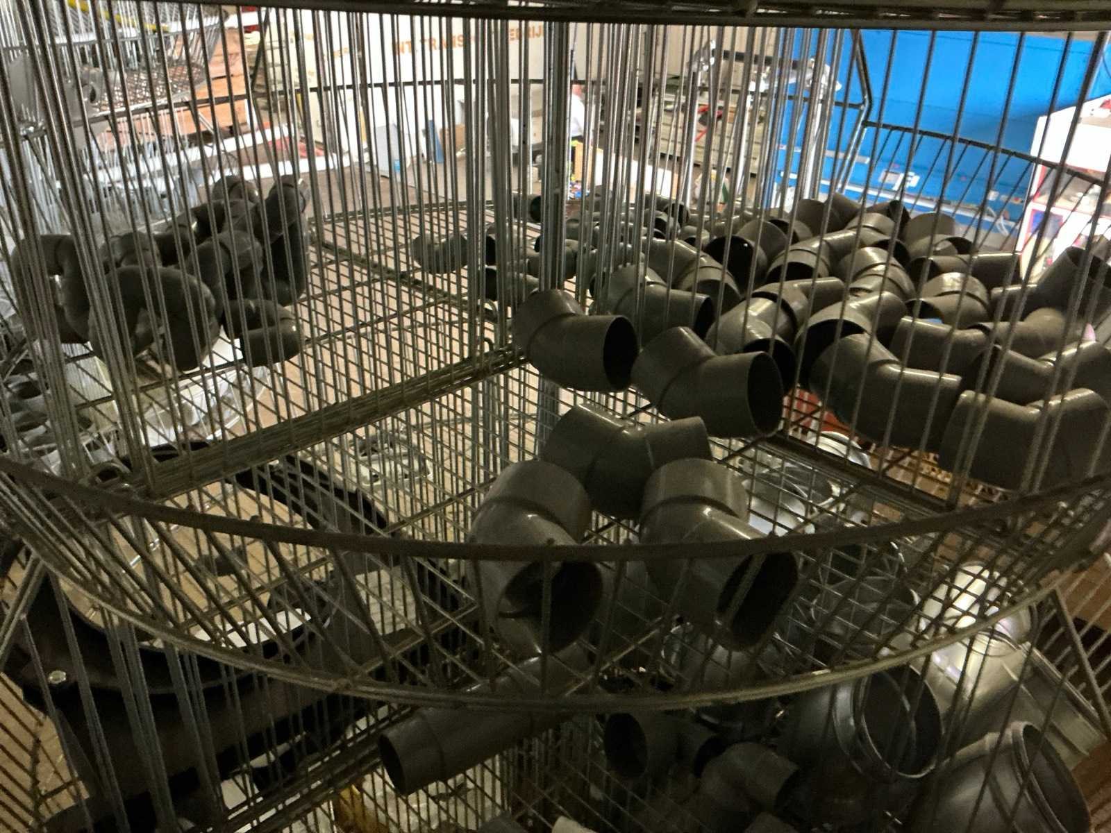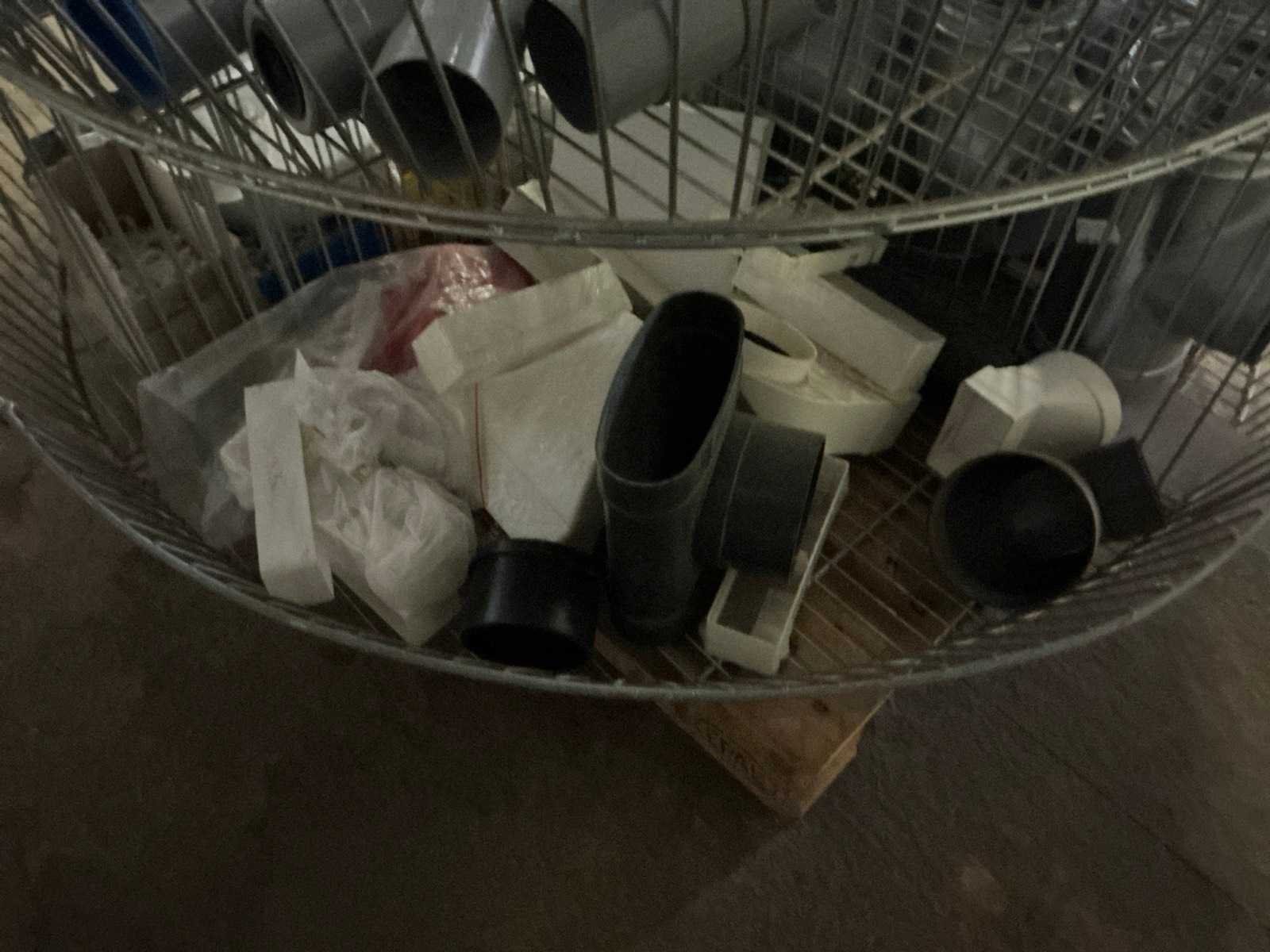 Diverse pvc koppelingen; toilet; wc bril; totaal in 2 ronde stellingen en 1x pallet; inclusief stellingen