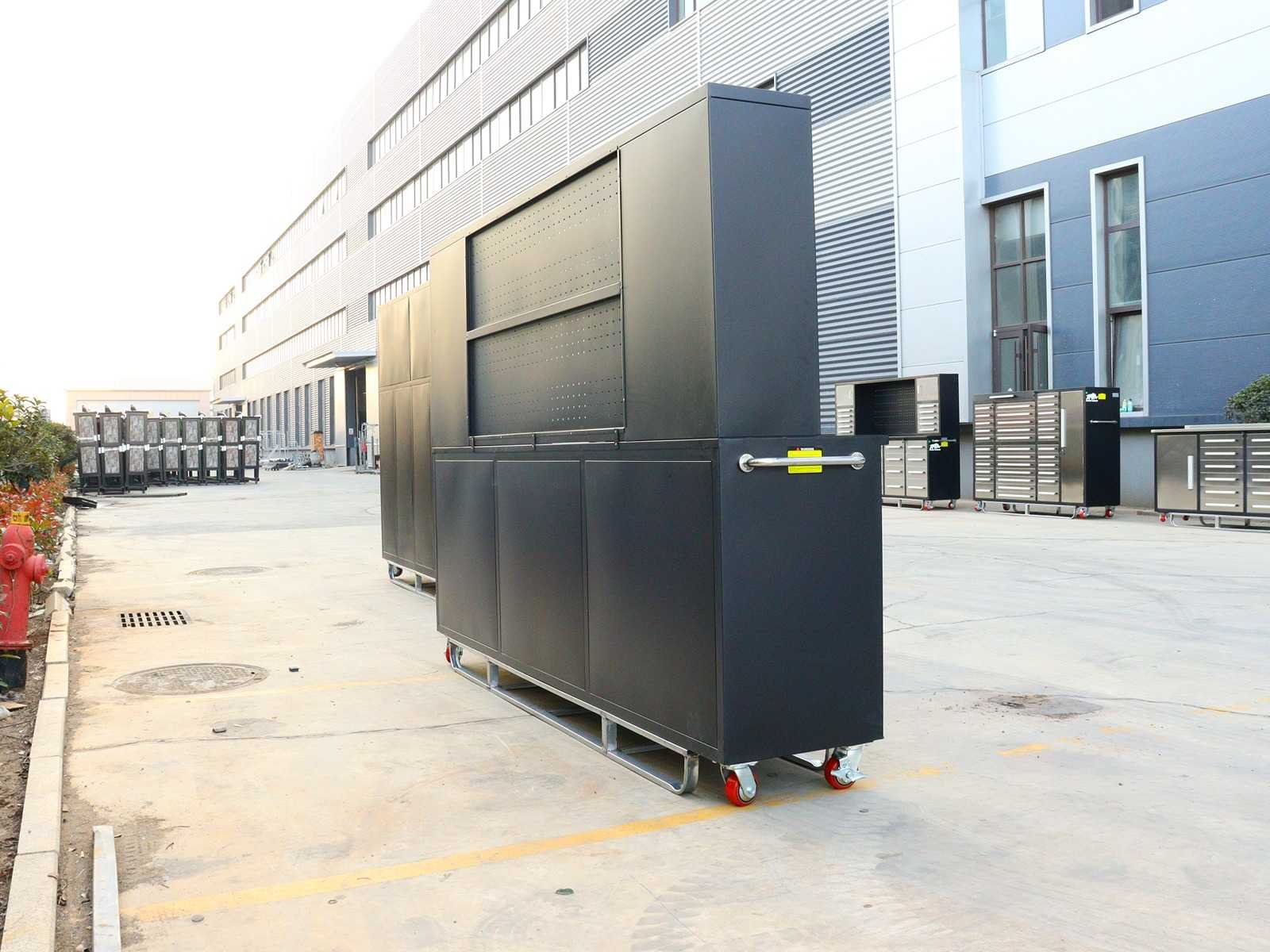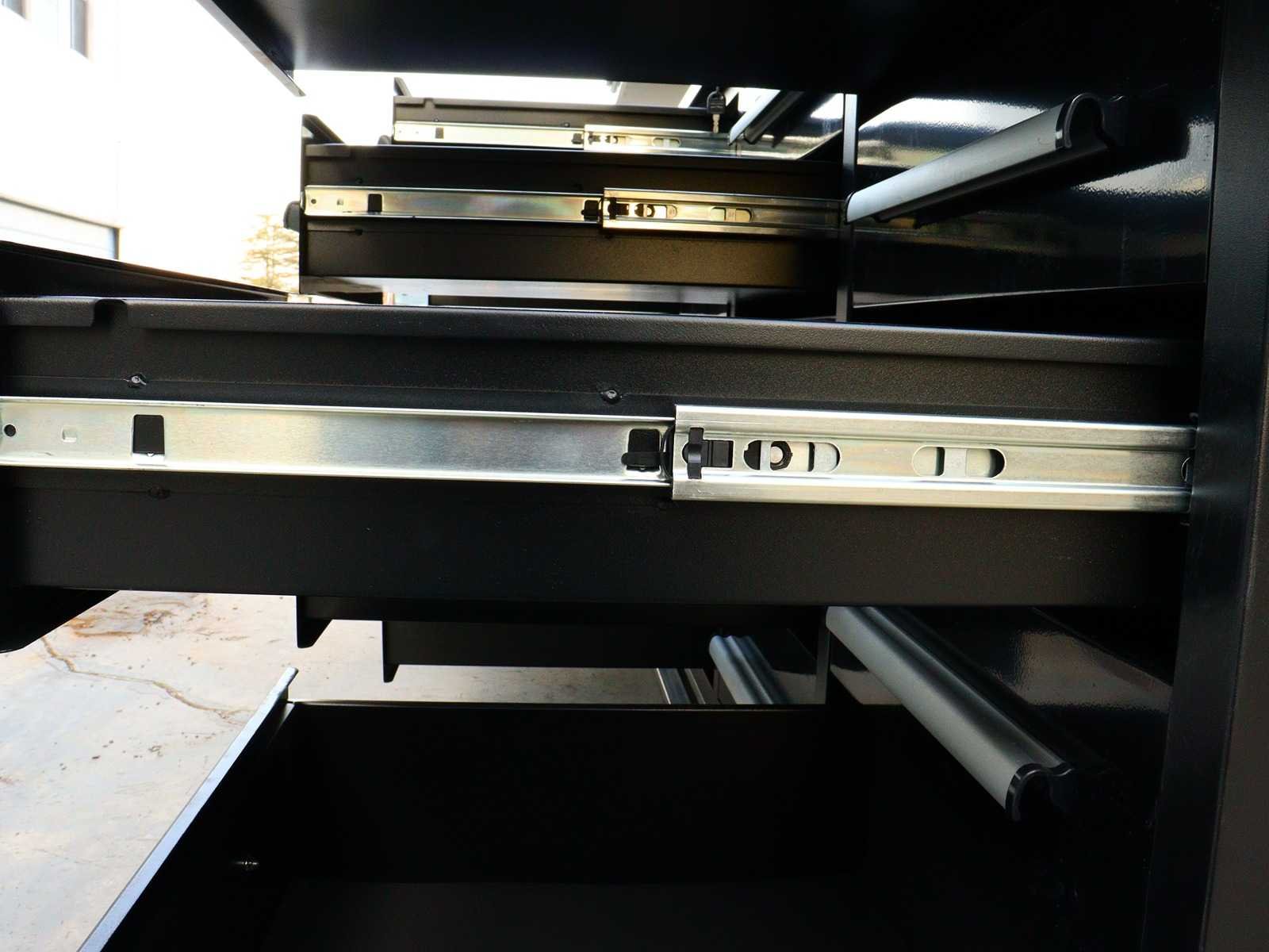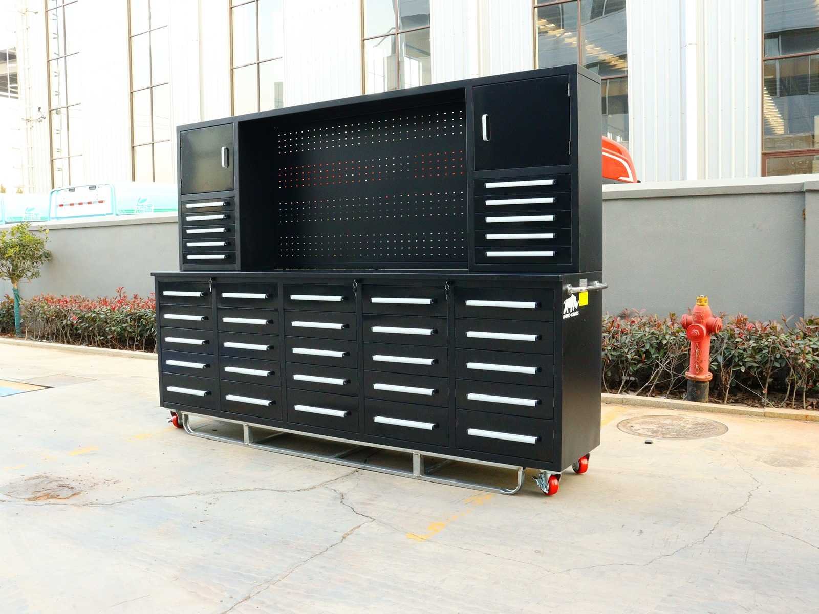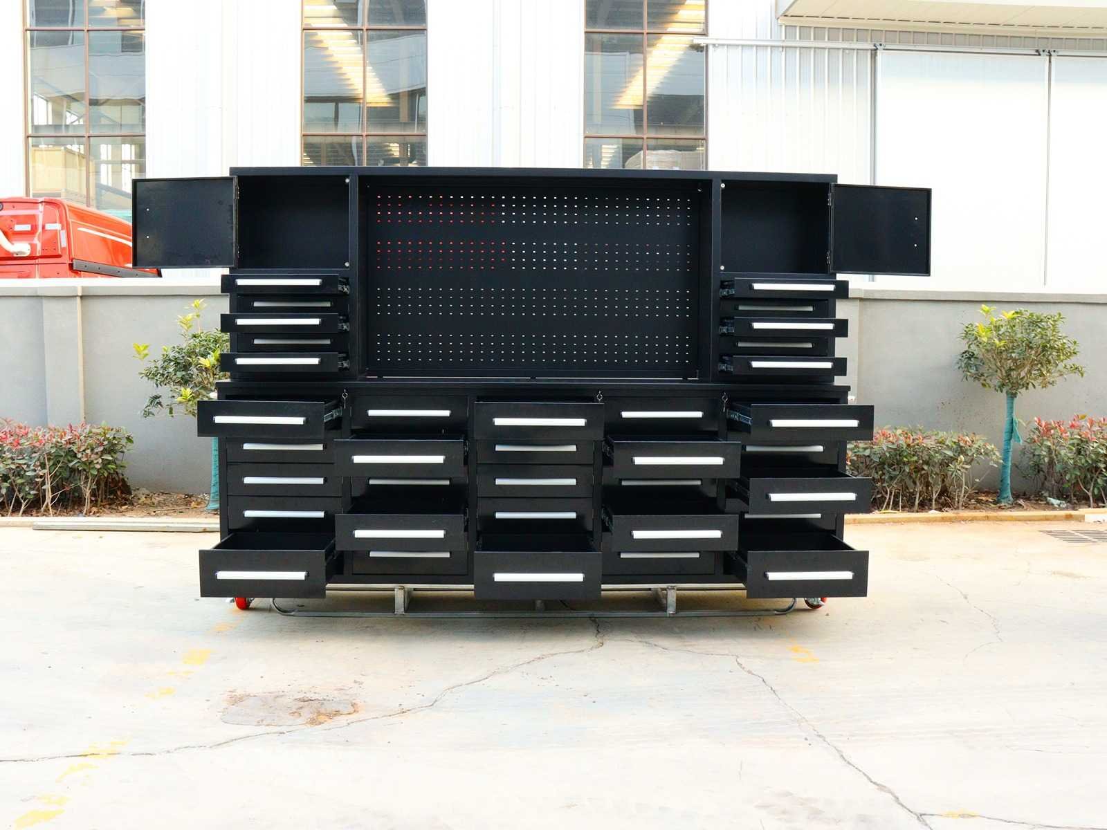 Voorzien van Gepoedercoat staal; 35 lades 2 kastdeuren; Ongebruikt (Transport afmetingen 2870x585x2050mm) Merk: Rhino-Cross-Workbench Product type: H10ft-35D-01C Zwart