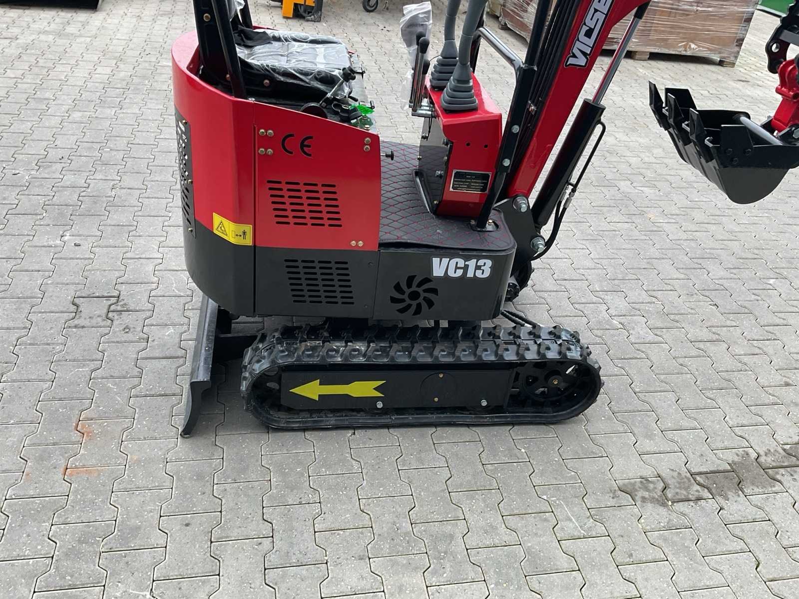 Voorzien van 2 cillinder benzine motor; 800 mm giek; extra hydraulische leidingen; aanvulblad; 180 mm rubberen rupsbanden; 400 mm graafbak; handmatige duim; ongebruikt Merk: VICSEC Type: VC13-R Aantal cilinders: 2 Brandstof: benzine