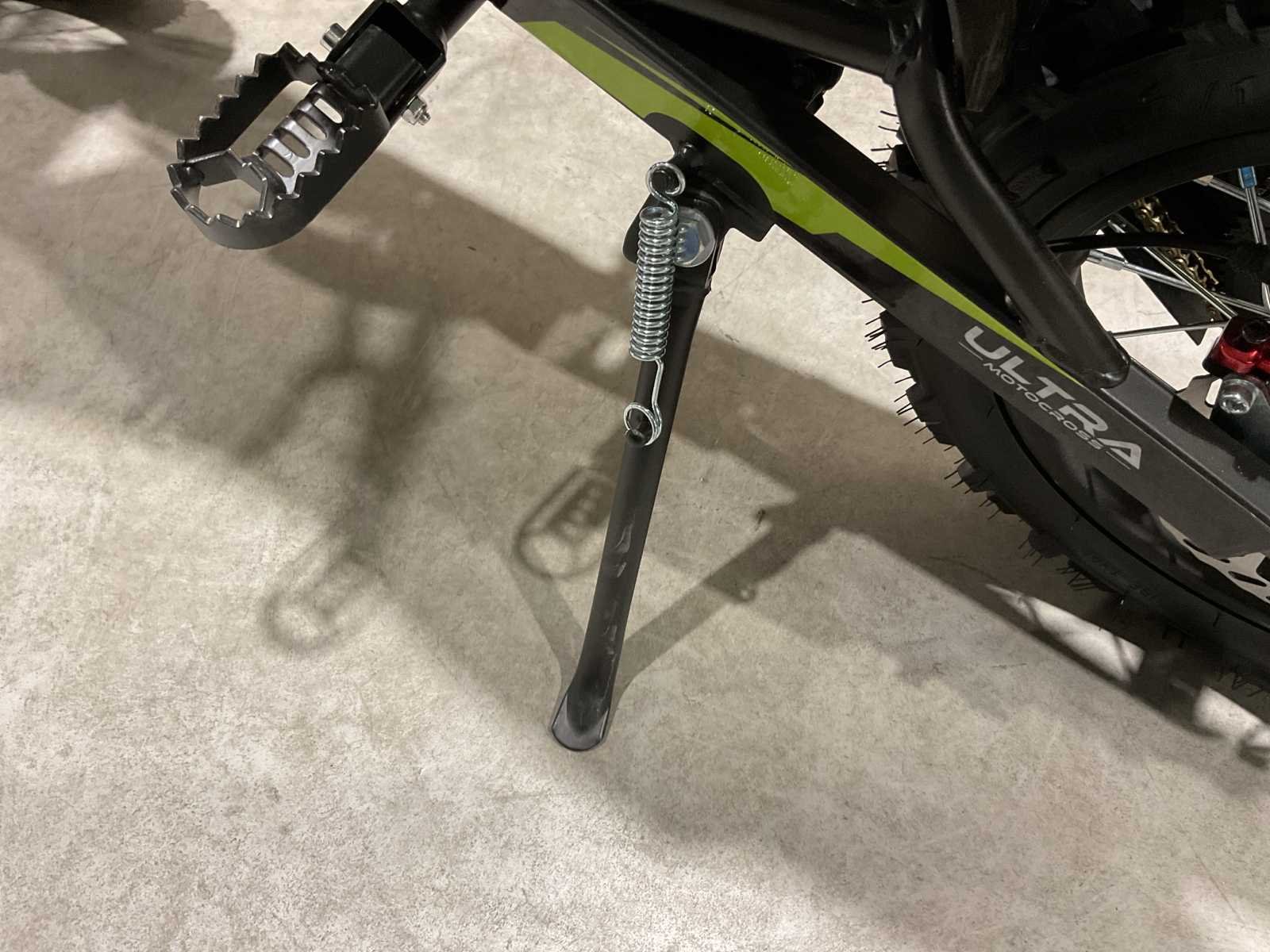 Voorzien van Accu: 48V13Ah lithium; Transmissie: intelligente controller, instelbaar in 2 functies; Gasrespons instelbaar van 0,2S tot 1,0S; Maximale snelheid instelbaar van 10 km/u - 55 km/u (1800W); Eindaandrijving: voor 10T / achter 76T; Actieradius per volle lading (13Ah lithium accu): ~24 km; Velg & banden: Velg met stalen spaken, voor 14" en achter 12"; Band: voor 2,75-14" / achter 3,00-12"; Max. Snelheid: 55 km/u (1800 W); Max. draagvermogen: 65 kg; Remsysteem: mechanische rem/schijf voor en achter (Ø 180 mm); Vering: hydraulische upside-down vork en monoshock achter; Afmetingen (L*B*H): 1470*640*920 mm; Wielbasis: 1010 mm; Zithoogte: 680 mm; Minimale bodemvrijheid: 300 mm; Gewicht: 38 kg; Ongebruikt in doos (Transport afmetingen 129x37x66cm 49kg) Merk: Ultra Motocross Model: ULD01 GR Type: 1800W 48v Brandstof: Electrisch Gewicht: 39kg Kleur: Groen Bouwjaar: 2025