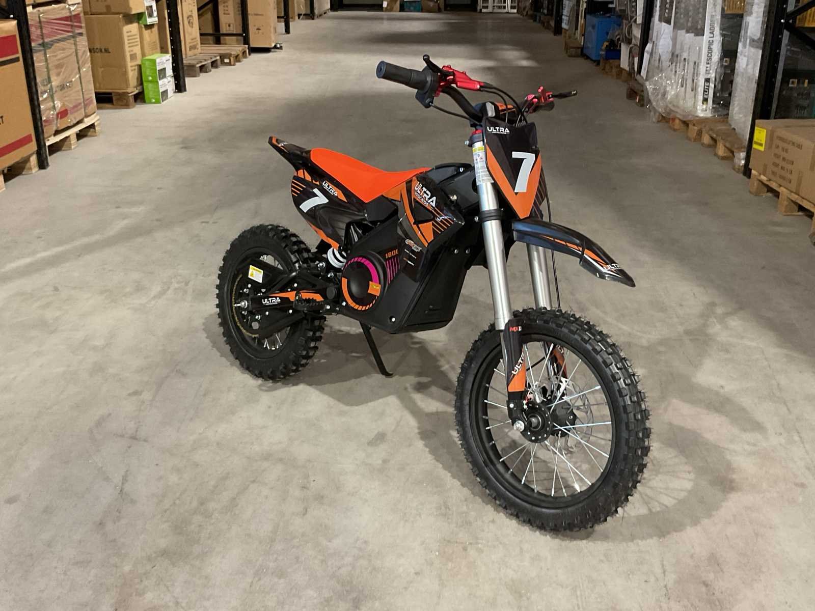 Voorzien van Accu: 48V13Ah lithium; Transmissie: intelligente controller, instelbaar in 2 functies; Gasrespons instelbaar van 0,2S tot 1,0S; Maximale snelheid instelbaar van 10 km/u - 55 km/u (1800W); Eindaandrijving: voor 10T / achter 76T; Actieradius per volle lading (13Ah lithium accu): ~24 km; Velg & banden: Velg met stalen spaken, voor 14" en achter 12"; Band: voor 2,75-14" / achter 3,00-12"; Max. Snelheid: 55 km/u (1800 W); Max. draagvermogen: 65 kg; Remsysteem: mechanische rem/schijf voor en achter (Ø 180 mm); Vering: hydraulische upside-down vork en monoshock achter; Afmetingen (L*B*H): 1470*640*920 mm; Wielbasis: 1010 mm; Zithoogte: 680 mm; Minimale bodemvrijheid: 300 mm; Gewicht: 38 kg; Ongebruikt in doos (Transport afmetingen 129x37x66cm 49kg) Merk: Ultra Motocross Model: ULD01 OR Type: 1800W 48v Gewicht: 39kg Kleur: Oranje Bouwjaar: 2025