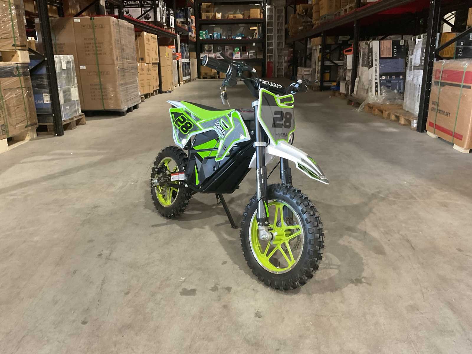 Voorzien van Motorvermogen: 1000 W elektrische motor; Voedingsspanning: 36 V; Topsnelheid: ± 35 km/u (snelheid in 3 standen instelbaar via sleutel); Zadelhoogte: ± 61 cm; Afmetingen (L×B×H): ± 120 × 80 × 56 cm (gemonteerd); Eigen gewicht: 40 kg; Max. belasting: 65 kg; Ongebruikt Merk: Ultra Motocross Model: DB07E GR Type: 1000W Gewicht: 38kg Kleur: Groen