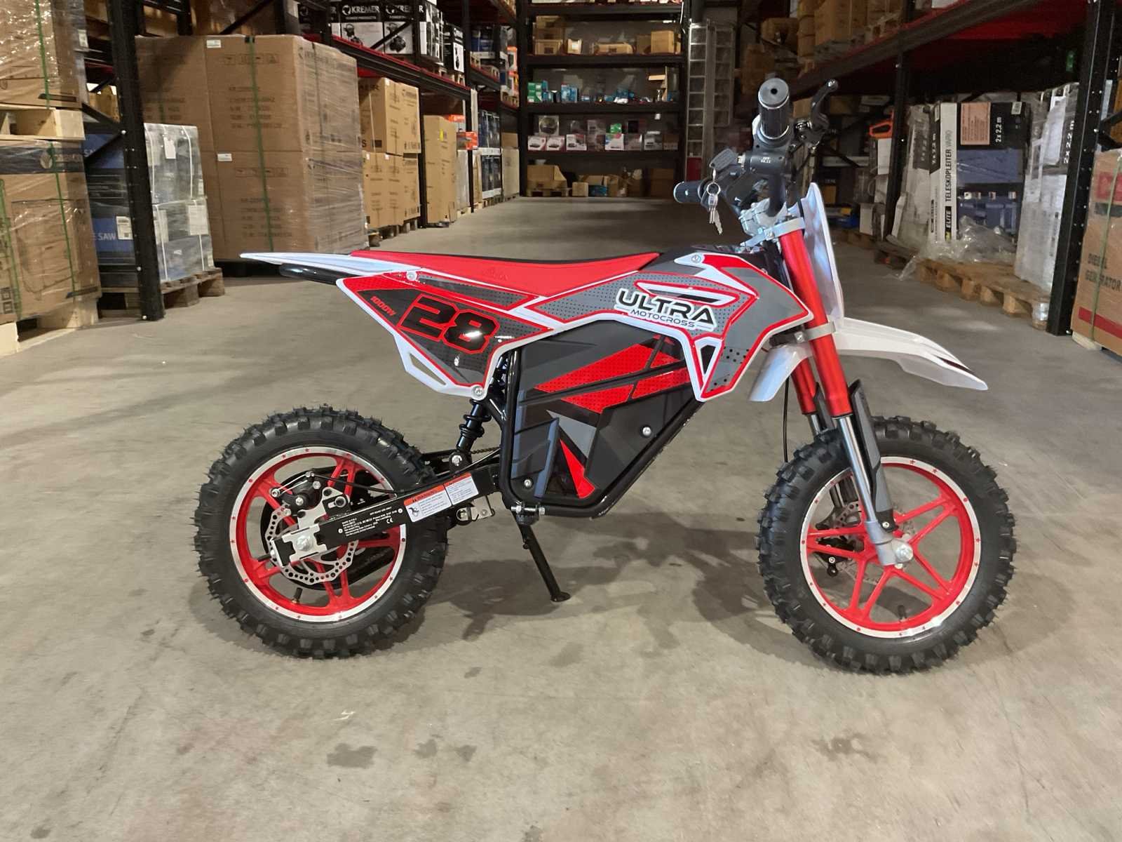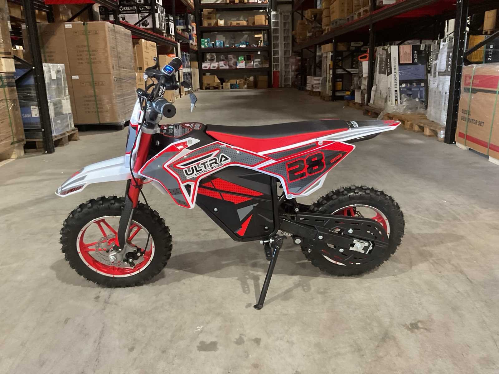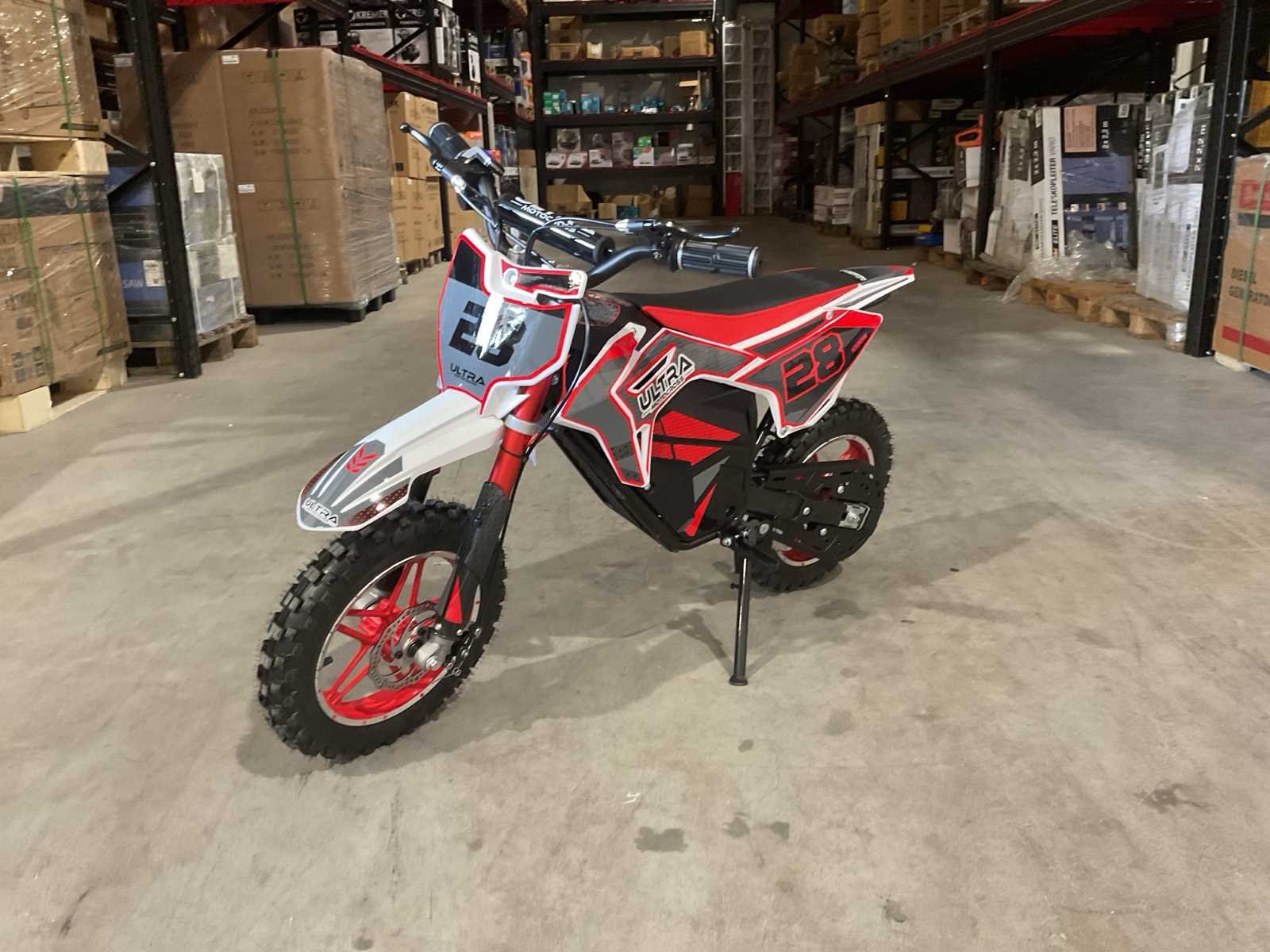Voorzien van Motorvermogen: 1000 W elektrische motor; Voedingsspanning: 36 V; Topsnelheid: ± 35 km/u (snelheid in 3 standen instelbaar via sleutel); Zadelhoogte: ± 61 cm; Afmetingen (L×B×H): ± 120 × 80 × 56 cm (gemonteerd); Eigen gewicht: 40 kg; Max. belasting: 65 kg; Ongebruikt Merk: Ultra Motocross Model: DB07E RD Type: 1000W Gewicht: 38kg Kleur: Rood Bouwjaar: 2025