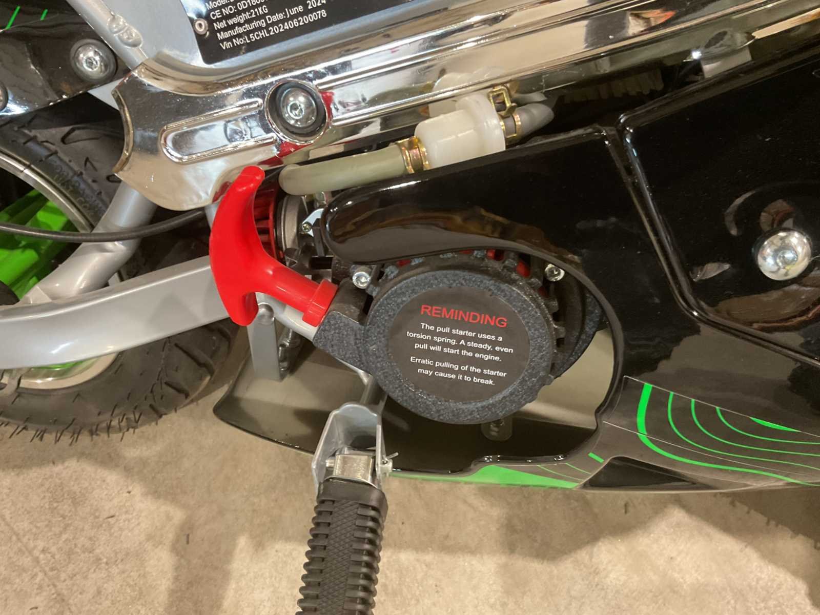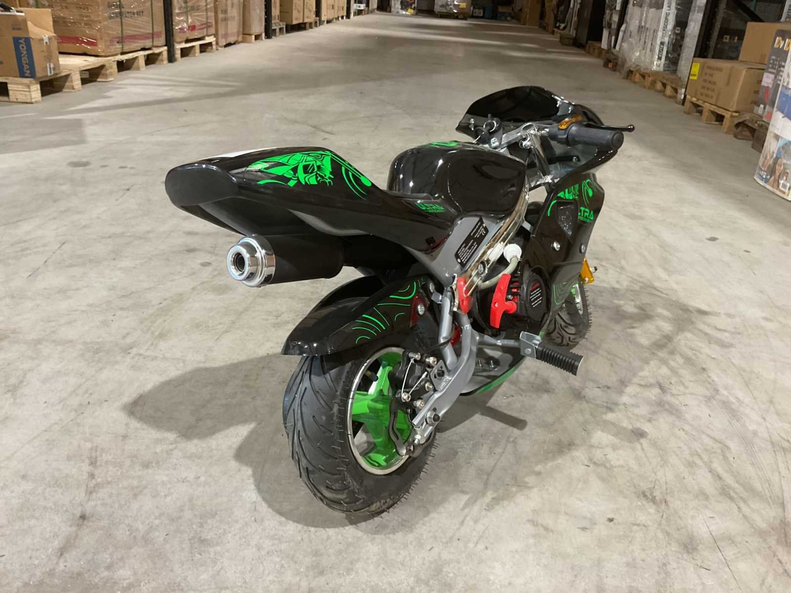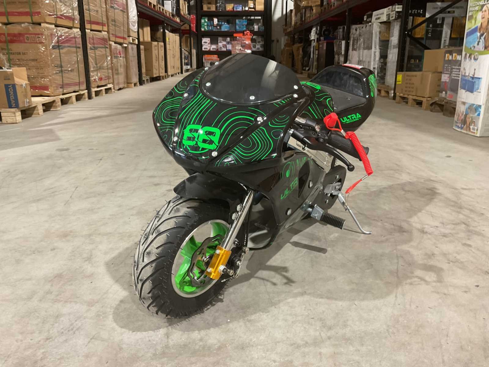 Voorzien van 49cc motor; 2 takt; 3,5 HP; schijfremmen; bandenmaat 6,5” inch; ongebruikt in doos (transport afmetingen 105x35x55 cm Gewicht 26kg) Merk: Ultra Motocross Model: DB05 Type: 49cc Pocket bike mini GR Brandstof: Benzine 2 takt Cilinderinhoud: 49cc Gewicht: 24kg Kleur: Groen Transmissie: Automaat Aantal sleutels: 2 Bouwjaar: 2025