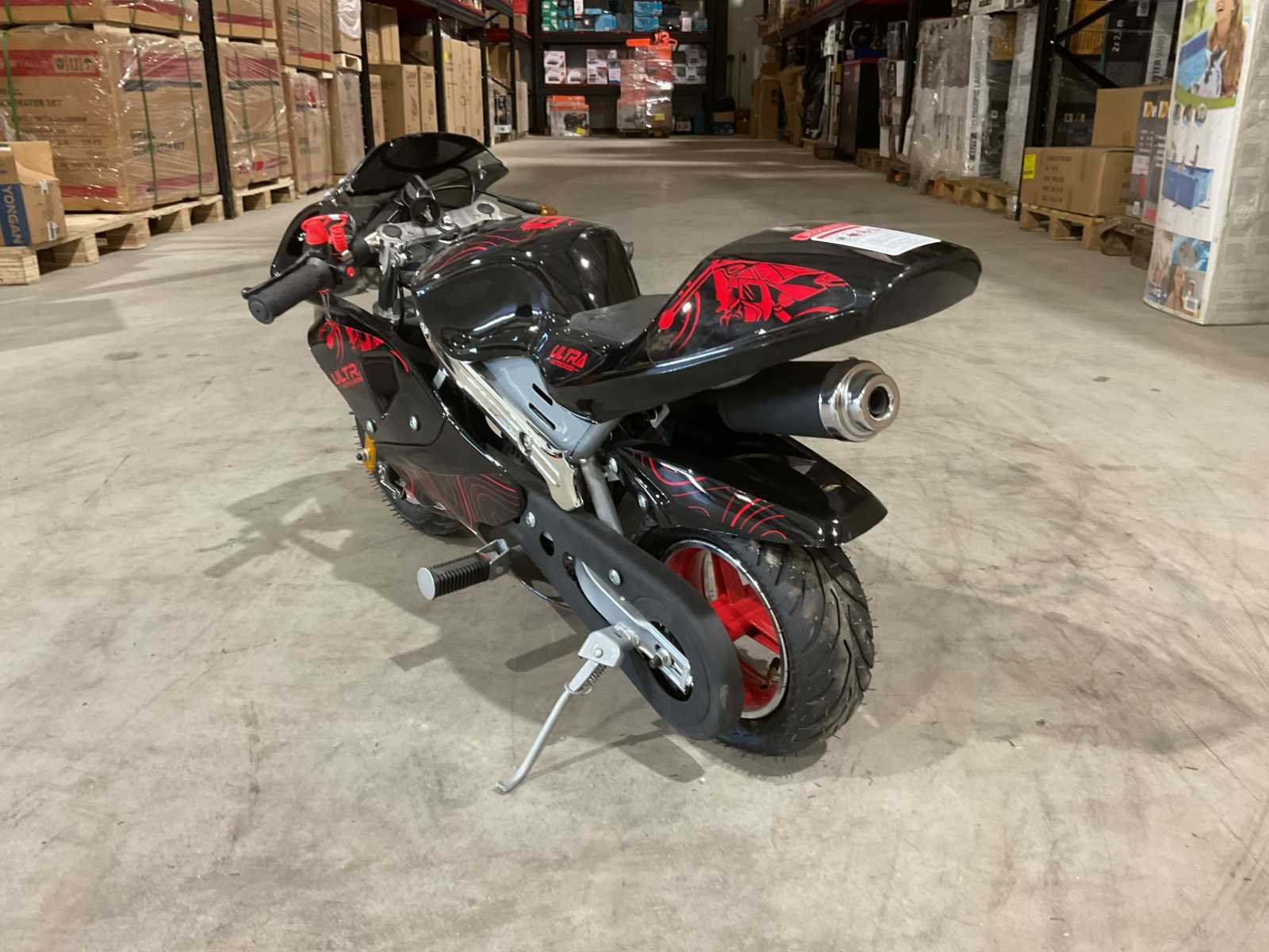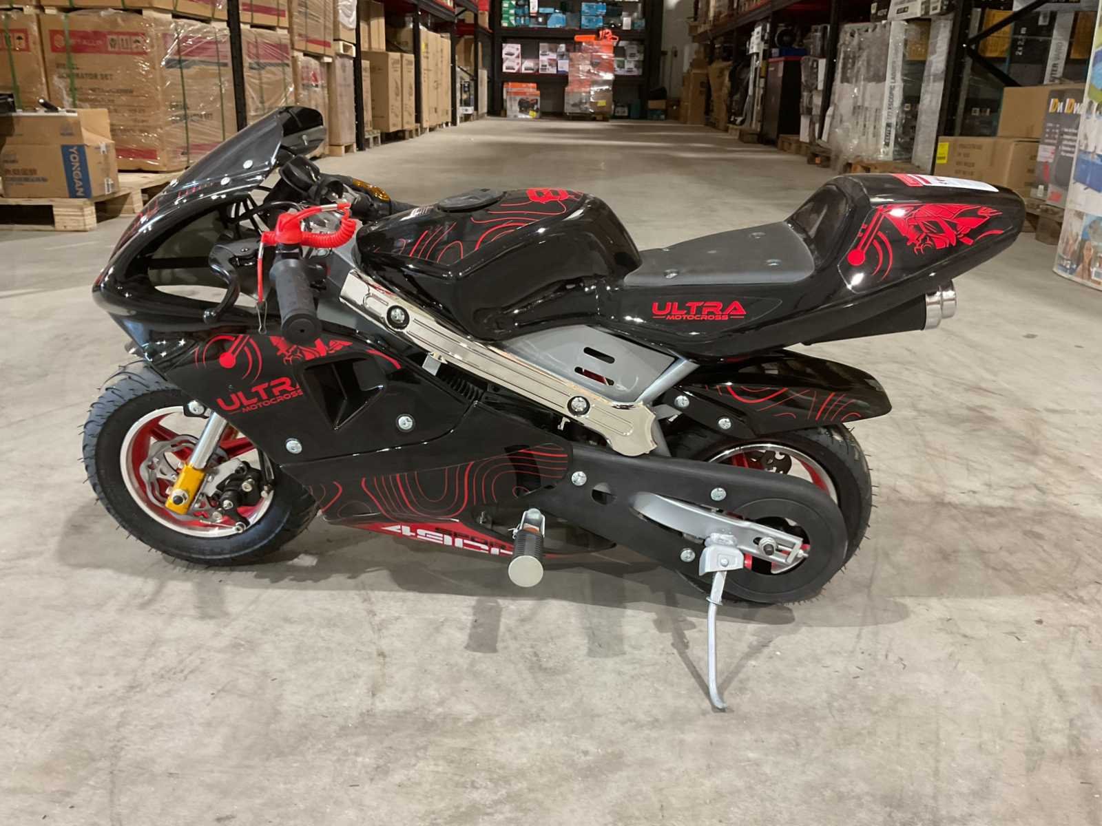 Voorzien van 49cc motor; 2 takt; 3,5 HP; schijfremmen; bandenmaat 6,5” inch; ongebruikt in doos (transport afmetingen 105x35x55 cm Gewicht 26kg) Merk: Ultra Motocross Model: DB05 Type: 49cc Pocket bike mini RD Brandstof: Benzine 2 Takt Cilinderinhoud: 49cc Gewicht: 24kg Kleur: Rood Transmissie: Automaat Aantal sleutels: 2 Bouwjaar: 2025