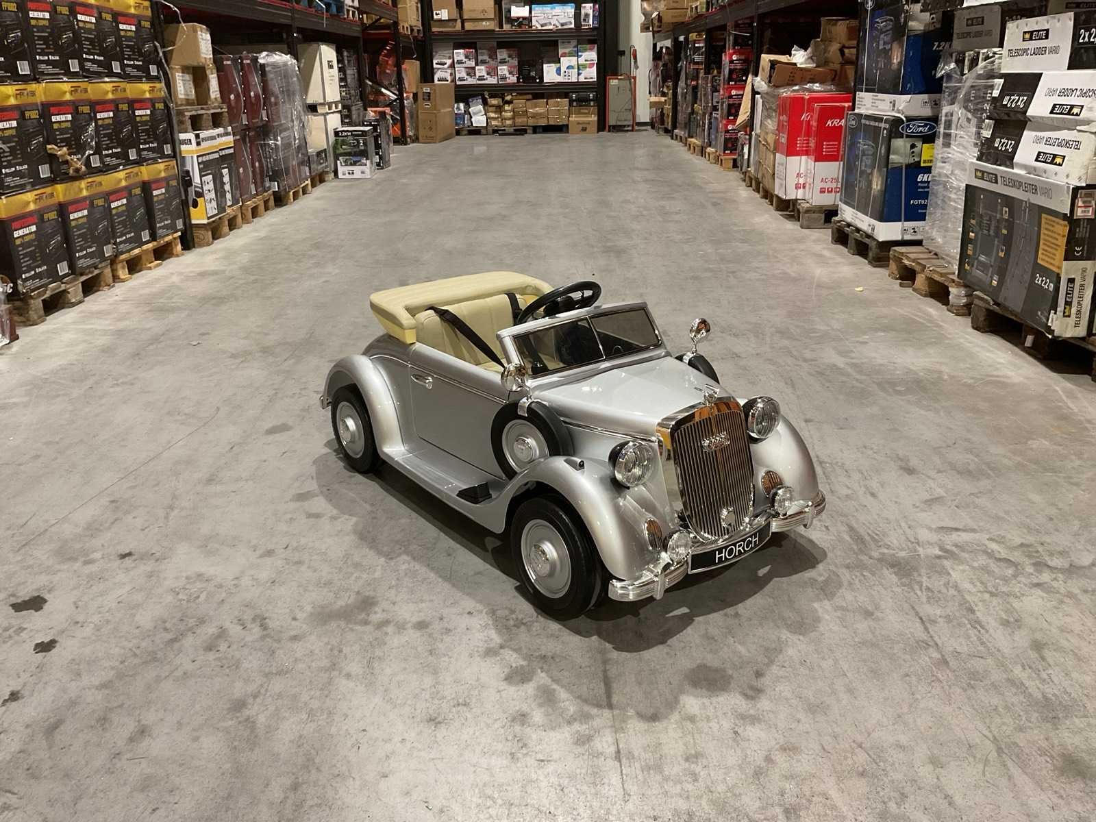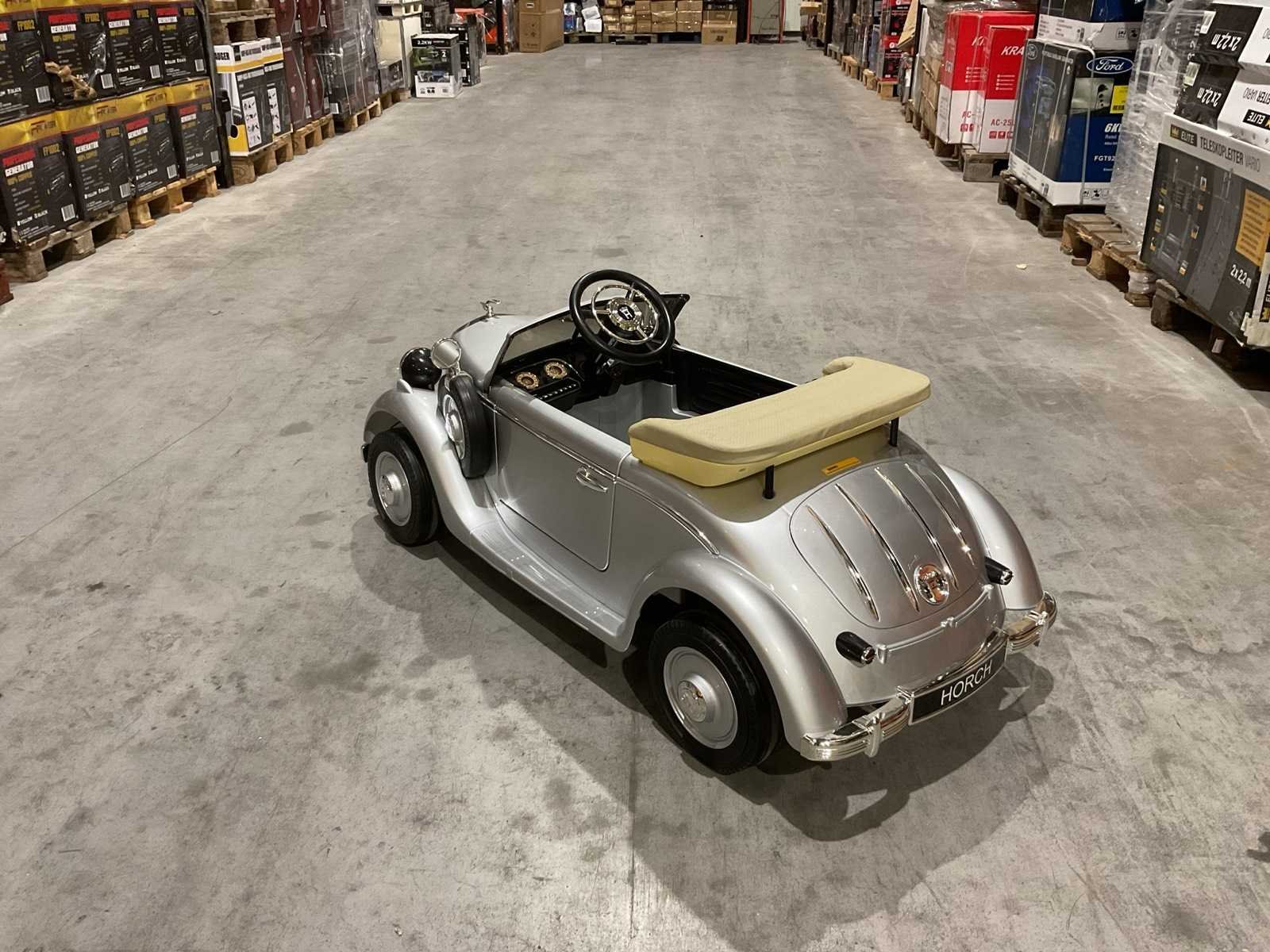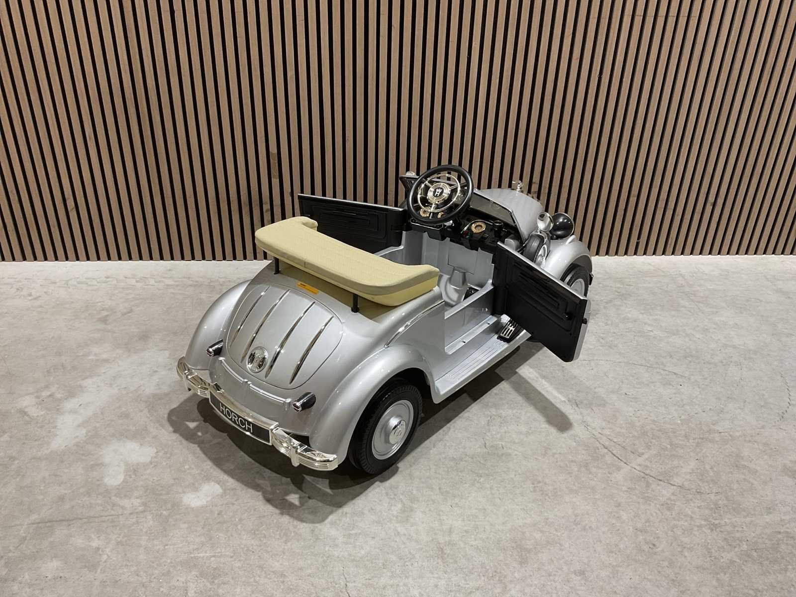 Voorzien van elektrische motor; Klassieke Horch design; Verlichting; openende deuren; maximum gewicht: 100kg; afstandsbediening; Voetpedaal; usb aansluiting; Geluidseffecten; ongebruikt in doos Merk: Audi Model: JE1005 Product type: Horch 930V zilver Gewicht: 24kg Lengte: 125cm Breedte: 65cm Hoogte: 60cm