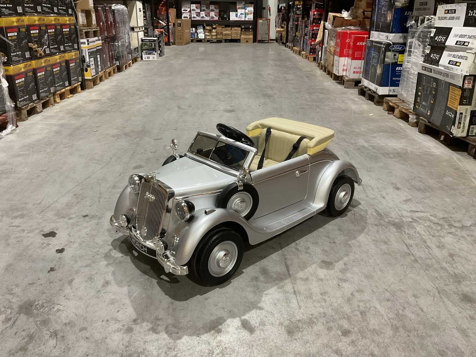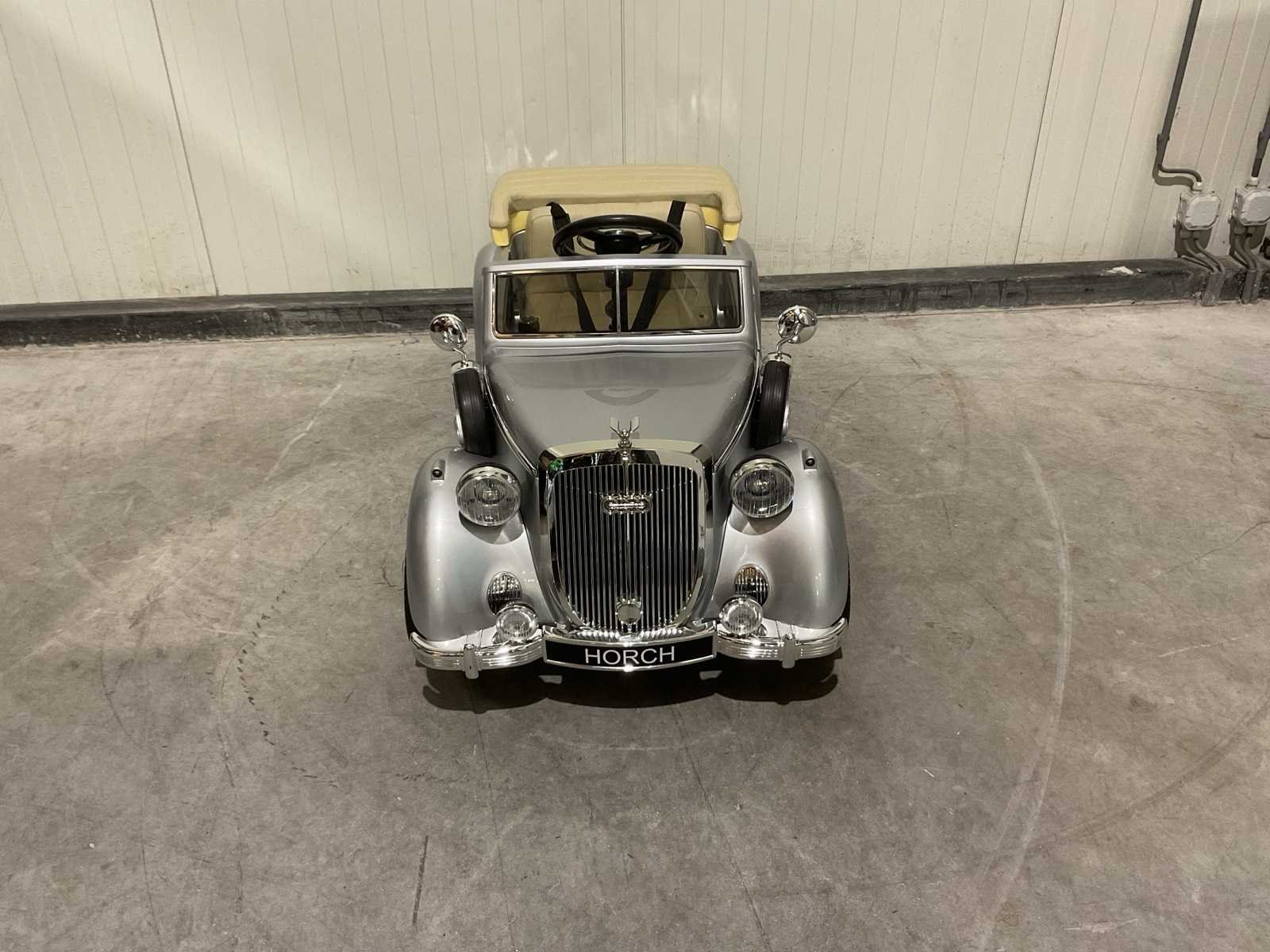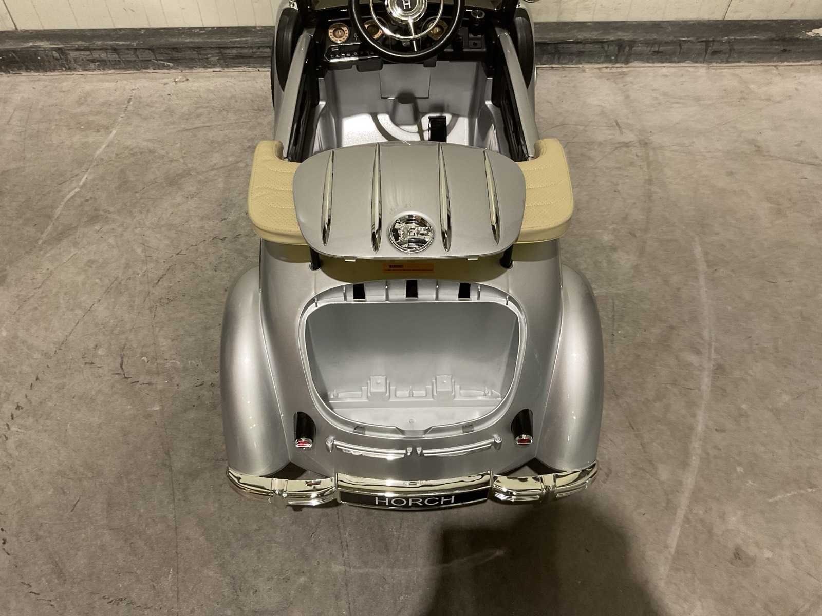 Voorzien van elektrische motor; Klassieke Horch design; Verlichting; openende deuren; maximum gewicht: 100kg; afstandsbediening; Voetpedaal; usb aansluiting; Geluidseffecten; ongebruikt in doos Merk: Audi Model: JE1005 Product type: Horch 930V zilver Gewicht: 24kg Lengte: 125cm Breedte: 65cm Hoogte: 60cm