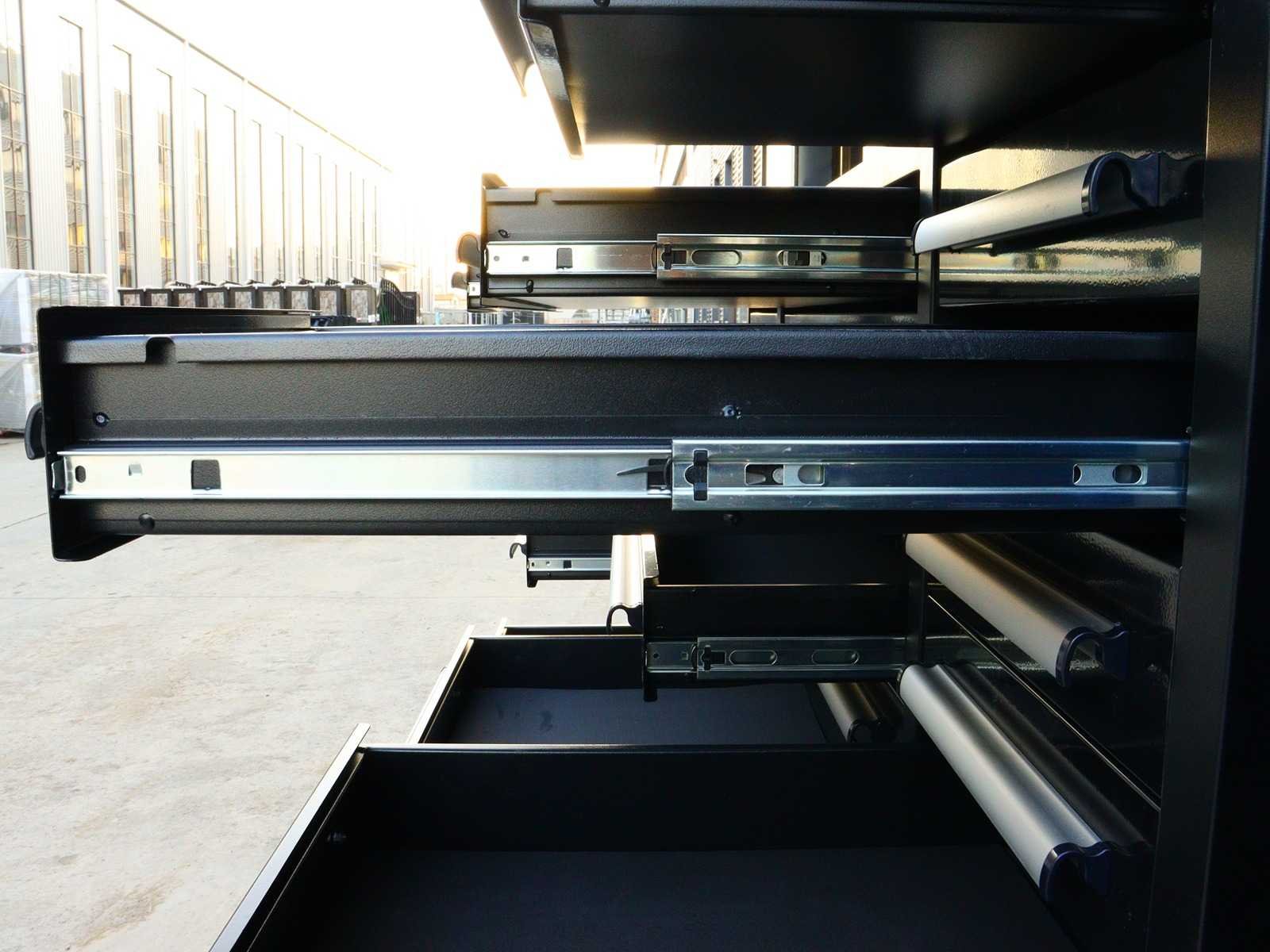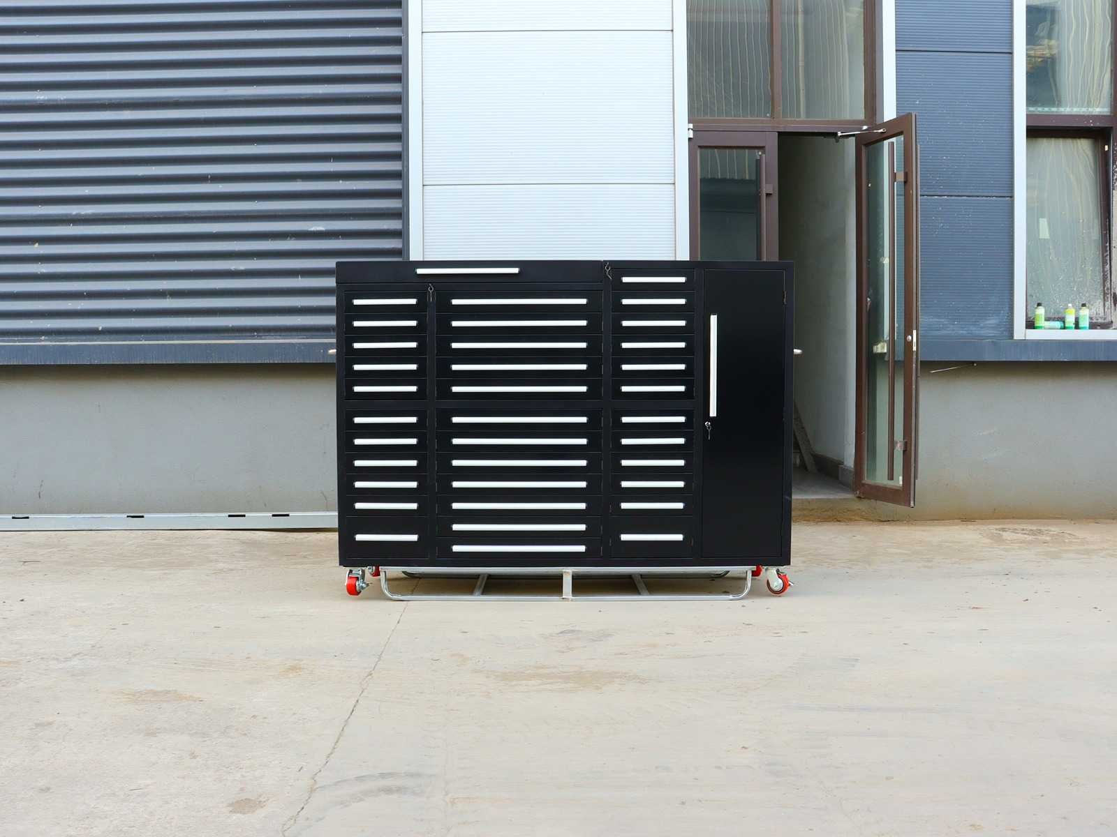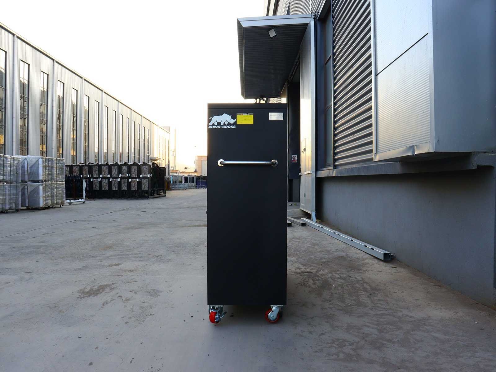 Voorzien van Gepoedercoat staal; 35 lades; 1 Deur; 1 bovenkast; Ongebruikt (Transport afmetingen 2875x725x1140mm) Merk: Rhino-Cross-Workbench Product type: H7ft-35D-1-L-01C Zwart