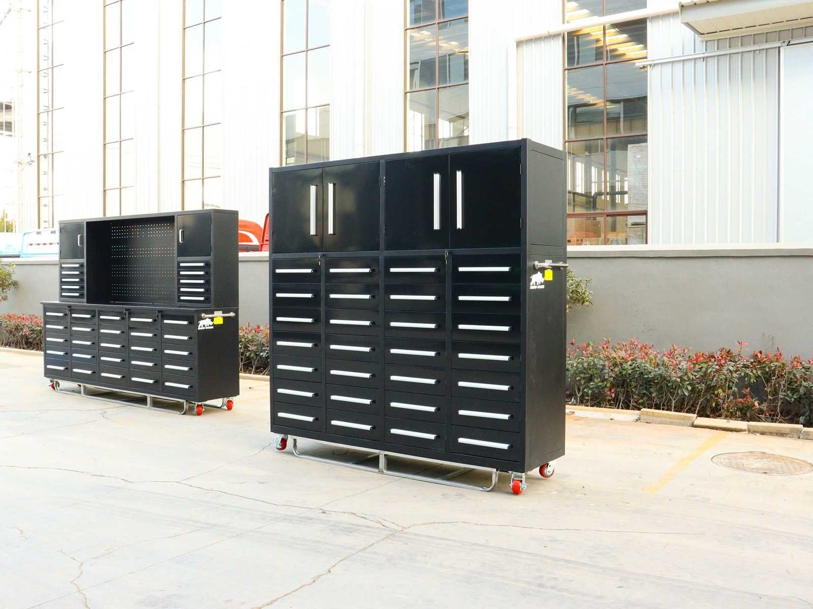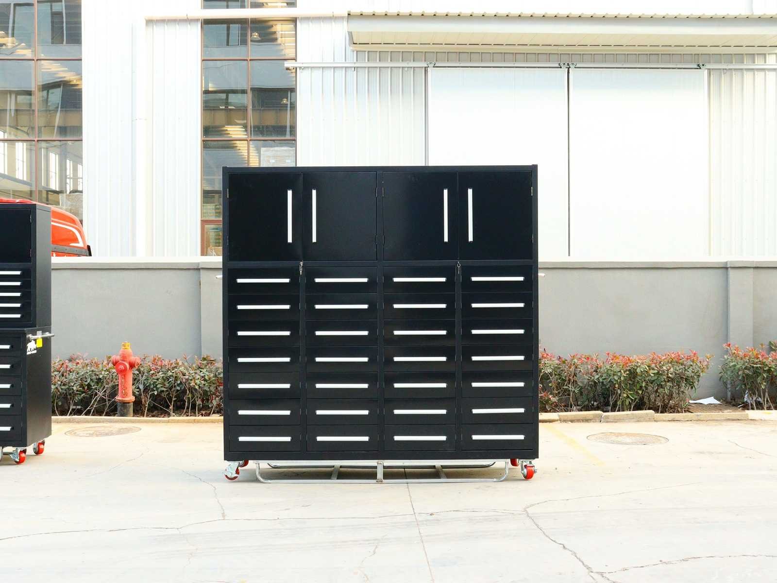 Voorzien van Gepoedercoat staal; 28 lades 2 kastdeuren; Ongebruikt (Transport afmetingen 2205x650x2050mm) Merk: Rhino-Cross-Workbench Product type: H7ft-28D-4-01C Zwart