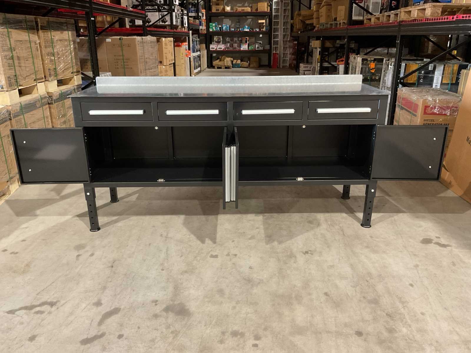 Voorzien van Gepoedercoat staal; 4 lades; 4 deuren; verstelbare hoogte van de poten; Sleutels voor afsluiten; Ongebruikt (Transport afmetingen 2200x660x850 mm) Merk: Rhino-Cross-Workbench Type: 7ft Zwart / stalen blad