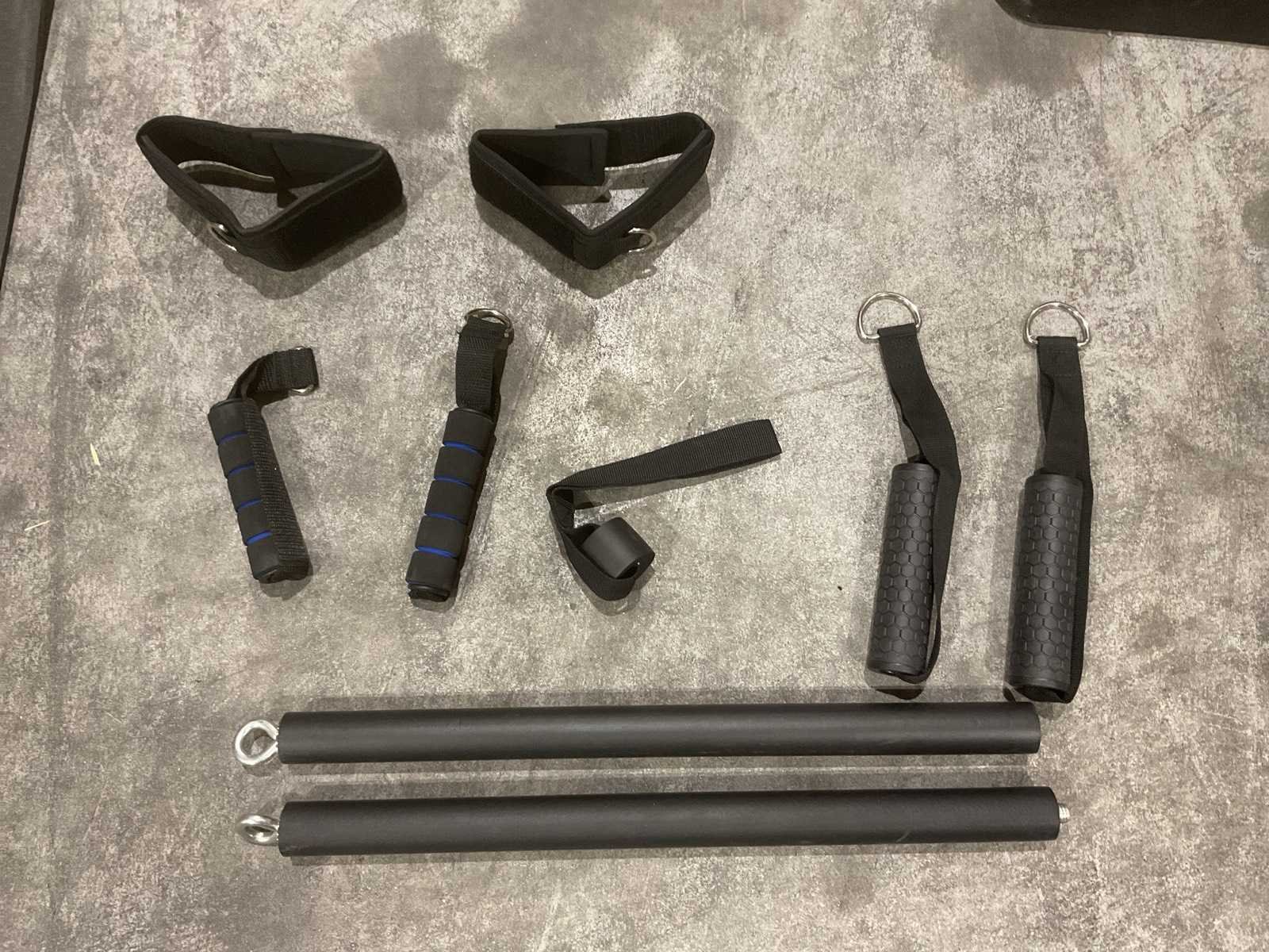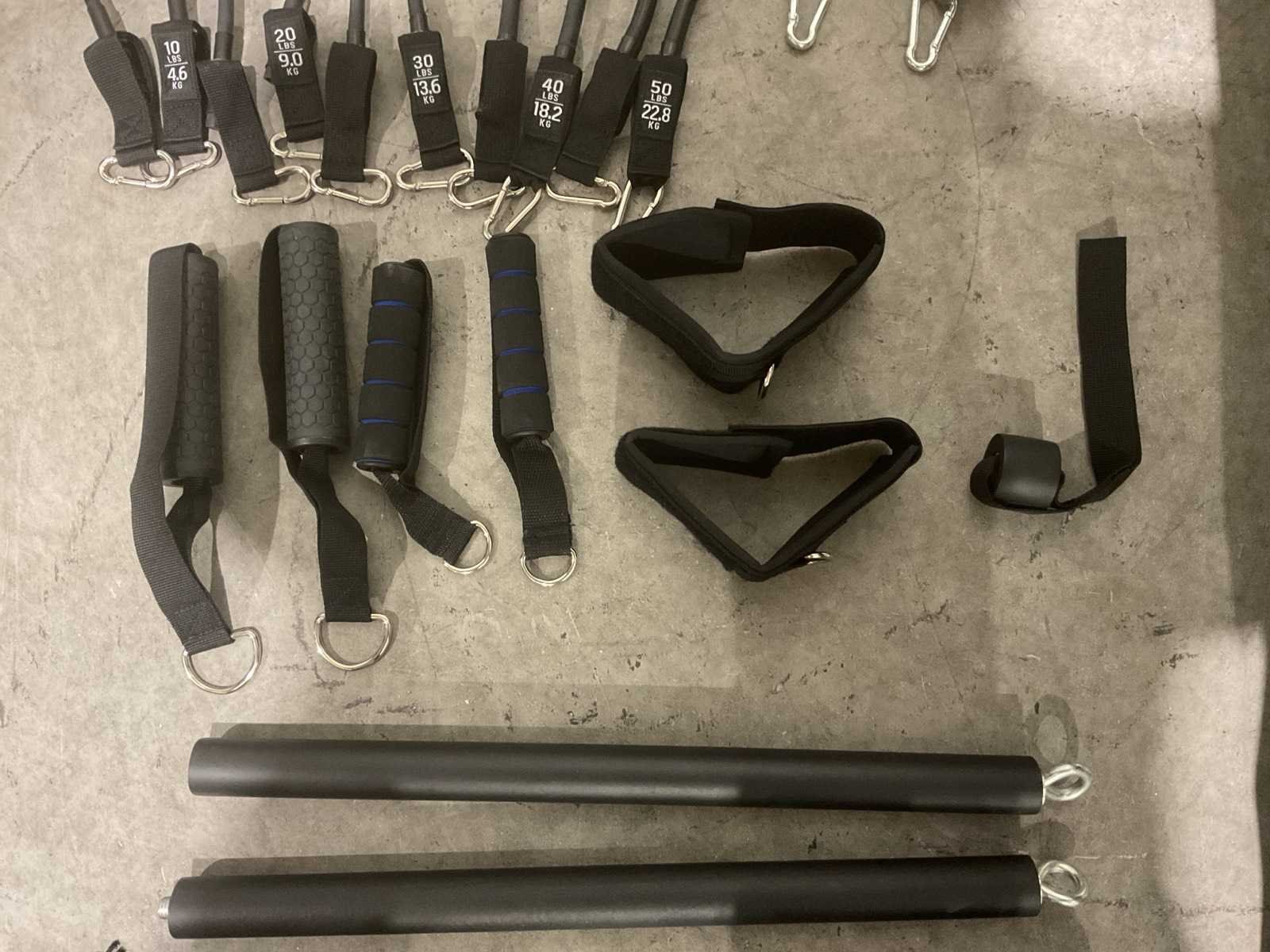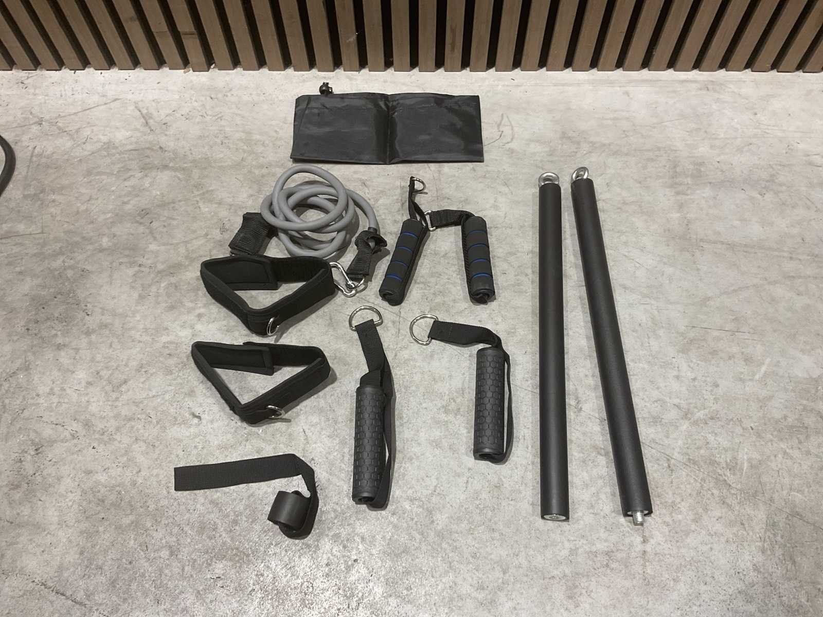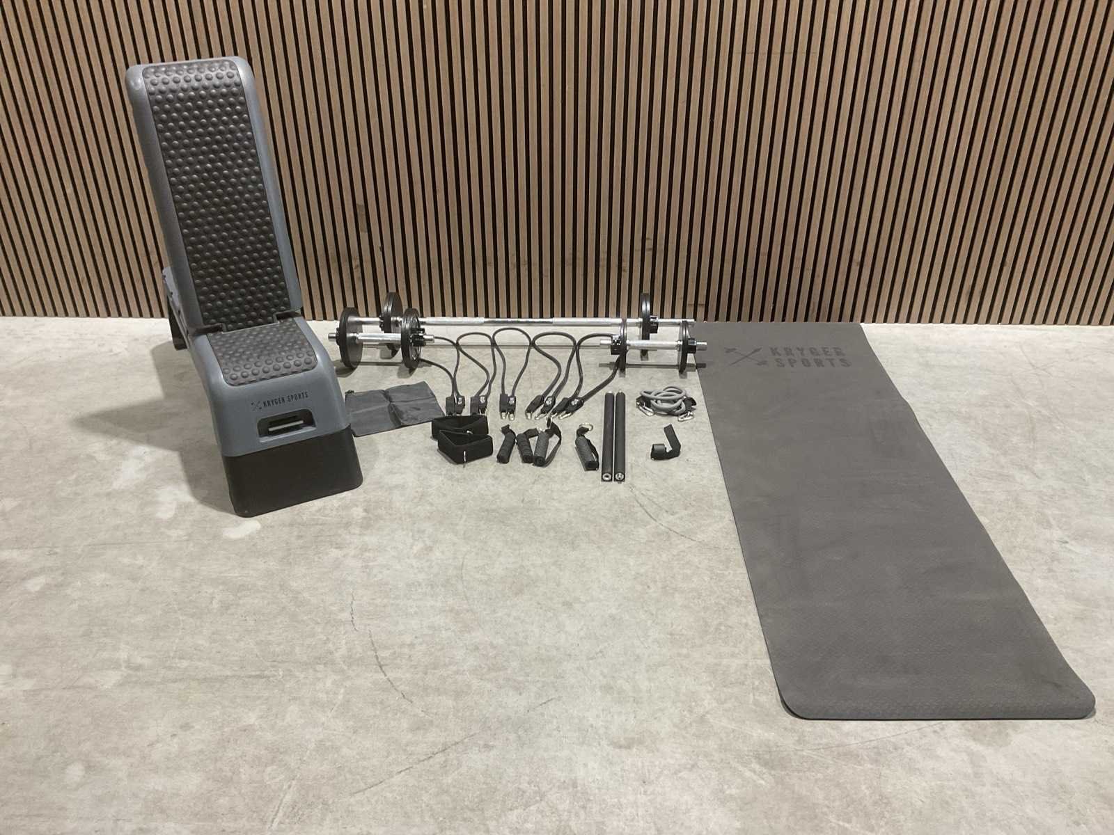 1x Barbell 120cm | 7KG 2x Dumbell 35cm | 2KG 6x Quick-release halterklemmen 4x Halterschijf 1.25kg black 8x Halterschijf 2.5kg black 2x Bar strap | enkelband 1x Single Grip | Deuranker 2x Eenhandsgreep 1x Elastiek 50lbs/22.7kg 1x Elastiek 40lbs/18.2kg 1x Elastiek 30lbs/13.6kg 1x Elastiek 20lbs/9.1kg 1x Elastiek 10lbs/4.6kg 10x Stalen Karabijnhaak 1x Fitnessmat 1x Compacte halterbank Transport doos 1 - 30kg 1230x245x500 mm doos 2 - 25 kg 205x205x205 Merk: Kryger Sports