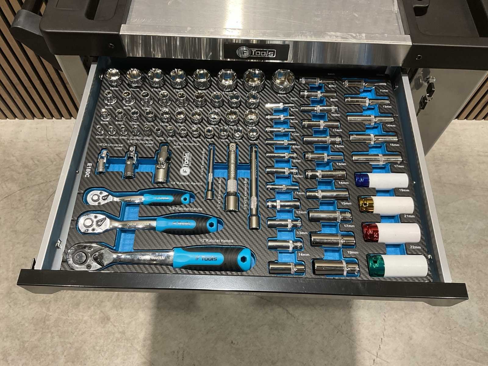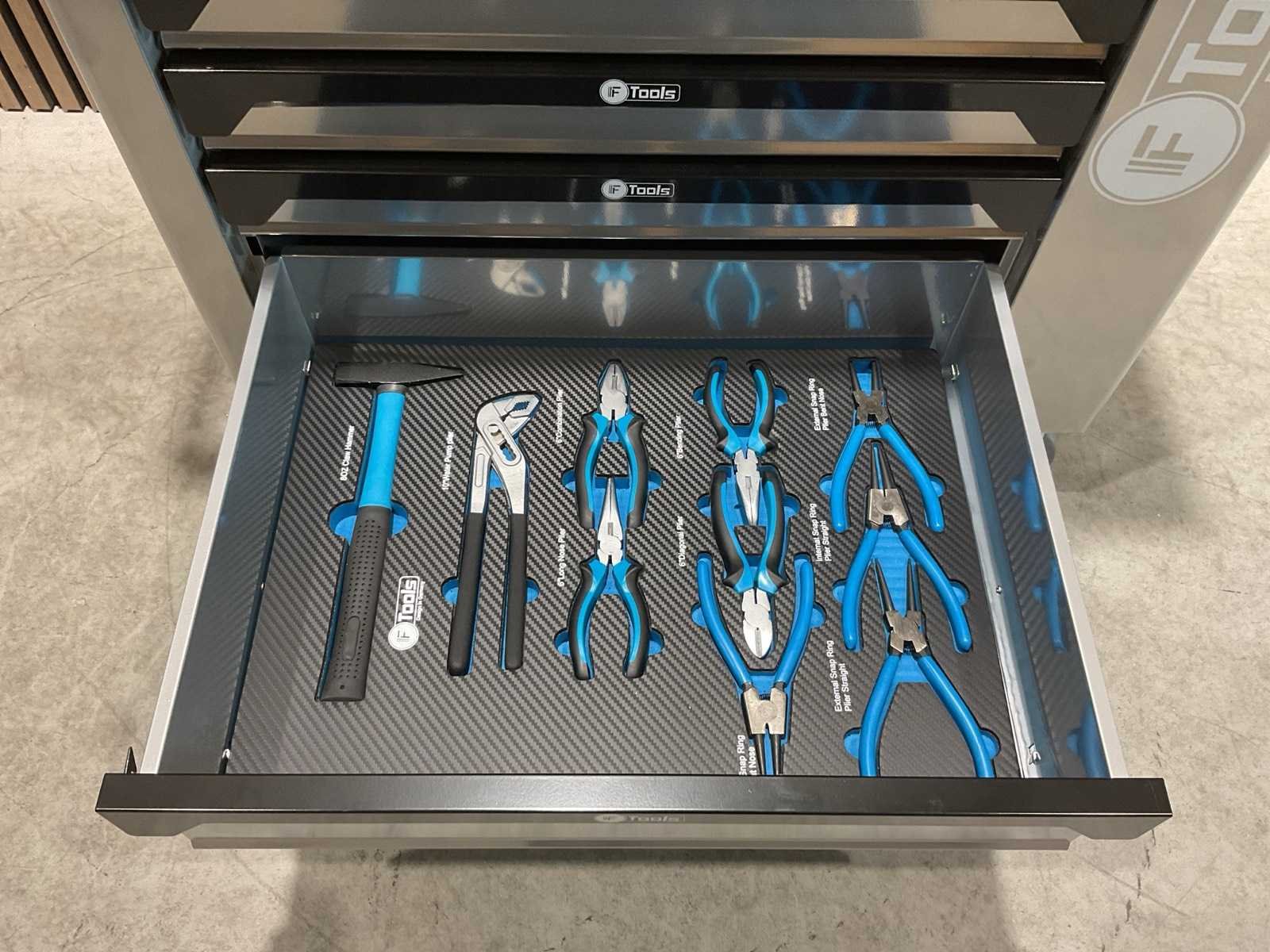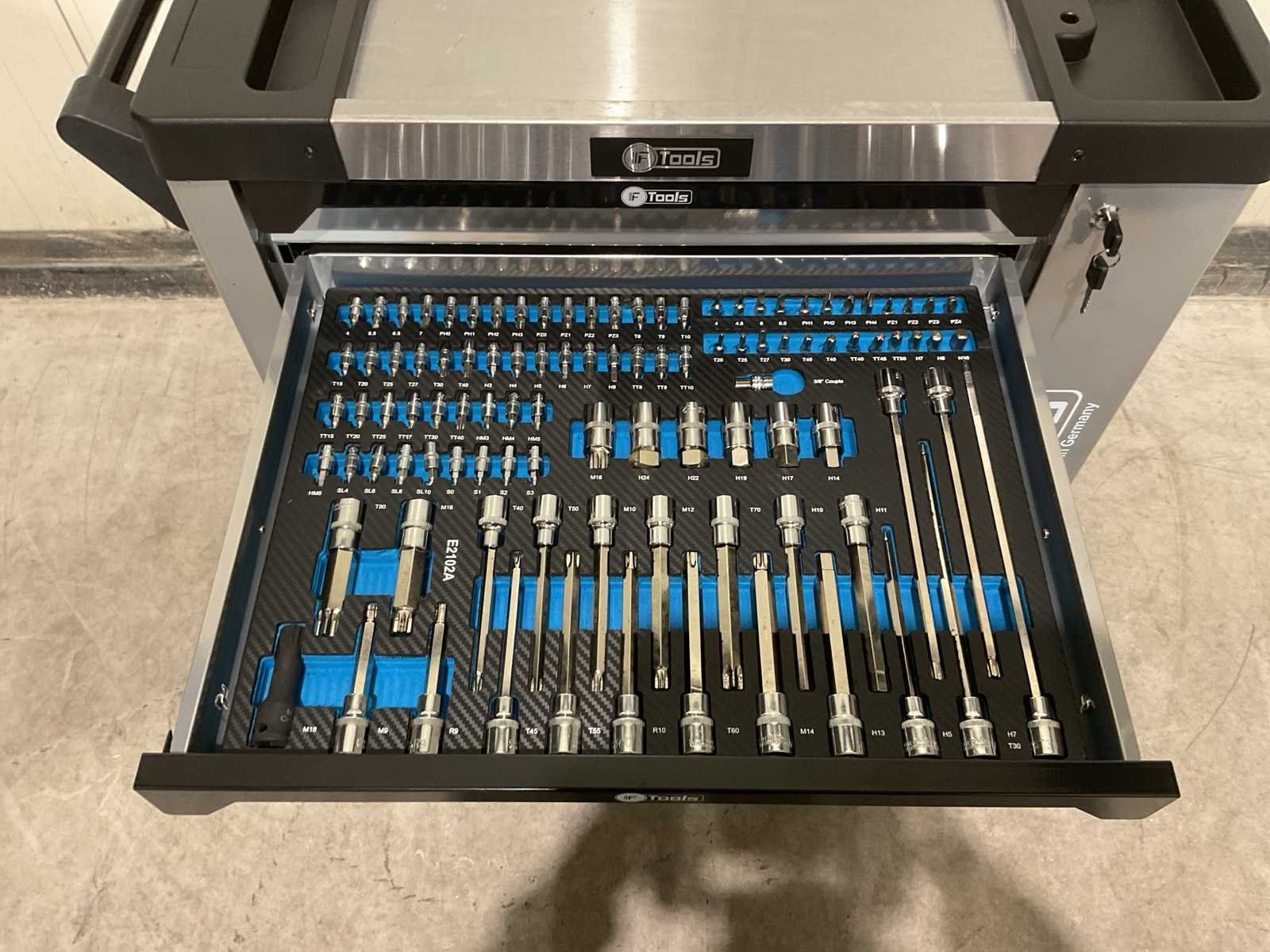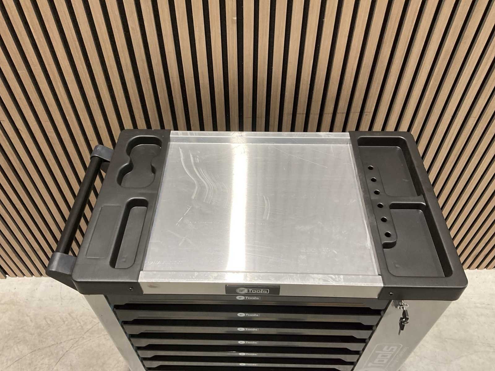 Voorzien van 8 gevulde lades; Ladegeleiding: Kogellager geleiders; Ladevergrendeling: Centrale vergrendeling met zijslot; Inhoud: Gevulde EVA / foam inlays met handgereedschap; Werkblad: Stalen top; Wielen: 4 zwenkwielen (waarvan 2 met rem; Transport 79kg 790x480x860 mm; Ongebruikt in doos Merk: Ftools Type: XXL 8/8 FT3007