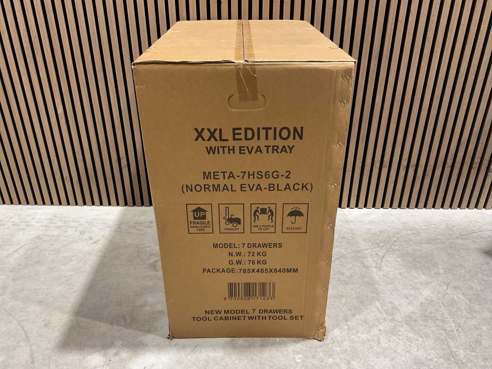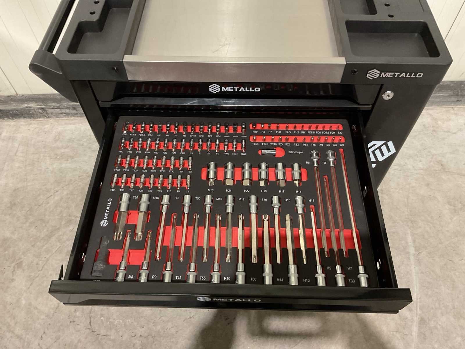 Voorzien van 7 lades; gevuld met gereedschap; eigen gewicht 72kg; zijvak met deur; kogellager geleider; centrale vergrendeling; 2 stabiele wielen; 2 zwenkbare wielen met rem; Transport gewicht: 76kg; transport afmetingen: 785x485x840mm; ongebruikt in doos Merk: Metallo Type: Meta-7HS6G-2 EVA-BLACK Aantal laden: 7 Met inhoud: true Eigen gewicht: 72kg Totale afmeting L: 820mm Totale afmeting Breedte: 455mm Totale afmeting Hoogte: 950mm