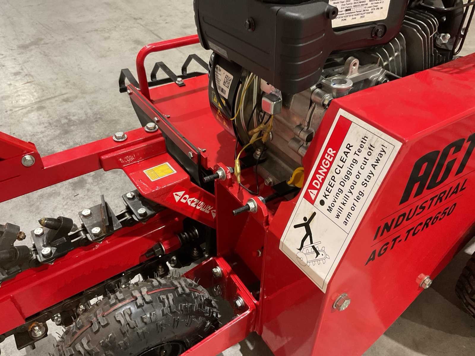 Voorzien van Motorvermogen: 6,5 hp benzine (RATO, trekstart); Sleufbreedte: 100 mm (4"); Sleufdiepte (instelbaar): 150 / 250 / 340 / 450 mm; Ketting-/zaagbladen: 21 stuks, hardmetaal (carbide alloy); Kettingsnelheid (max): 550 m/min; Kettinglengte: 1600 mm (≈ 63"); Graafcapaciteit (handleiding): 60 m/uur; Afmetingen (L×B×H): 69.3" × 27.6" × 35.4" (≈ 1760 × 701 × 899 mm); gewicht: 136kg Merk: AGT Type: TCR650 Bouwjaar: 2025