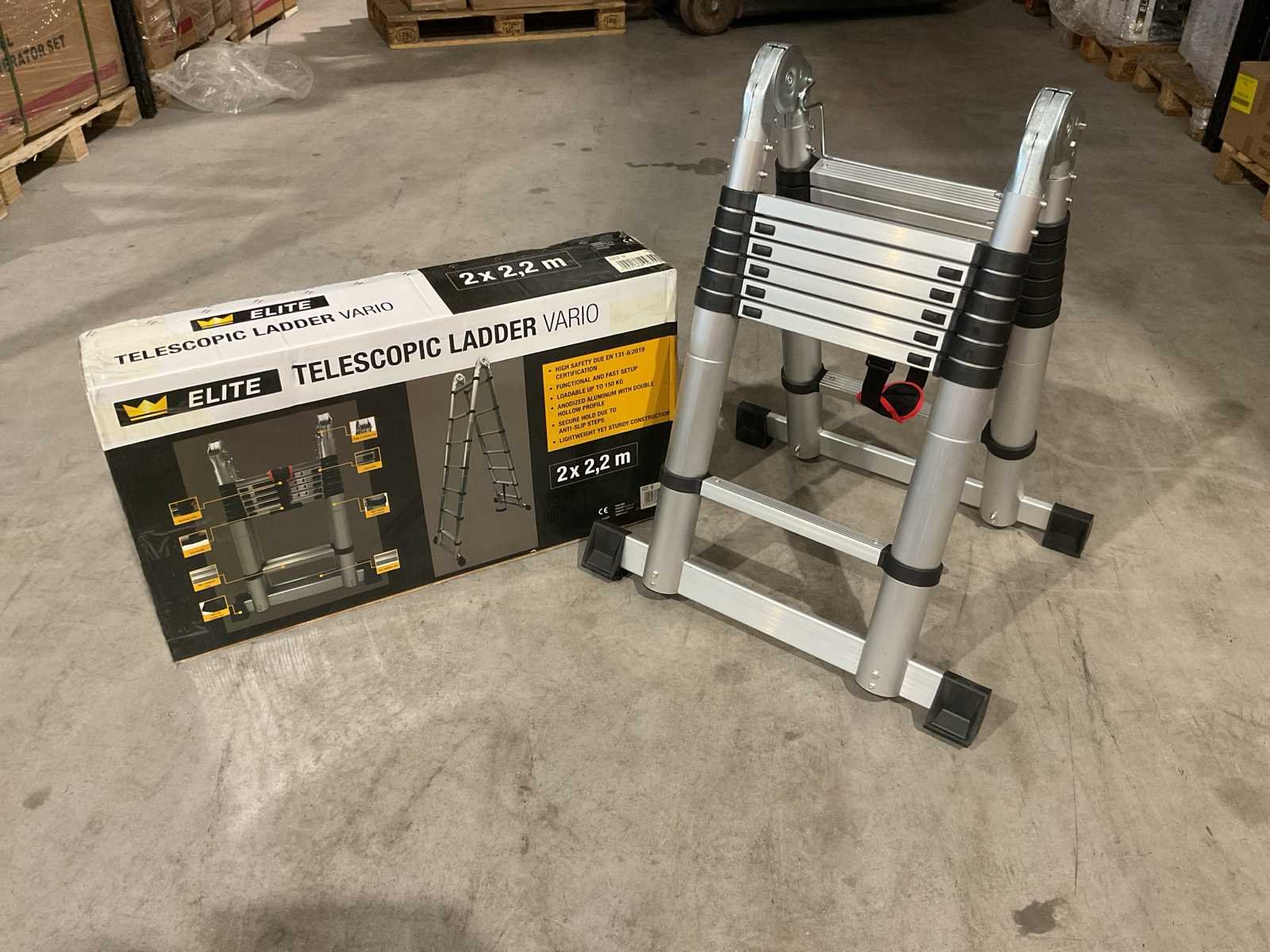 Voorzien van anti slip tredes; veiligheid band; ongebruikt in doos (transport afmetingen 90x50x20 cm) Merk: Elite Type: Vario 2x2,2 m Bouwjaar: 2025 Aantal treden: 16 Eigen gewicht: 18kg