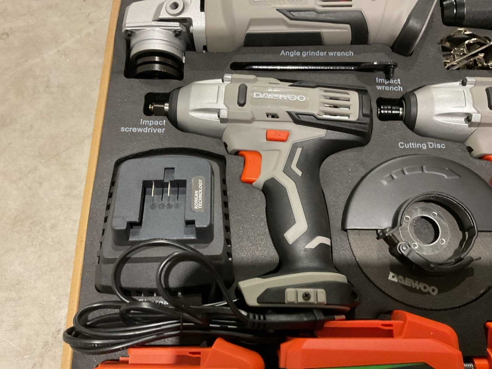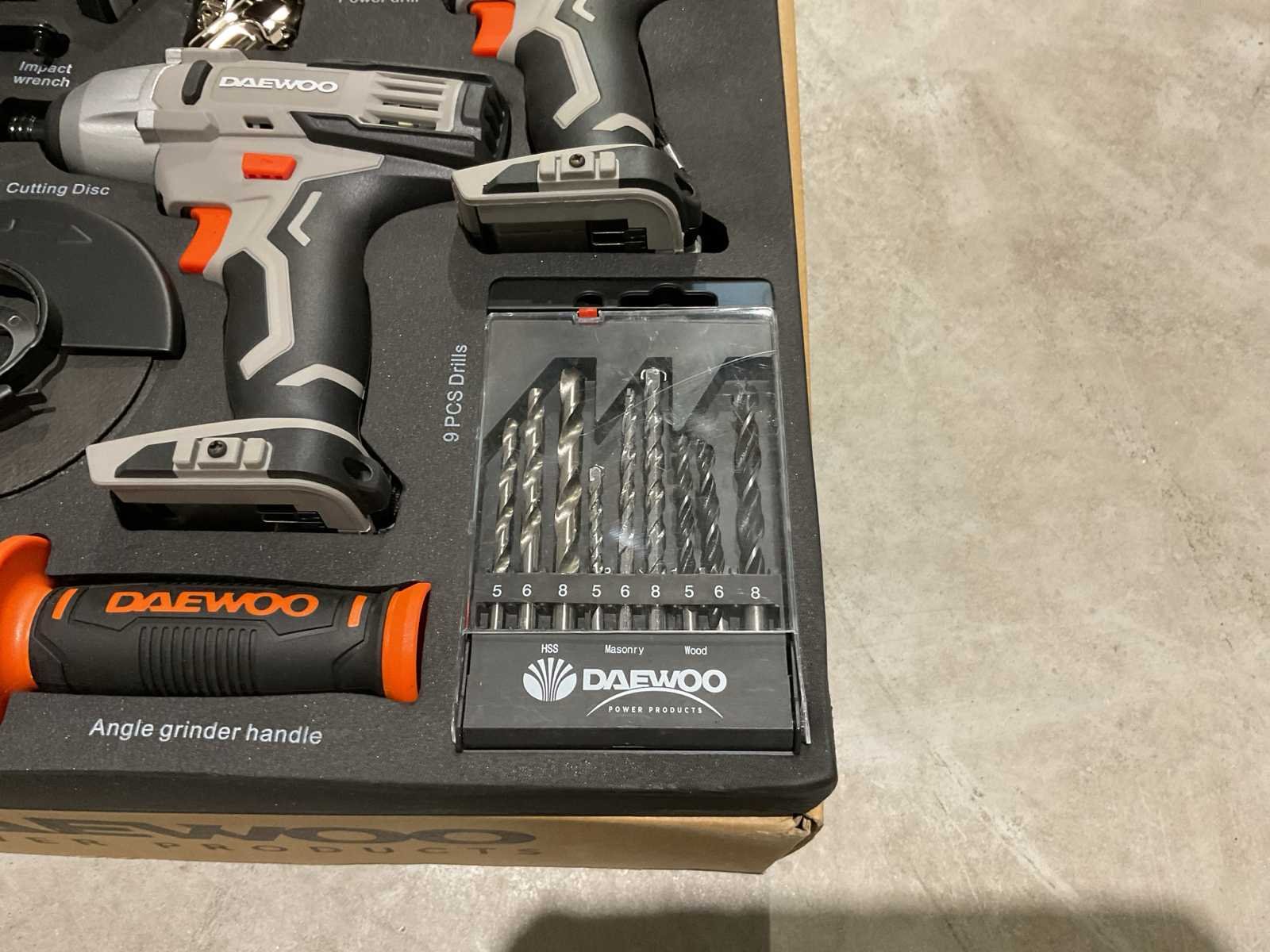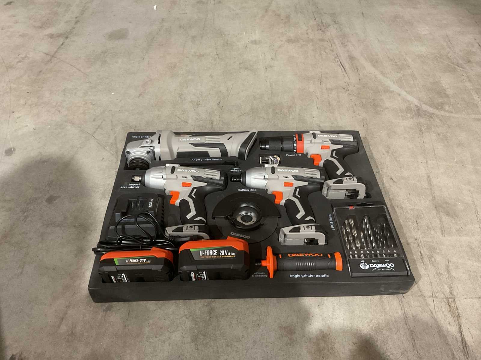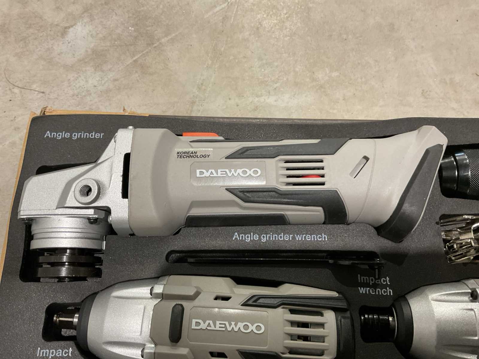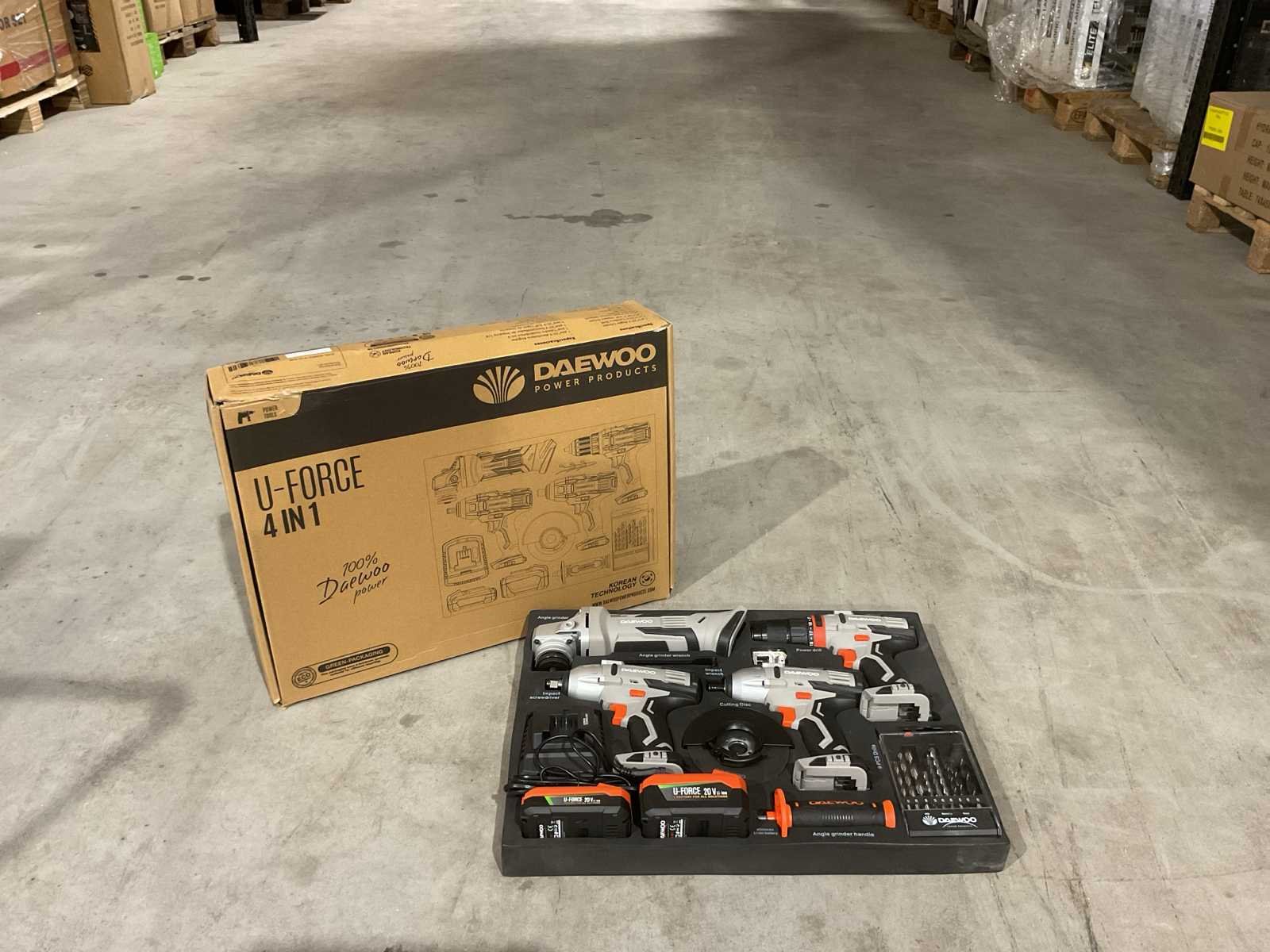 Voorzien van haakse slijper; slag moersleutel ; accu boormachine ; slag schroevendraaier; 2 accu; 4 slijpschijven; 3 steenboren 5-6-8; 3 staalboren 5-6-8; 3 houtboren 5-6-8; Ongebruikt in doos (Afmeting transport verpakking 405x560x120 mm lxbxh, gewicht 8 kg) Merk: Daewoo Type: U-FORCE 4 in 1 Bouwjaar: 2025 Delig: 4 Aansluiting: 20V