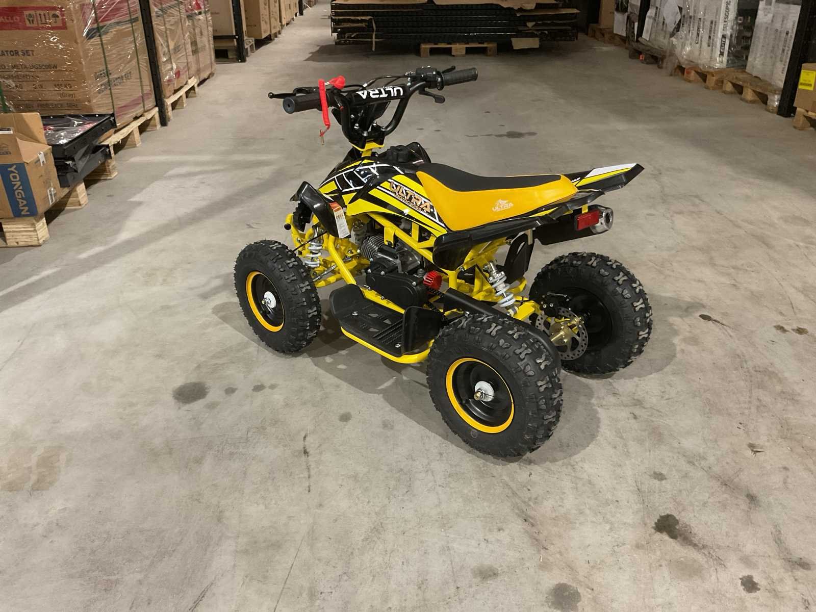 Voorzien van 49cc benzine motor; 2 takt; trek start; 3 verschillende snelheden; kill-switch; bandenmaat 6” inch; 2 sleutels; ongebruikt in doos (transport afmetingen 100x55x45 cm 36kg) Merk: Ultra Motocross Model: MA03 Product type: ATX 49 GE Gewicht: 34kg Aantal sleutels: 2 Transmissie: Automaat Bouwjaar: 2025 Cilinderinhoud: 49cc Brandstof: Benzine 2 Takt Kleur: Geel