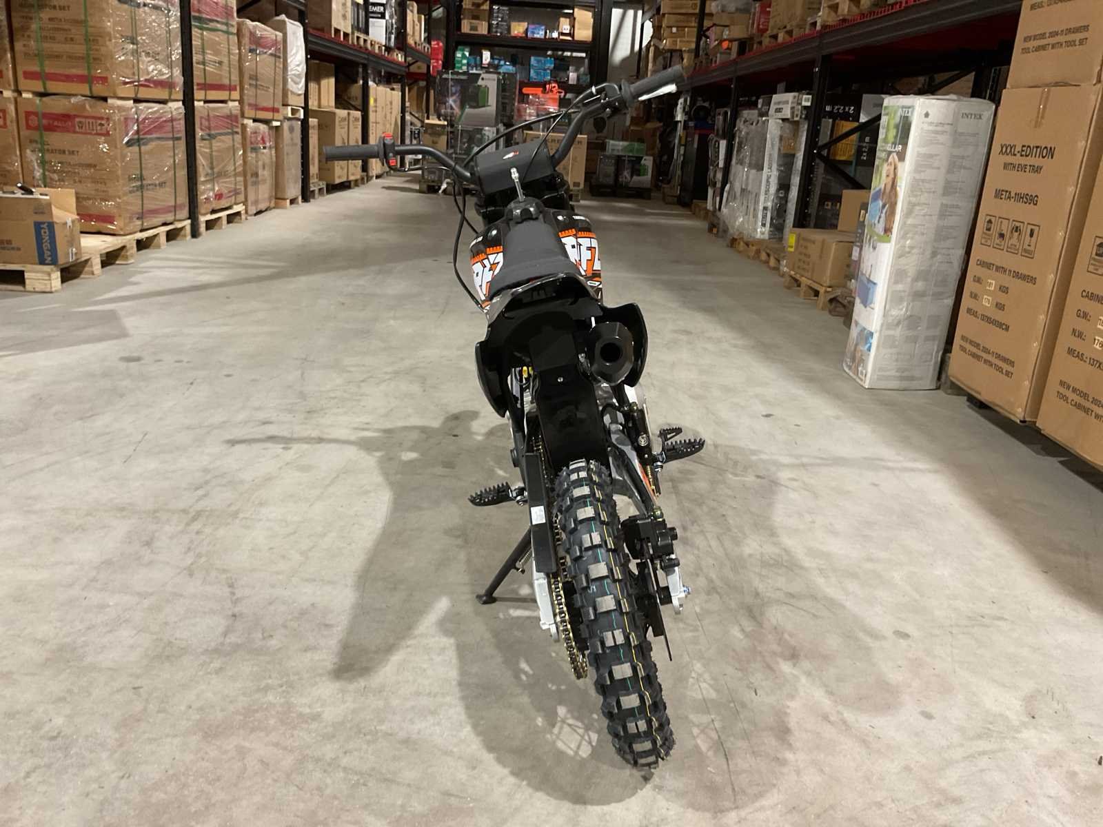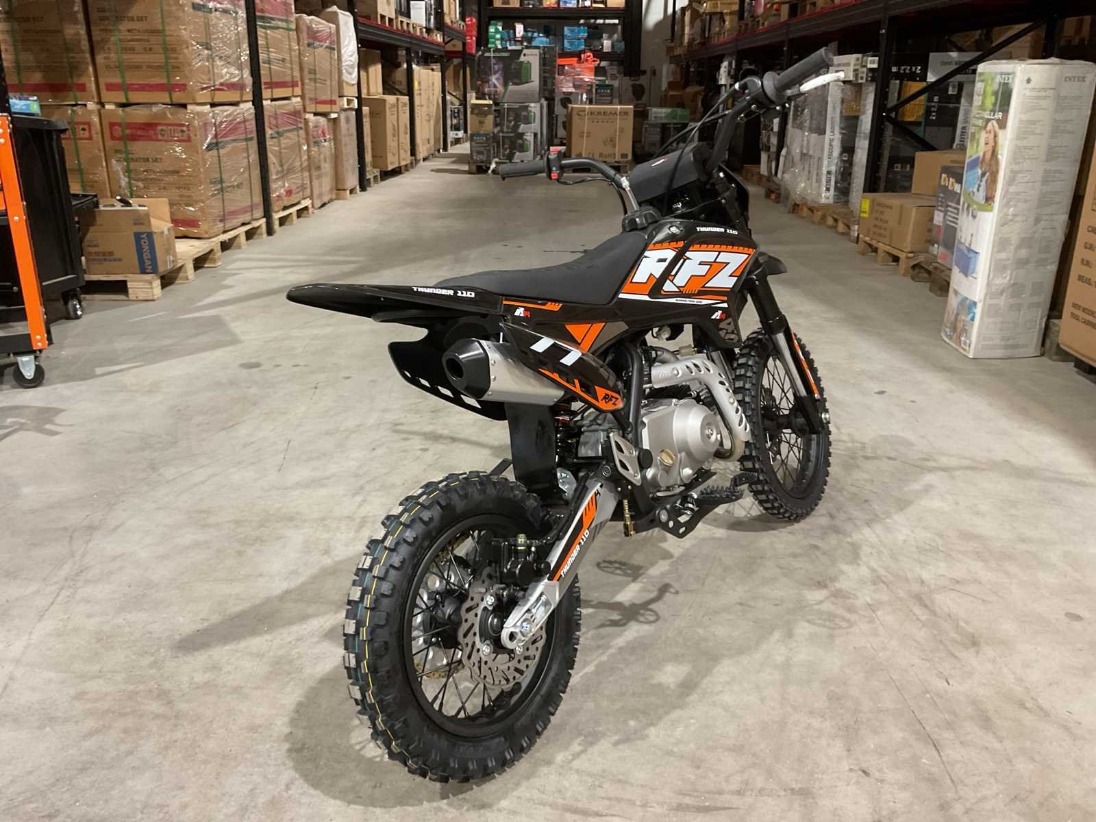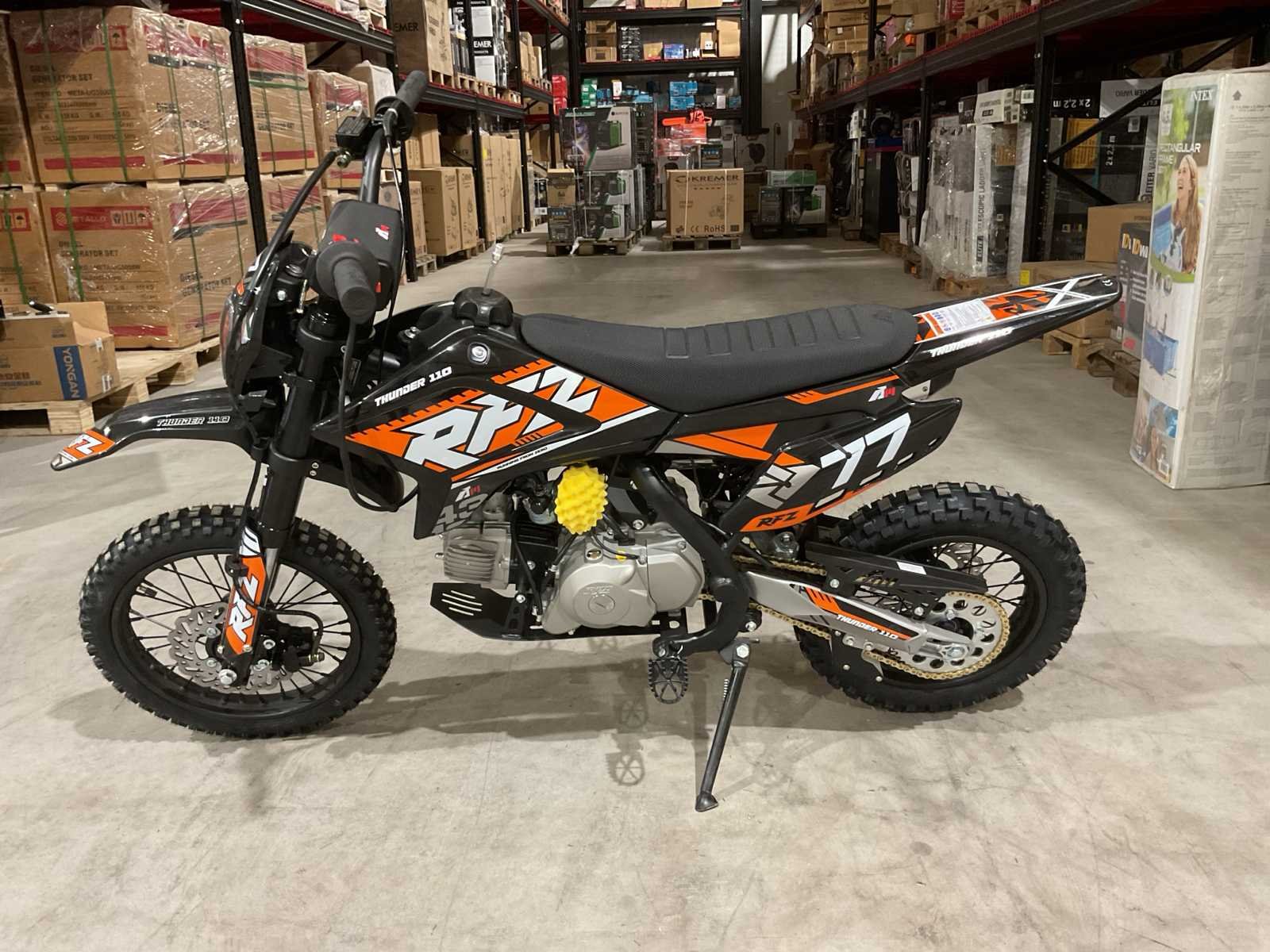 Voorzien van 110 cc motor; 4 takt; kick start; bandenmaat voor 14” inch achter 12” inch; hydraulische vering voor en achter; schijfremmen; verlichting; ongebruikt in doos (transport afmetingen 130x40x70 cm) Merk: Ultra Motocross Type: Thunder 110 OR Brandstof: Benzine 4 Takt Cilinderinhoud: 110cc Gewicht: 83kg Kleur: Oranje Transmissie: Automaat Aantal sleutels: 2