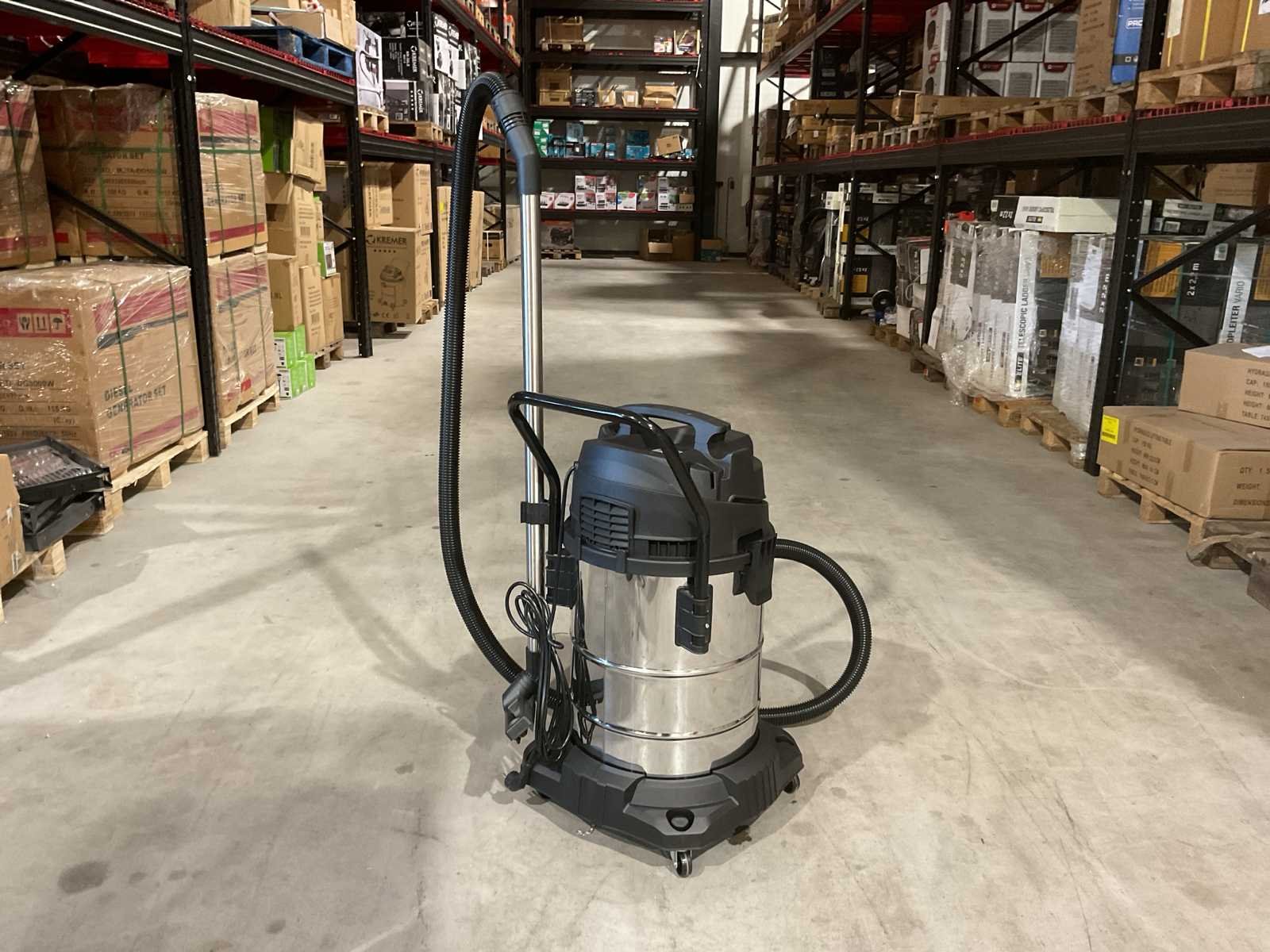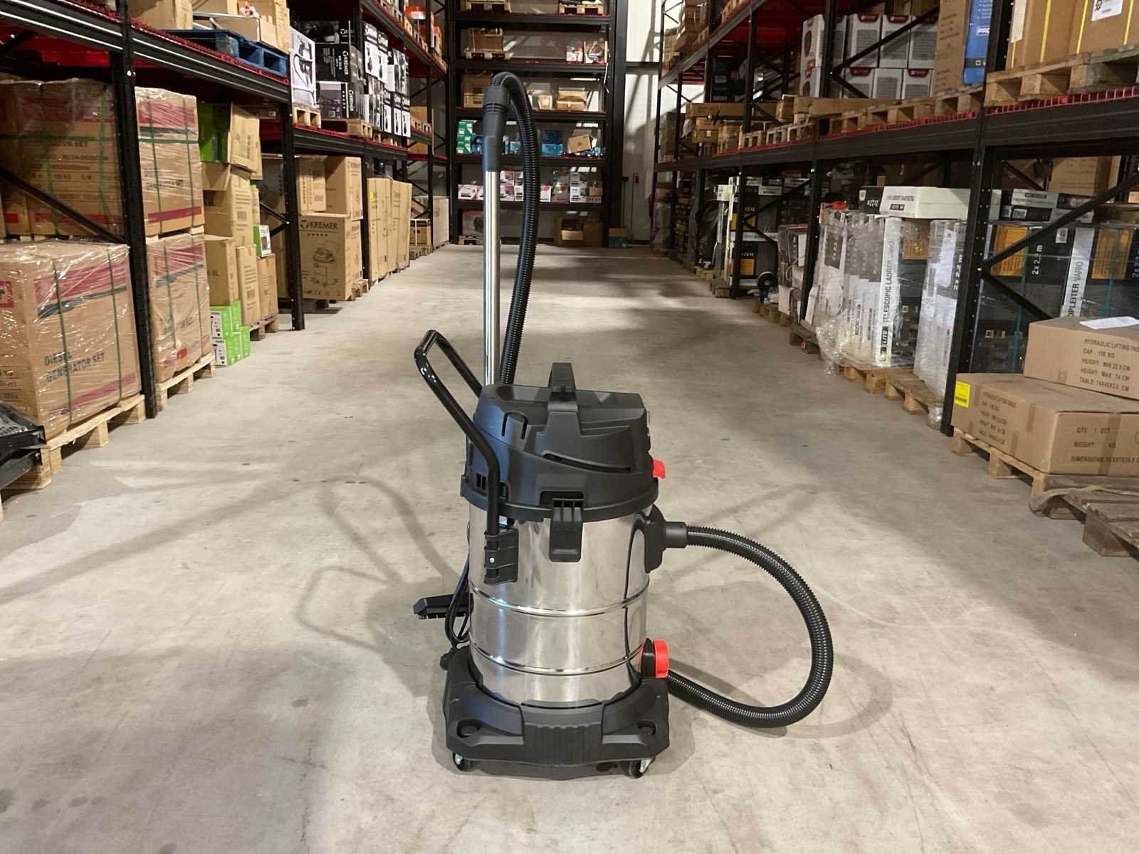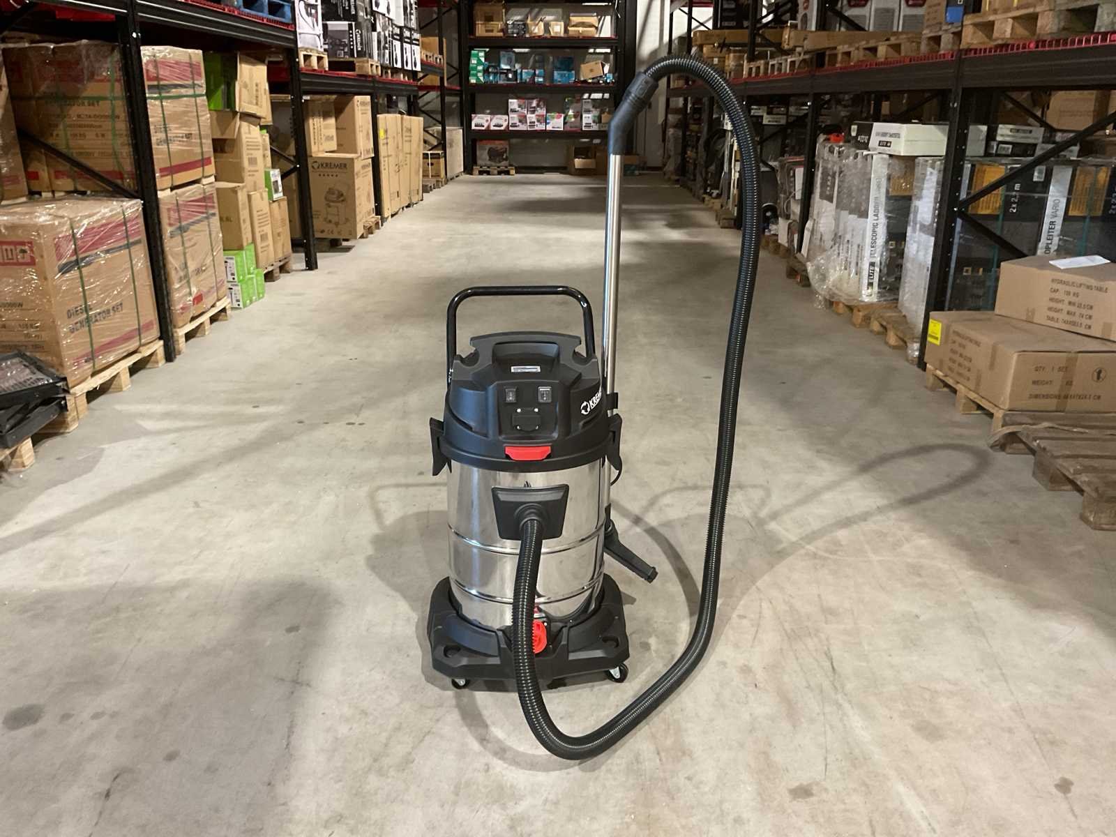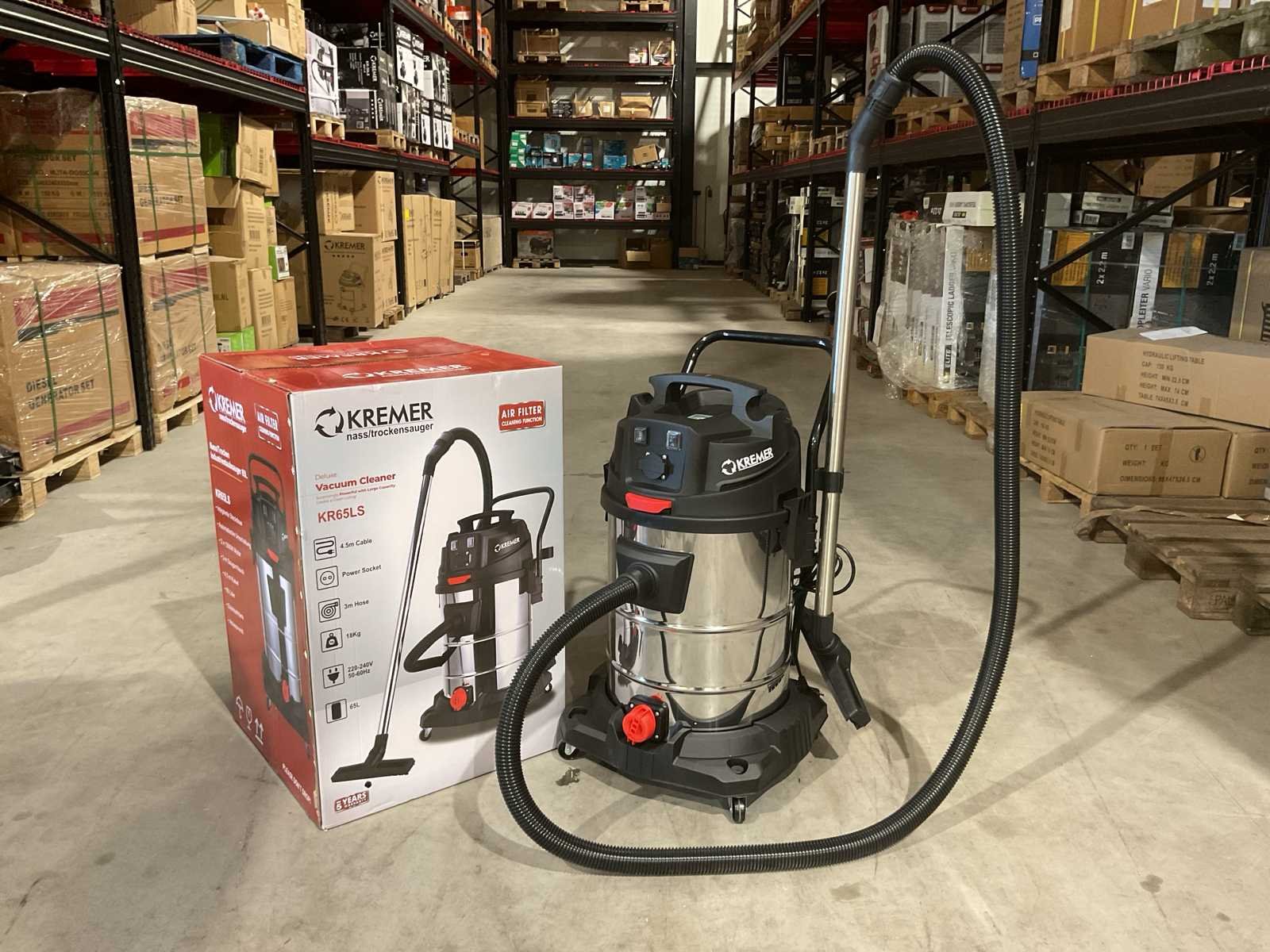 Voorzien van 4,5 meter kabel; 3mtr zuigslang; Nat- en droog stofzuiger; Inhoud 65 Liter; RVS Ketel; 2 Motoren onafhankelijk; 2000W; Klopfunctie; Blaasfunctie; Stopcontact; Externe machine start; Aflaat dop; 4 Zwenkwielen Ongebruikt in doos (Afmeting transport verpakking 550x550x850 mm lxbxh, gewicht 18 kg) Merk: Kremer Type: KR65LS Bouwjaar: 2025 Vermogen: 2400W Zakloos: true Nat/droog zuiger: true Stopcontact: true Aansluiting: 220V