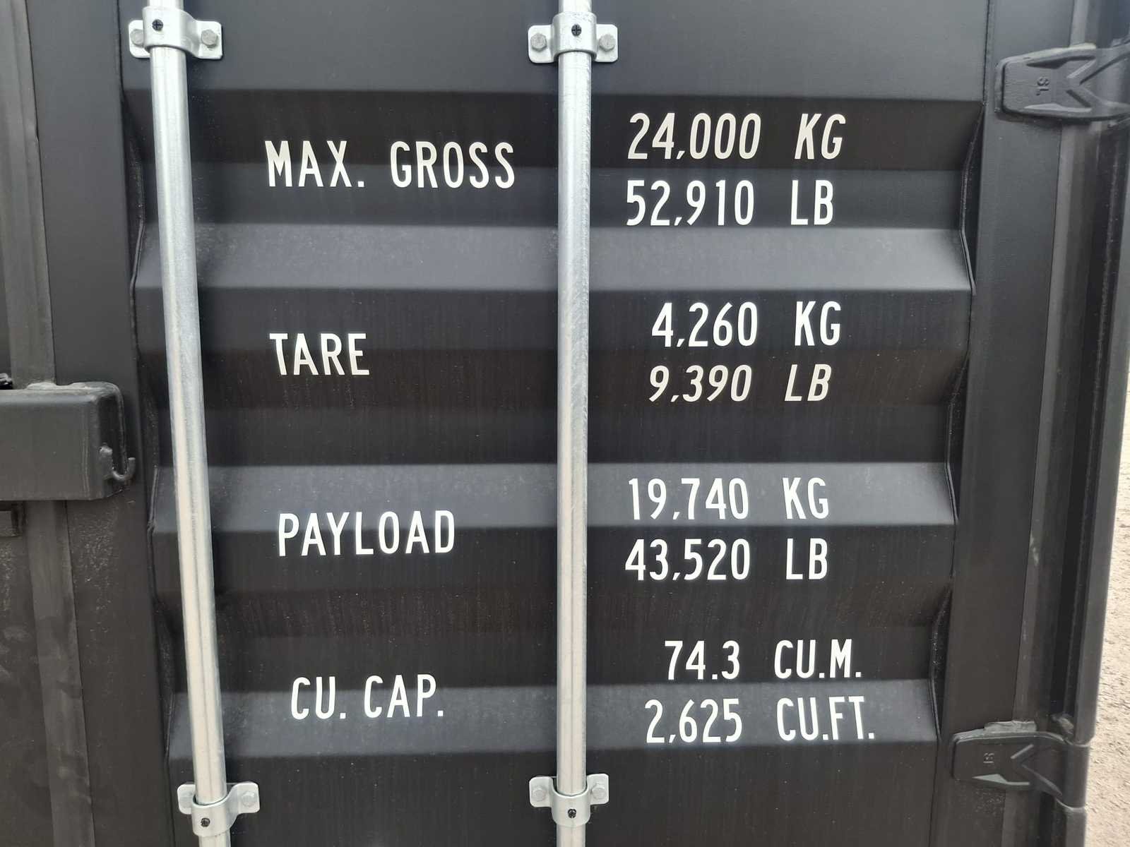 Voorzien van 4 separaat te openen zijdeuren en einddeur; slotkast; maximaal laadvermogen 24 Ton; ongebruikt Merk: Rhino-Cross-Containers Type: 40 ft High Cube Zwart Bouwjaar: 2025 Lengte (ft): 40 High cube: true Eigen gewicht: 4260kg Totale afmeting L: 12192mm Totale afmeting Breedte: 2438mm Totale afmeting Hoogte: 2896mm