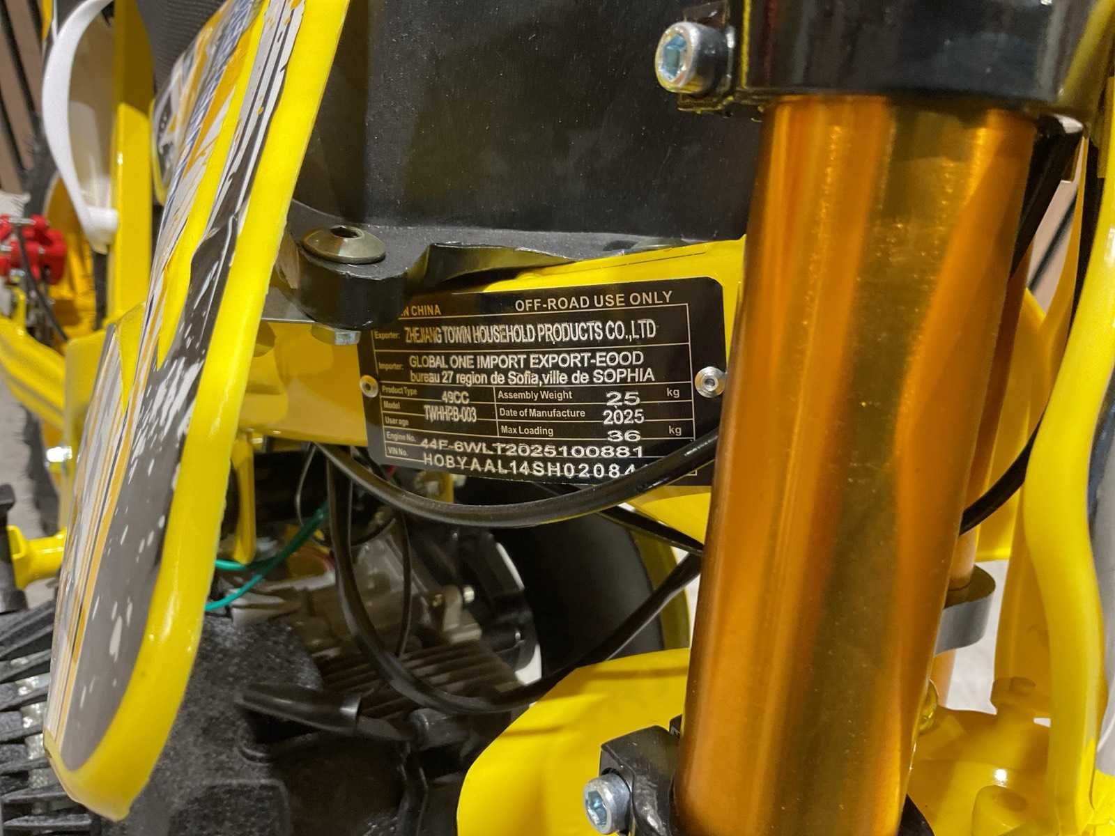 Voorzien van 49 cc, 2-takt benzinemotor luchtgekoeld; 3,5 pk; Trekstart; Transmissie: Automatische koppeling, kettingaandrijving; Mengsmering 2-takt; Top-snelheid: 40 km/u met snelheidsbegrenzers; Stalen buizenframe; Voor & achter schijfremmen; Voorvork + achter schokbrekers; Zithoogte: 55 CM; Max. laadvermogen: 60 kg; Gewicht: 22kg; Ongebruikt in doos (Transport 107x27.5x56cm, Gewicht 24kg) Merk: MMX Model: Dirt Bike 49cc Geel Type: TWHHPB-003 Brandstof: 2 takt Cilinderinhoud: 49cc Gewicht: 22kg Vermogen (kW): 3.5kW Kleur: Geel