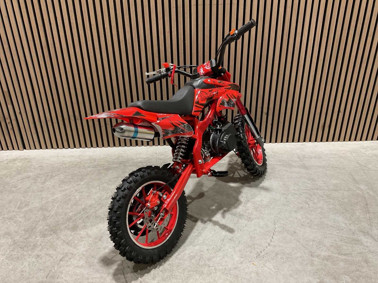 Voorzien van 49 cc, 2-takt benzinemotor luchtgekoeld; 3,5 pk; Trekstart; Transmissie: Automatische koppeling, kettingaandrijving; Mengsmering 2-takt; Top-snelheid: 40 km/u met snelheidsbegrenzers; Stalen buizenframe; Voor & achter schijfremmen; Voorvork + achter schokbrekers; Zithoogte: 55 CM; Max. laadvermogen: 60 kg; Gewicht: 22kg; Ongebruikt in doos (Transport 107x27.5x56cm, Gewicht 24kg) Merk: MMX Model: Dirt Bike 49cc Rood Type: TWHHPB-003 Brandstof: 2 takt Cilinderinhoud: 49cc Gewicht: 22kg Vermogen (kW): 3.5kW Kleur: Rood