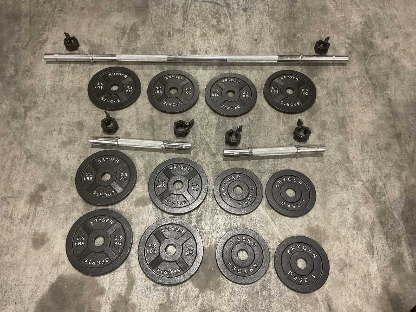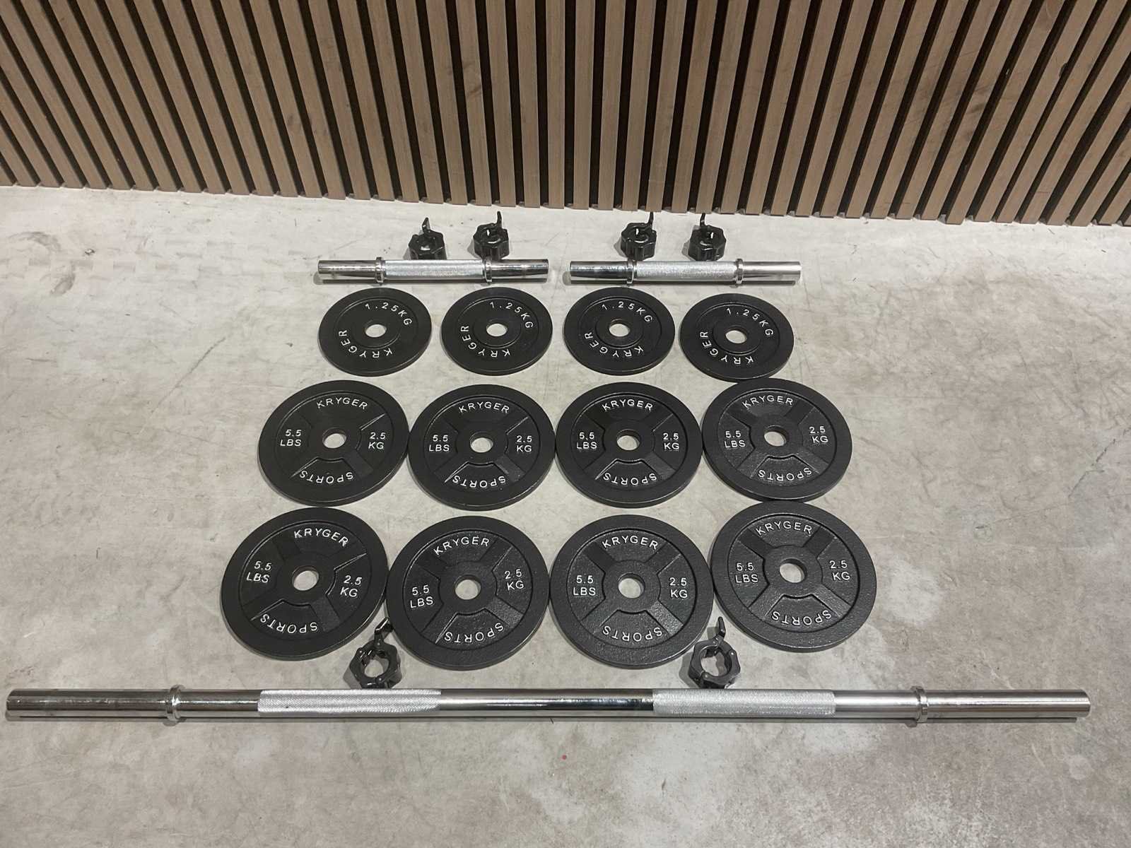 1x Barbell 120cm | 7KG 2x Dumbell 35cm | 2KG 6x Quick-release halterklemmen 4x Halterschijf 1.25kg black 8x Halterschijf 2.5kg black 2x Bar strap | enkelband 1x Single Grip | Deuranker 2x Eenhandsgreep 1x Elastiek 50lbs/22.7kg 1x Elastiek 40lbs/18.2kg 1x Elastiek 30lbs/13.6kg 1x Elastiek 20lbs/9.1kg 1x Elastiek 10lbs/4.6kg 10x Stalen Karabijnhaak 1x Fitnessmat 1x Compacte halterbank Transport doos 1 - 30kg 1230x245x500 mm doos 2 - 25 kg 205x205x205 Merk: Kryger Sports