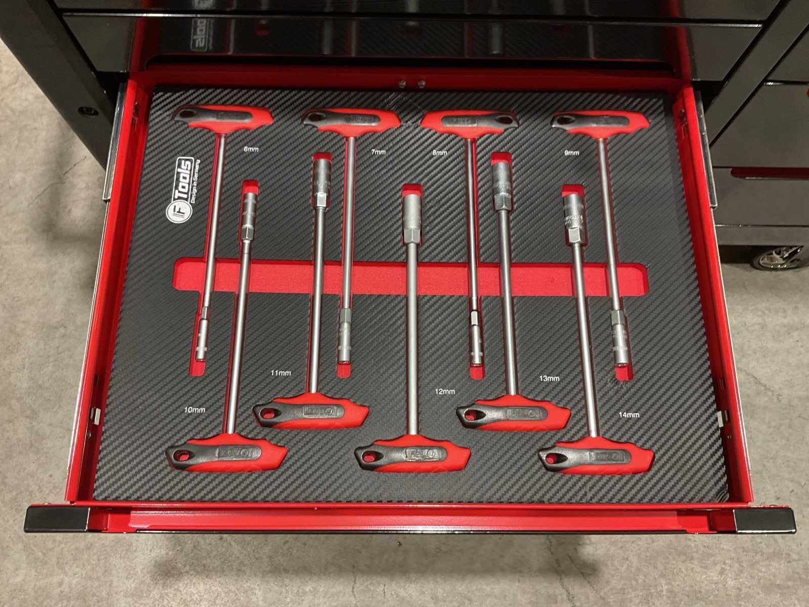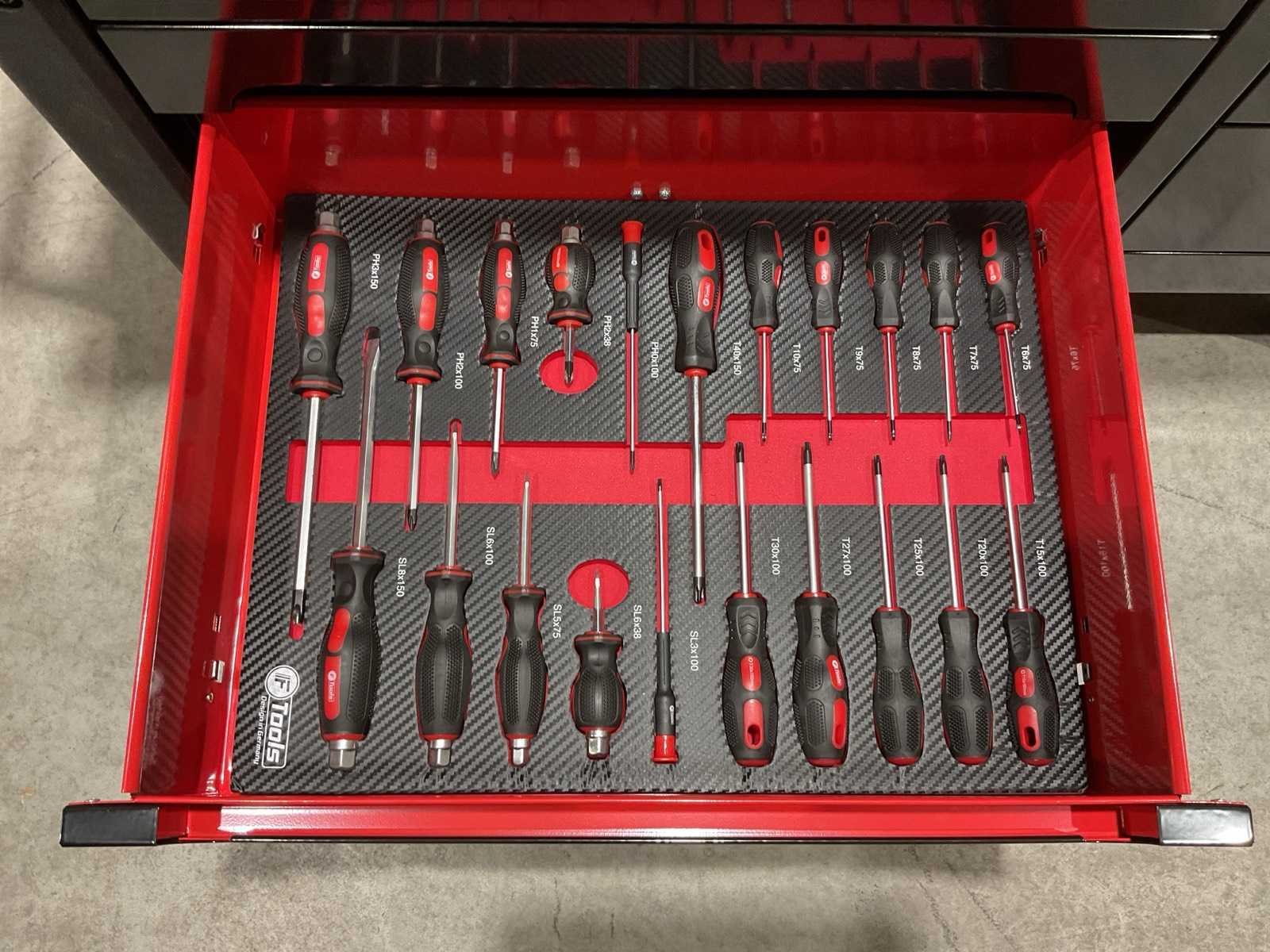 Voorzien van 11 lades; 10 gevuld; divers gereedschap; Materiaal: staal; 2 vaste wiel; 2 zwenkwielen; transport gewicht: 122kg; transport afmetingen: 1086x510x870 mm; ongebruikt in doos Merk: Ftools Type: Tool Trolley Black & Red