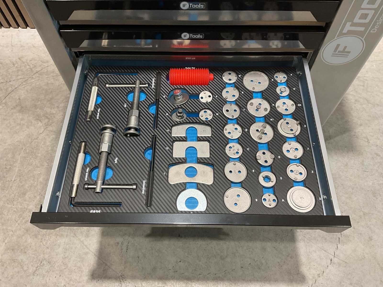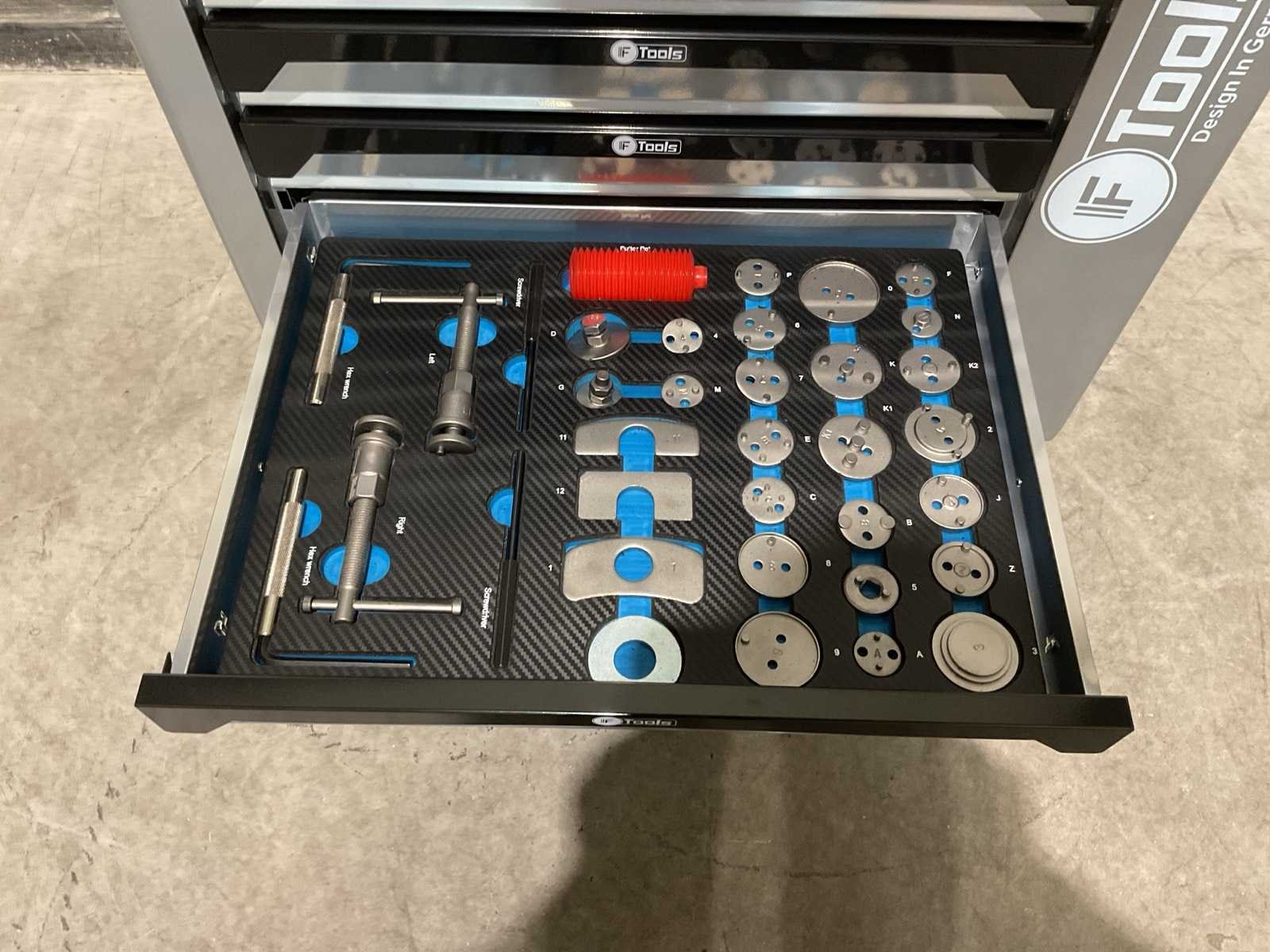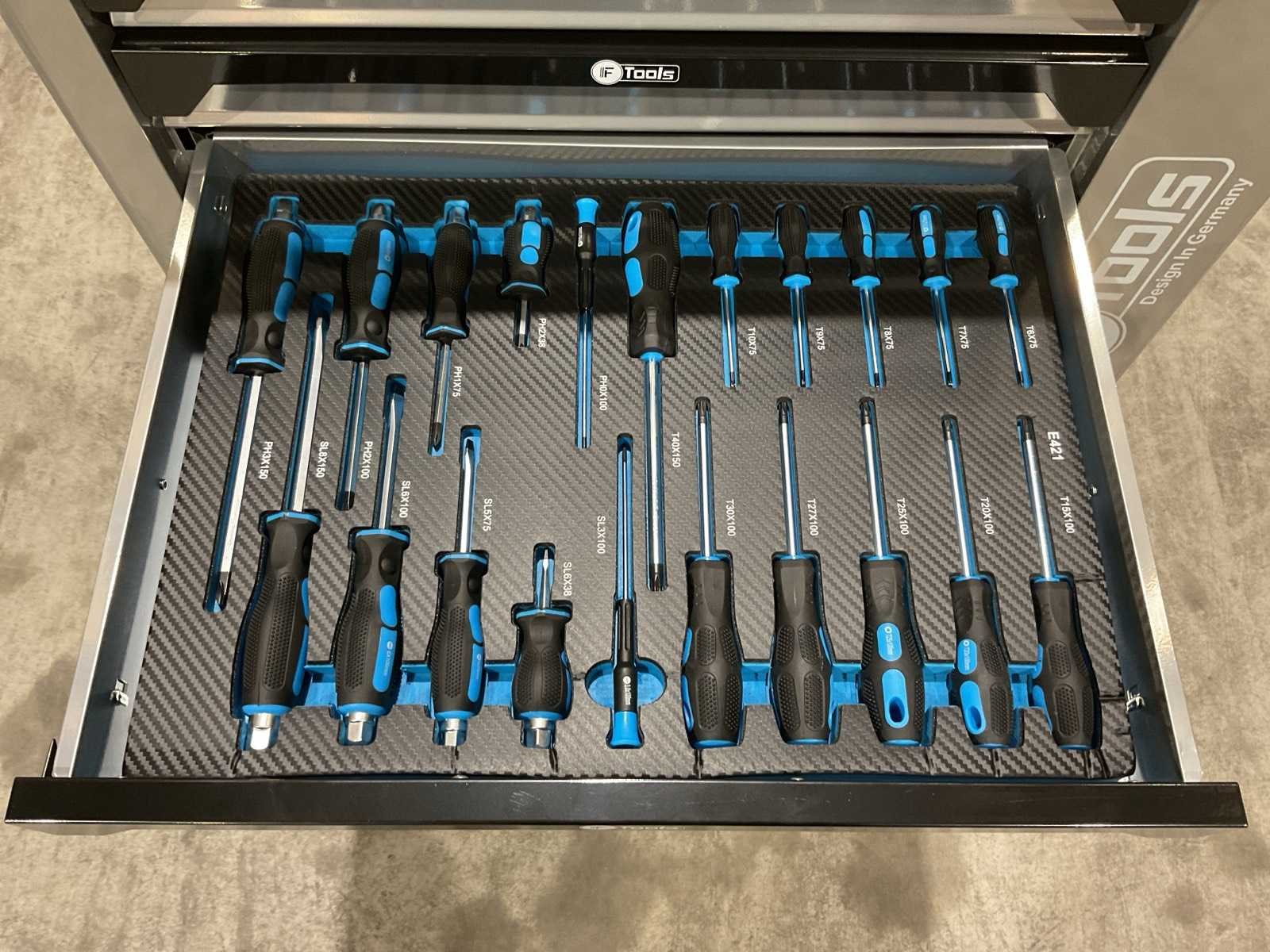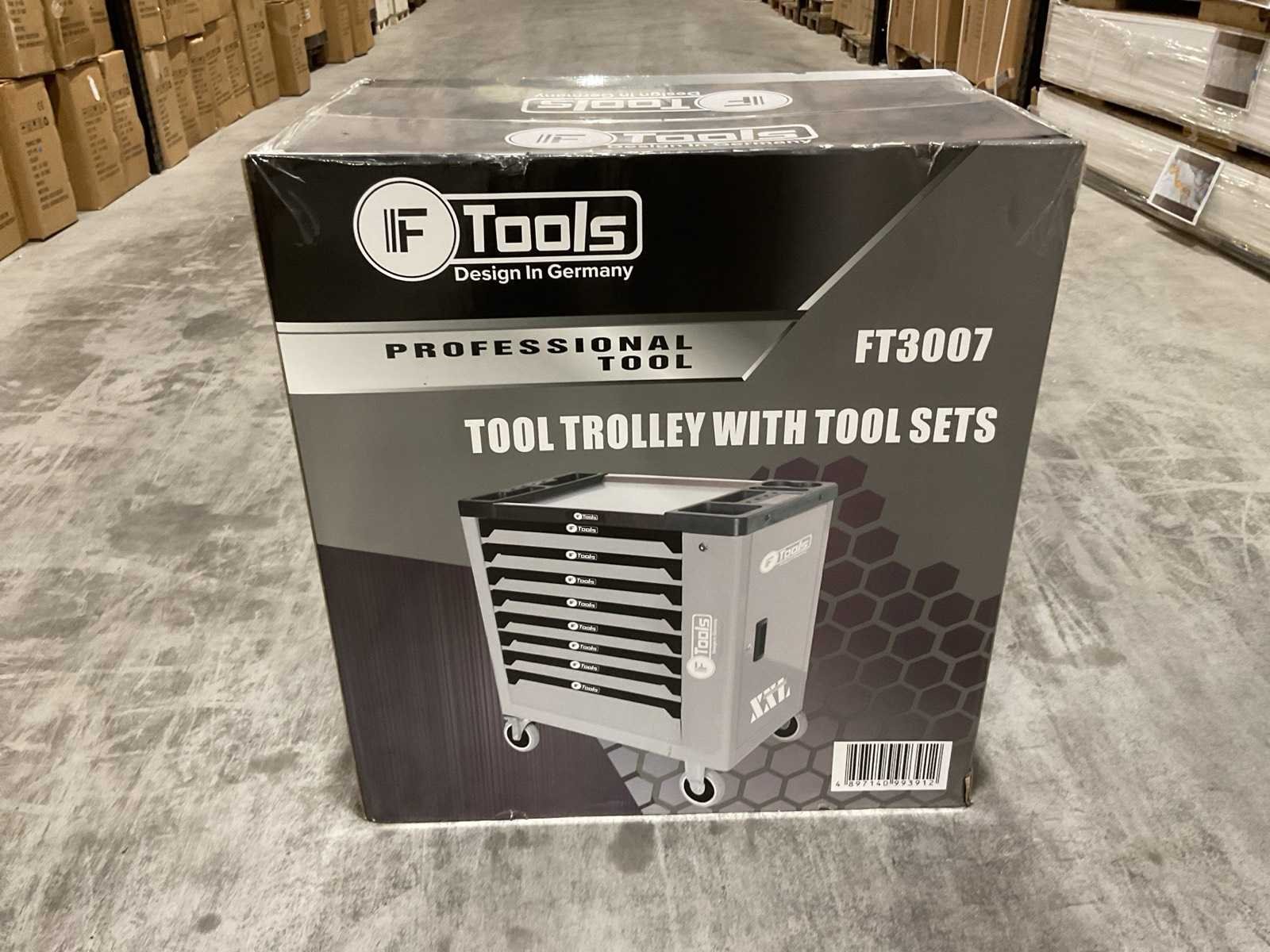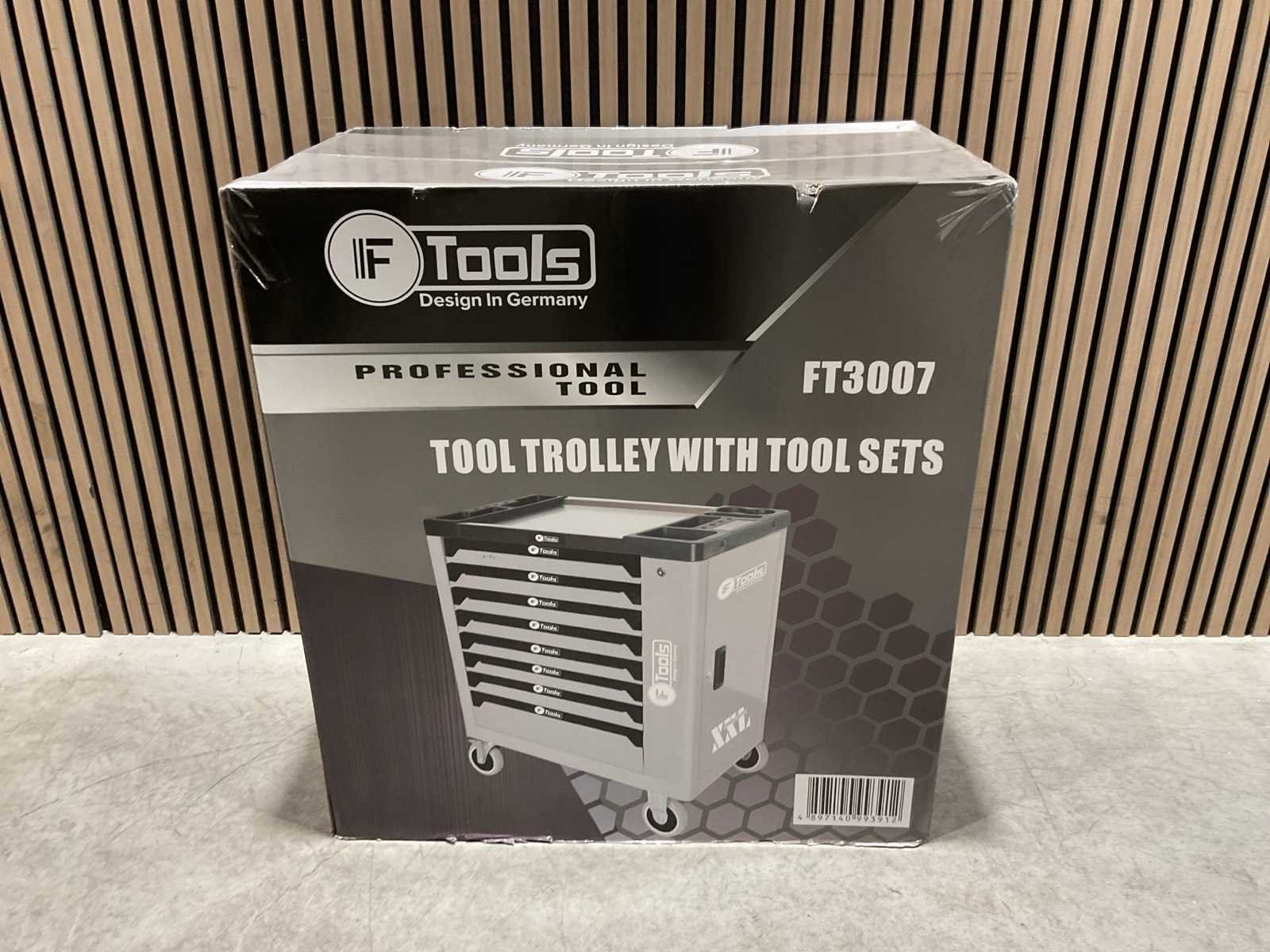 Voorzien van 8 gevulde lades; Ladegeleiding: Kogellager geleiders; Ladevergrendeling: Centrale vergrendeling met zijslot; Inhoud: Gevulde EVA / foam inlays met handgereedschap; Werkblad: Stalen top; Wielen: 4 zwenkwielen (waarvan 2 met rem; Transport 79kg 790x480x860 mm; Ongebruikt in doos Merk: Ftools Type: XXL 8/8 FT3007