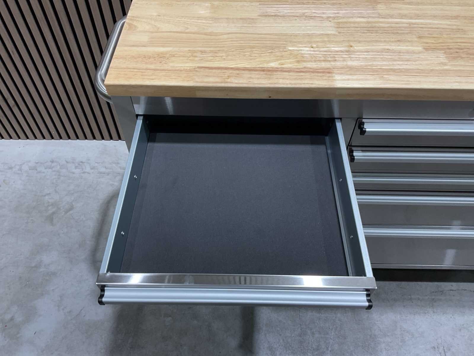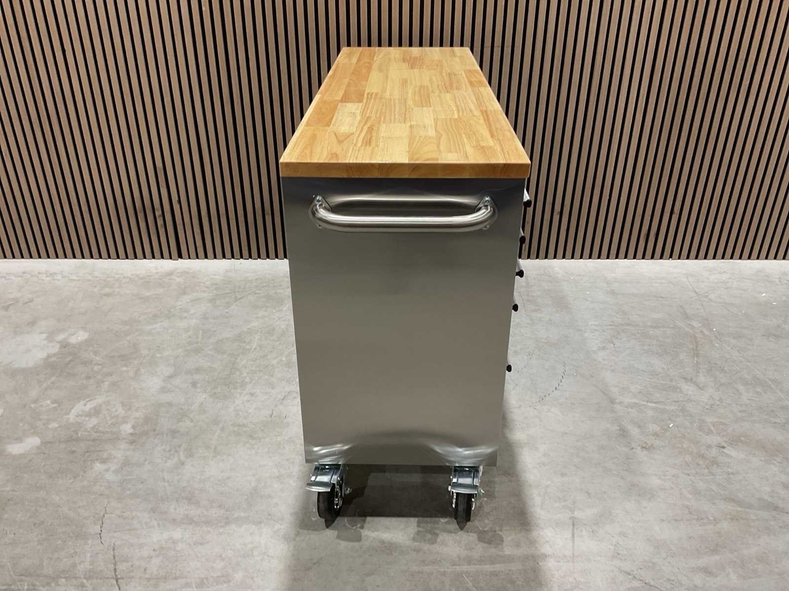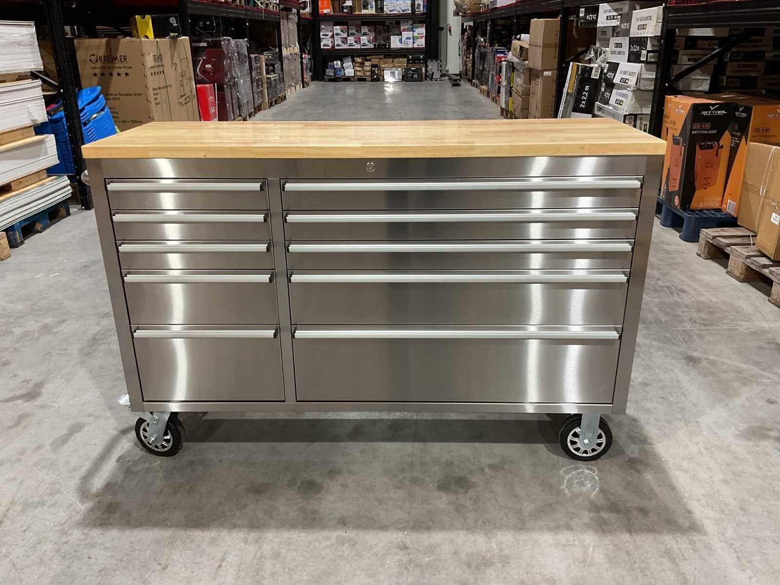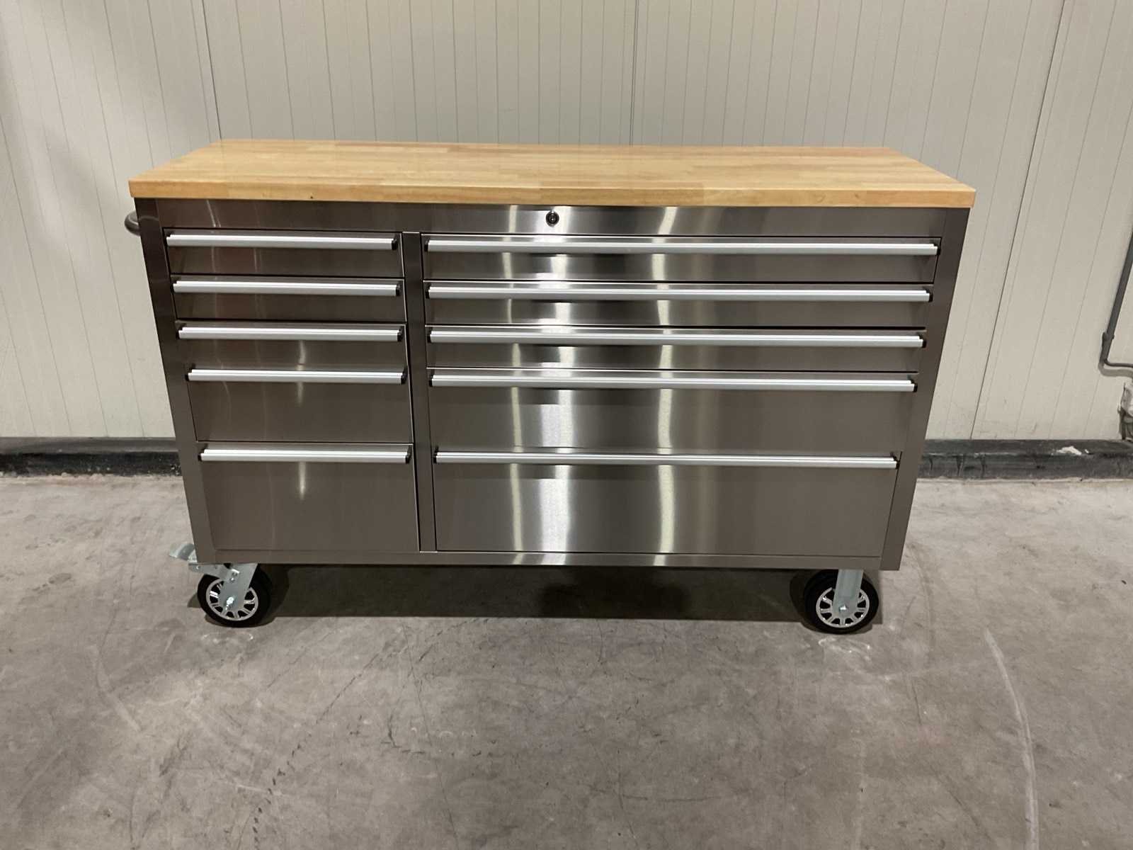 Voorzien van Materiaal: RVS; 10 lades; centraal slot; 4 wielen 2x zwenk met rem; transport gewicht: 104 kg; transport afmetingen: 146x54,5x87 cm; ongebruikt in doos Merk: 55” RVS Type: HTC5510W1