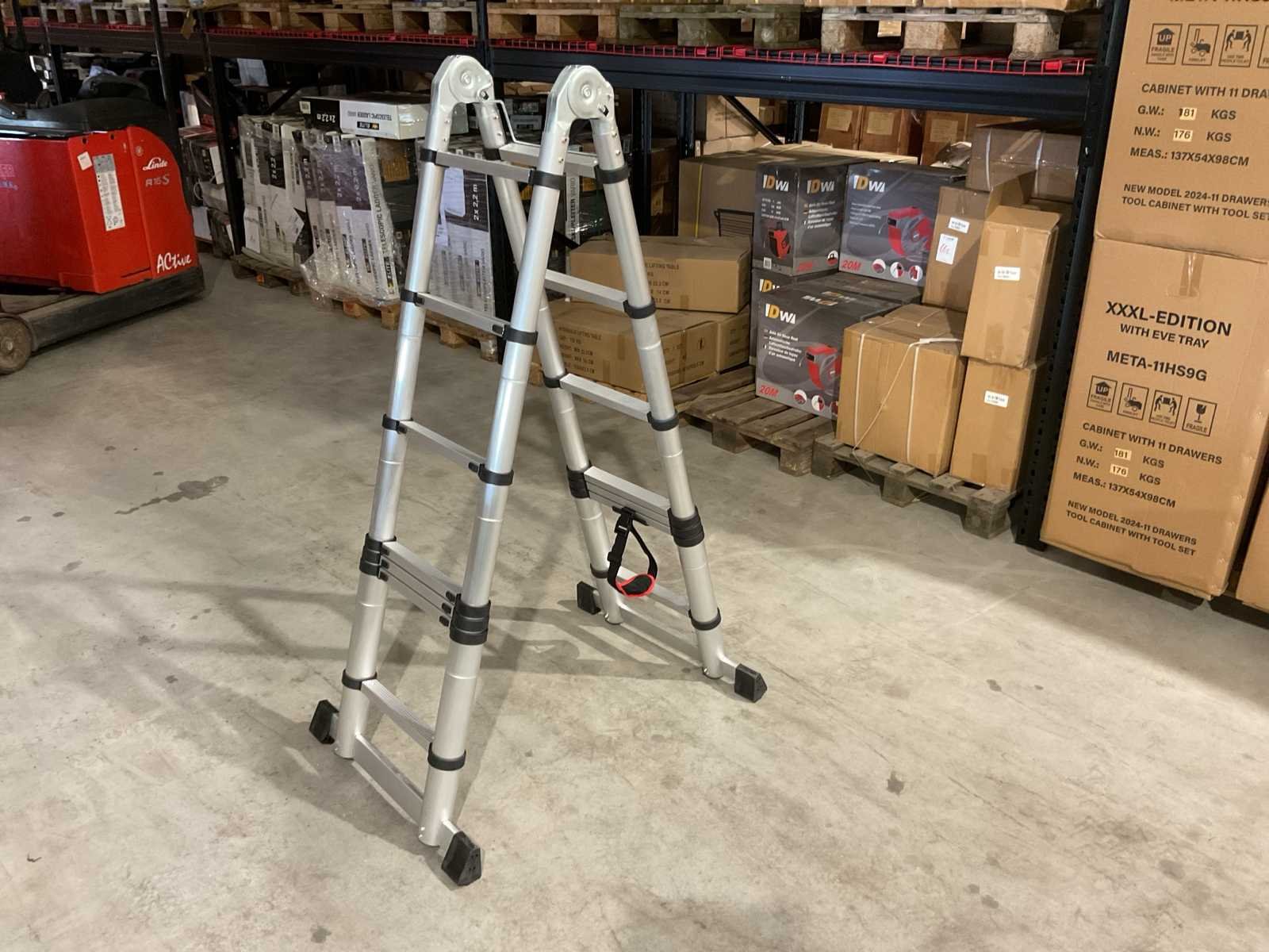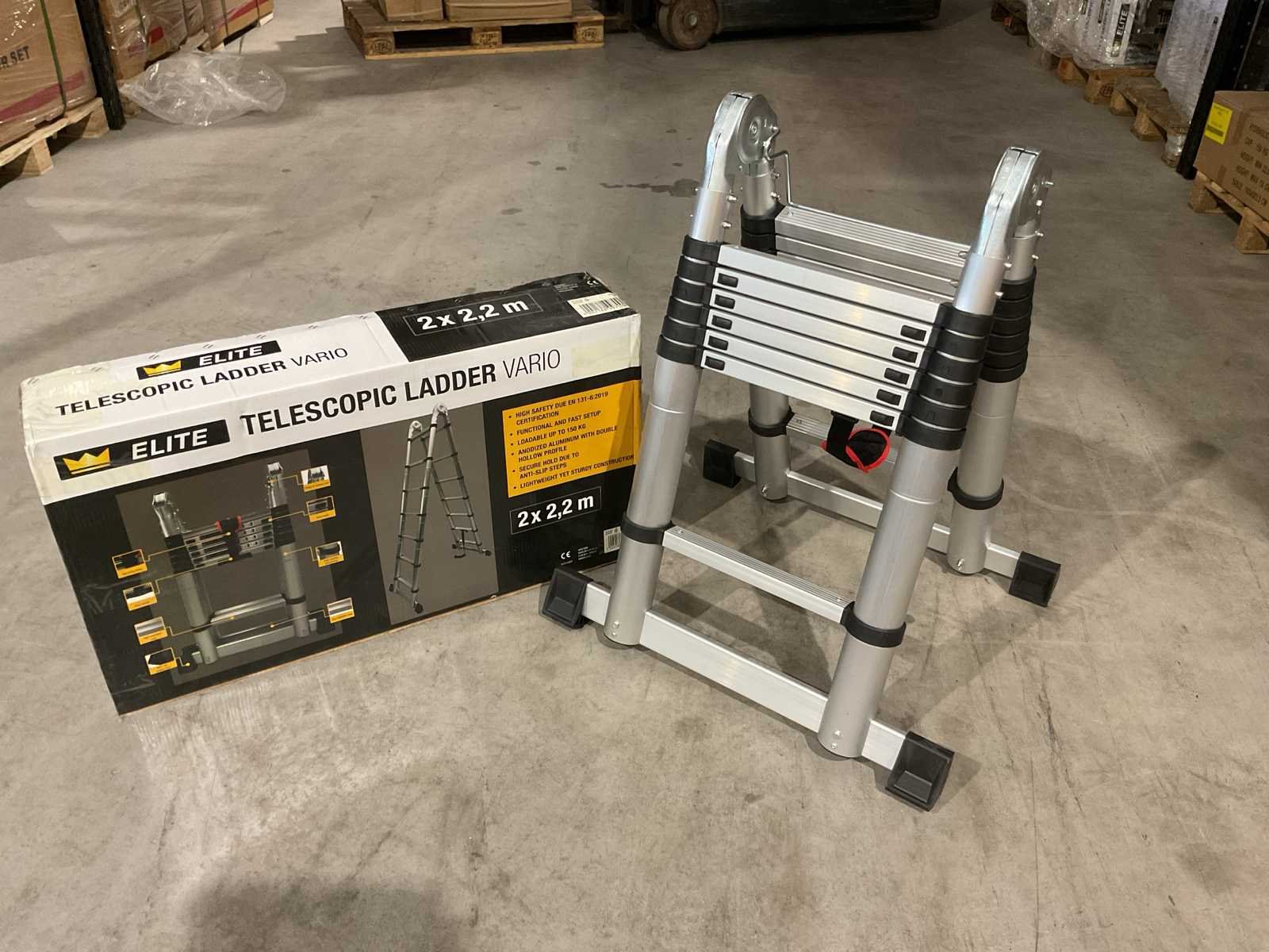 Voorzien van anti slip tredes; veiligheid band; ongebruikt in doos (transport afmetingen 90x50x20 cm) Merk: Elite Type: Vario 2x2,2 m Bouwjaar: 2025 Aantal treden: 16 Eigen gewicht: 18kg