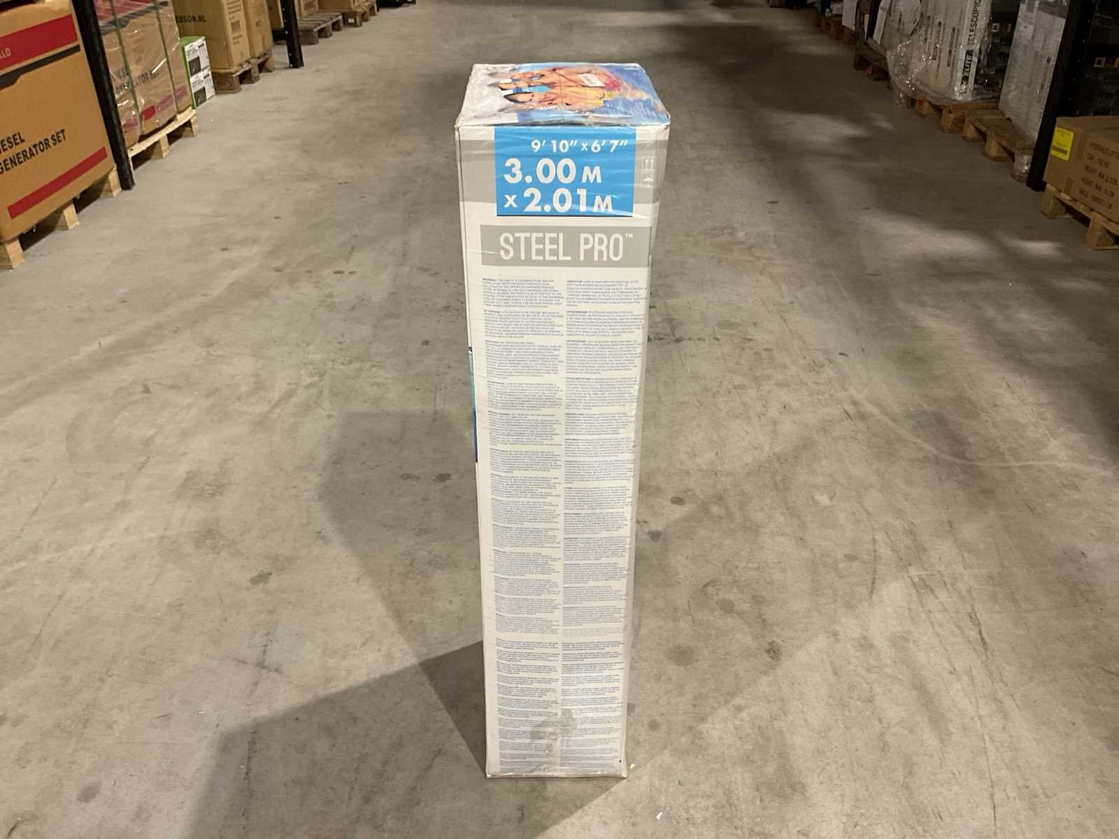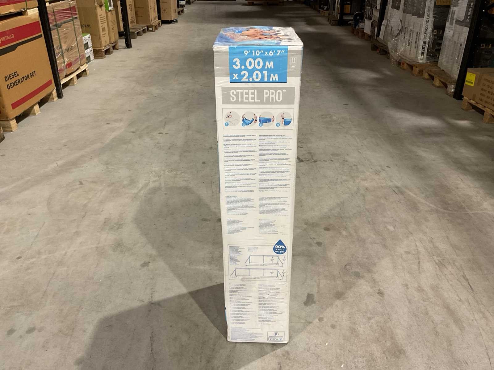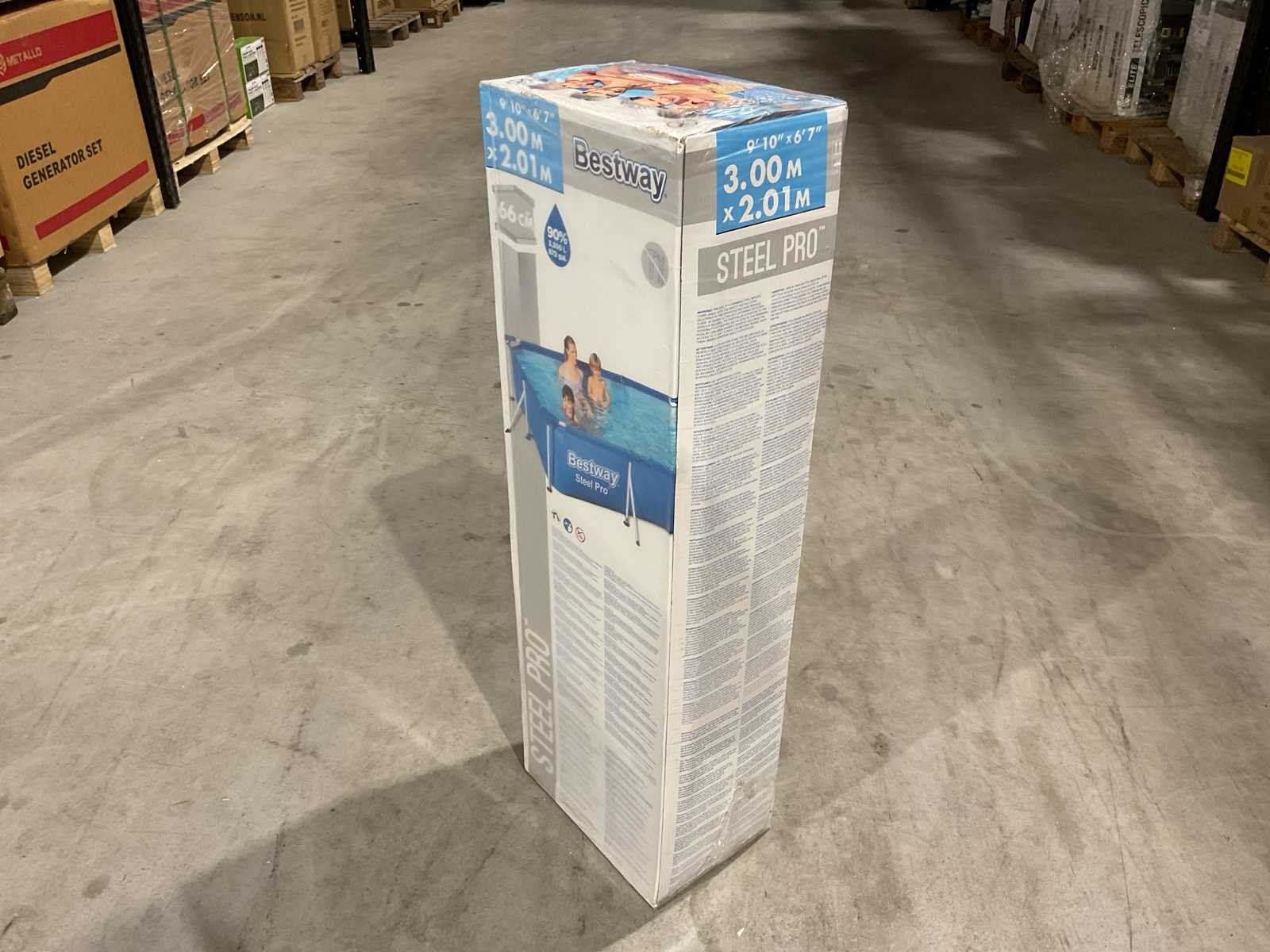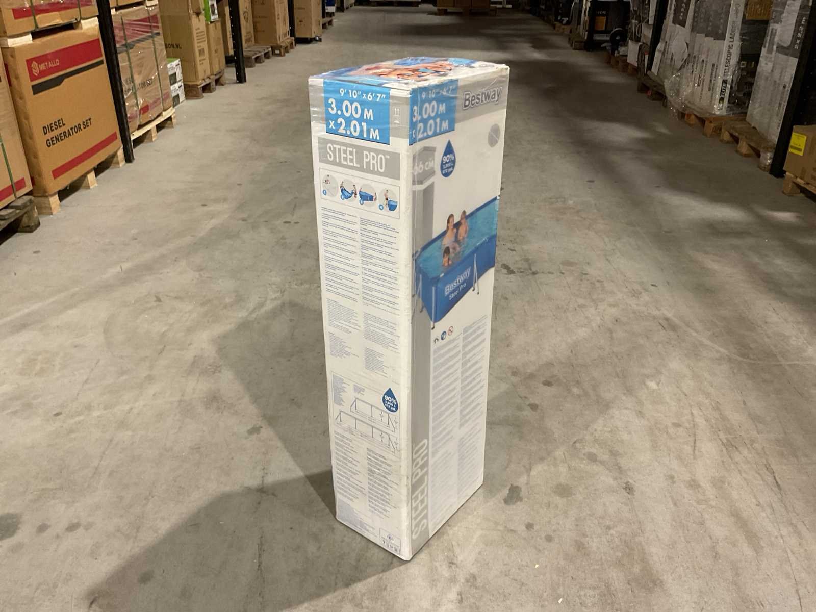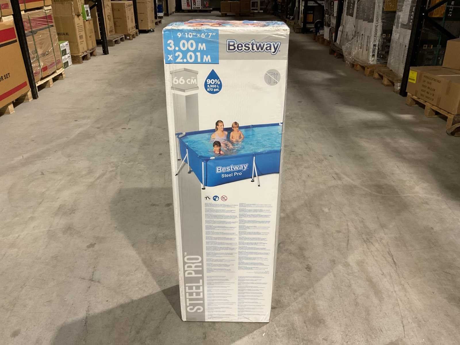 Voorzien van Opzetzwembad; 3-laags PVC met gerasterde polyester tussenlaag; Frame gepoedercoat staal; Vorm: Rechthoek; Inhoud 3300 liter; Aanbevolen waterdiepte (cm) 51; 3 persoons; Pompaansluiting (mm) 32; Lengte (cm) 300; Breedte (cm) 201; Buitenafmeting lxb (cm) 355x255; Hoogte (cm) 66; Dikte liner wand (mm) 0,56; Dikte liner bodem (mm) 0,50; Reparatieset; Ongebruikt in doos Merk: Bestway Model: 56404 steel pro Product type: 3M Kleur: Blauw Gewicht: 25.5kg Lengte: 35.6cm Breedte: 34cm Hoogte: 87.6cm