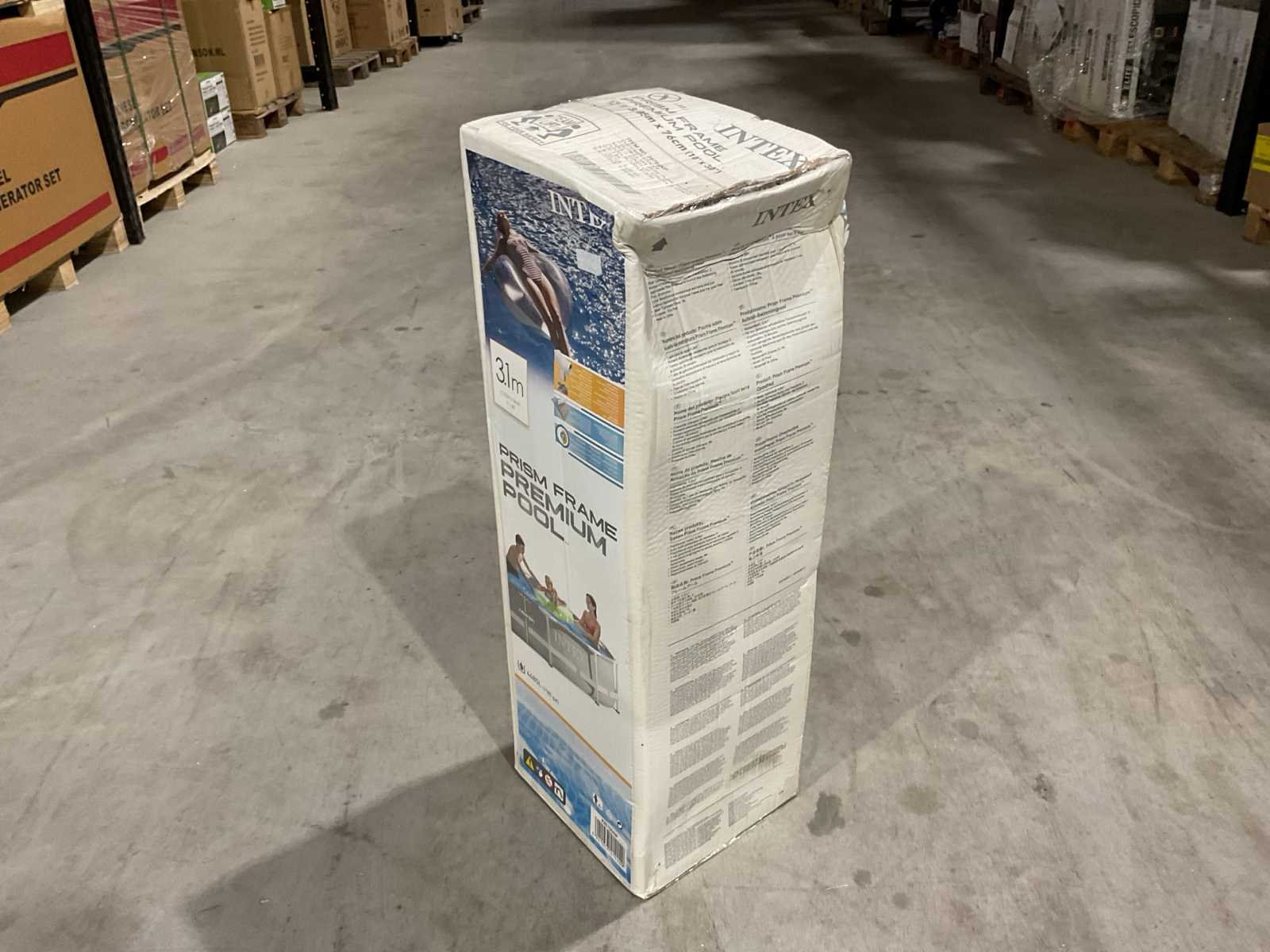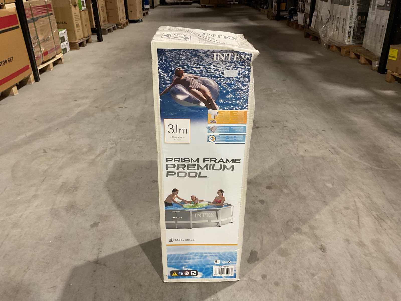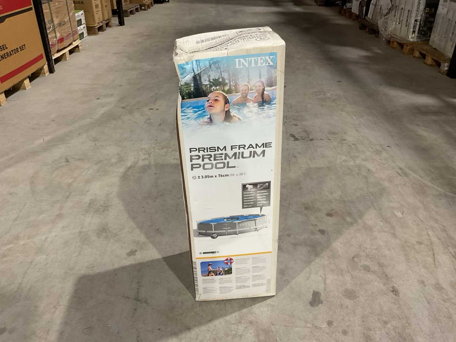 Voorzien van Opzetzwembad; 3-laags PVC met gerasterde polyester tussenlaag; Frame gepoedercoat staal; Vorm: Prism; Inhoud 4485 liter; Aanbevolen waterhoogte 61 cm; Pompaansluiting (mm) 32; Diameter (cm) 305; Hoogte (cm) 76; Dikte liner wand (mm) 0,50; Dikte liner bodem (mm) 0,32; Reparatieset; Ongebruikt in doos Merk: INTEX Model: 26700NP Prism Frame Premium Product type: 3,1m Kleur: Blauw Gewicht: 25.5kg Lengte: 35.6cm Breedte: 34cm Hoogte: 87.6cm Materiaal: Dubbelwandig PVC folie met gerasterde binnenlaag